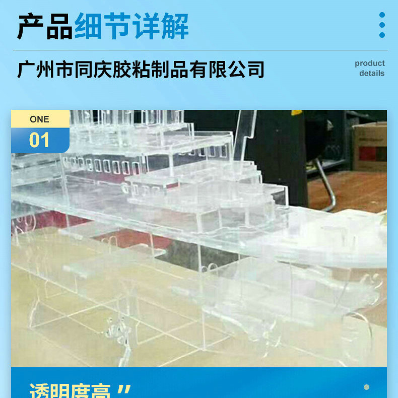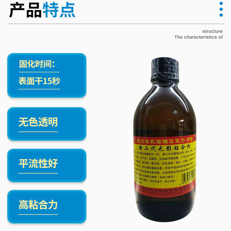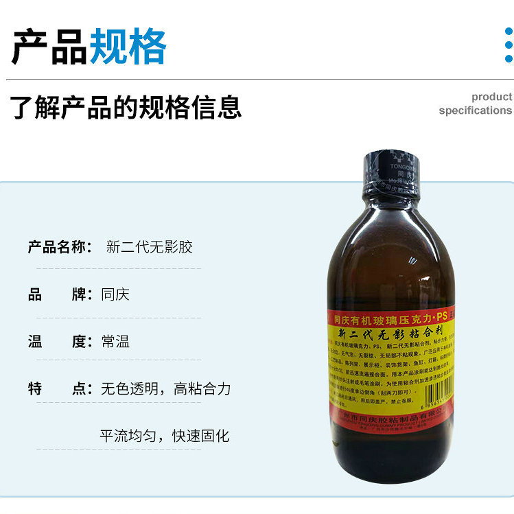 同庆有机玻璃压克力、PS、新二代无影粘合剂,粘合力强、无色透明、无气味、无白边、无气泡、无裂纹、无局部不粘现象。应用于有机玻璃、压克力、PS、工艺制品、陈列架、展示柜、装饰货架、鱼缸、灯箱、标牌的粘合。粘合流动快且十分均匀,能迅速流遍接合面。用本产品涂刷能达到抛光效果。