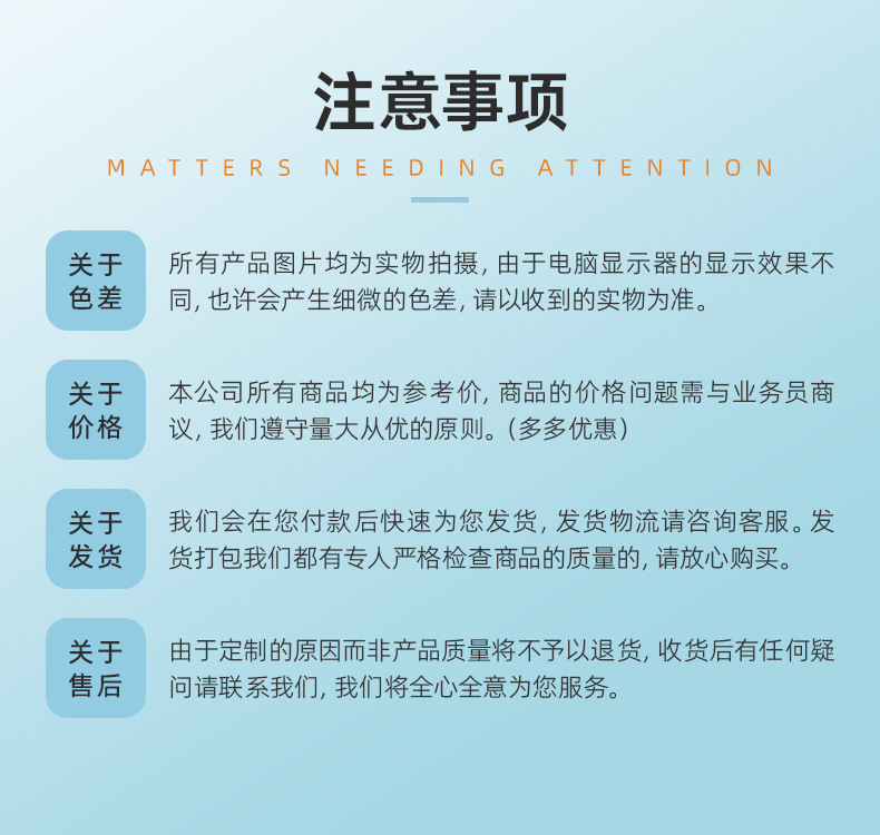 고객님, 저희 쇼핑몰은 중국 1688 플랫폼을 기반으로 한 구매대행 서비스를 제공합니다. 이는 고객님의 요청에 따라 해외 상품을 대신 주문하고 수입·배송해드리는 방식이며, 저희는 상품의 판매자가 아닌 구매를 대행하는 역할을 수행합니다. 이에 따라 아래와 같은 특수한 정책이 적용되며, 꼭 숙지하신 후 주문해 주시기 바랍니다.