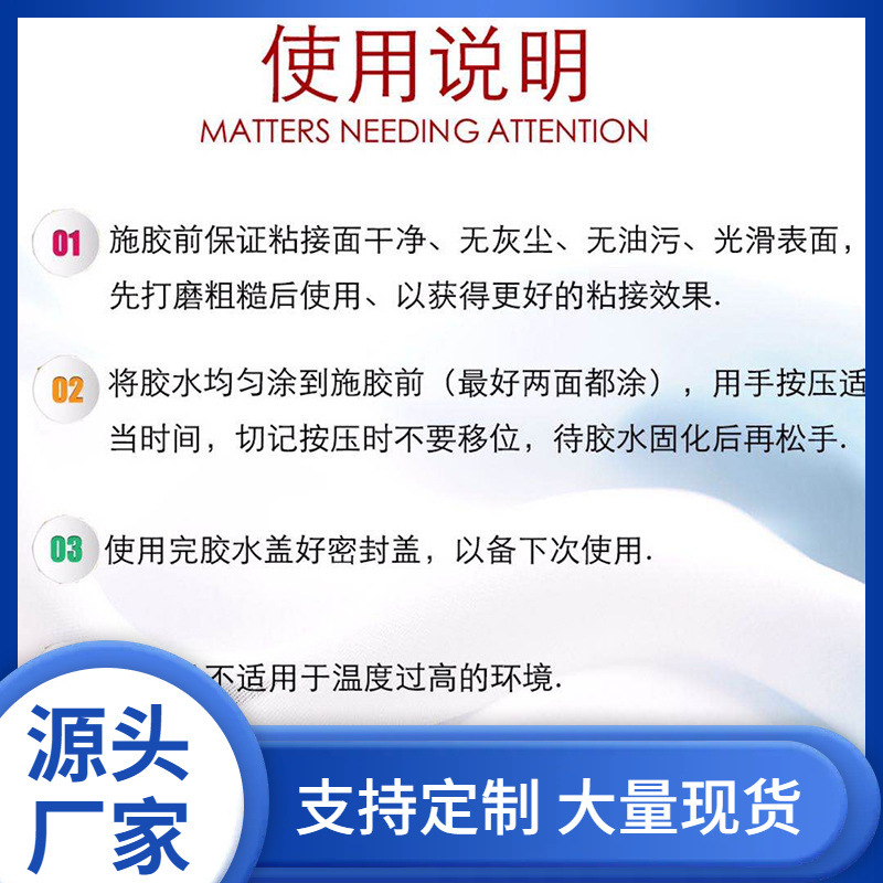2、本品适合于金属、陶瓷、电子行业、假发制作、工艺品等对胶水颜色有特殊要求的行业;