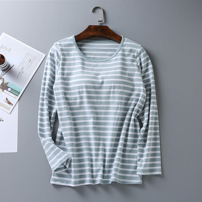 가슴 패드가있는 코튼 스트라이프 가을 재킷 착용 프리 브라 긴팔 편안한 잠옷 아웃웨어 홈 봄 가을 의류 여성용