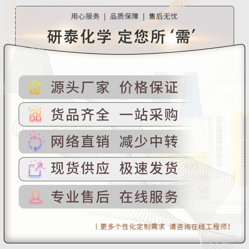 研泰化学技术有限公司秉承“质量为基石头,诚信为根本,市场为导向,创新求发展”的经营理念,不断强化公司团队建设和产品技术革新,力求为客户提供优质的产品和服务,为“中国创造”做出应有的贡献,致力成为国内优秀的胶粘剂解决方案提供商。如果您也有胶水粘接难题,可以通过来电、留言、在线客服、邮件等方式联系我们,研泰将为您提供1V1技术服务支持,敬候您的垂询。