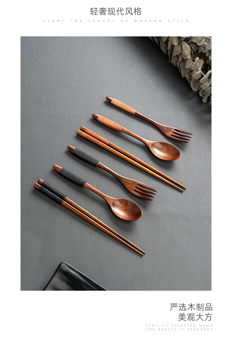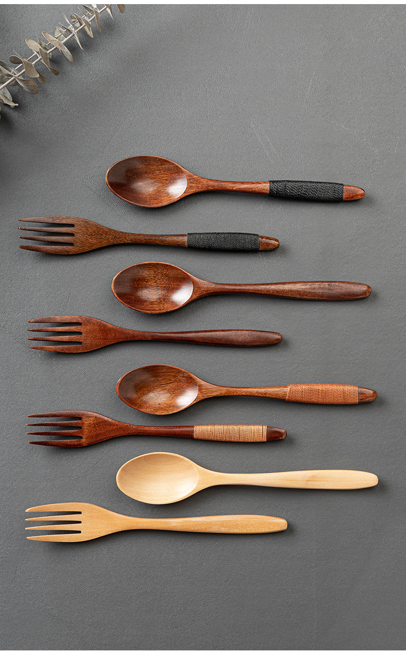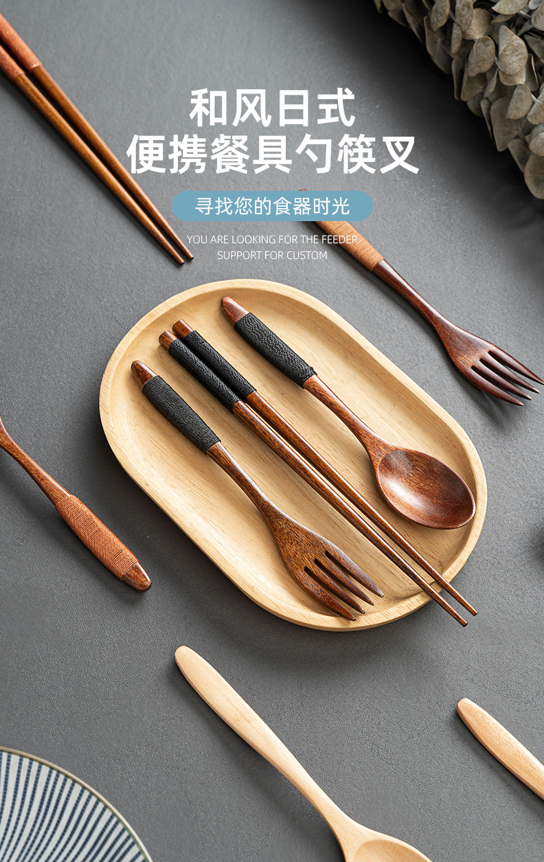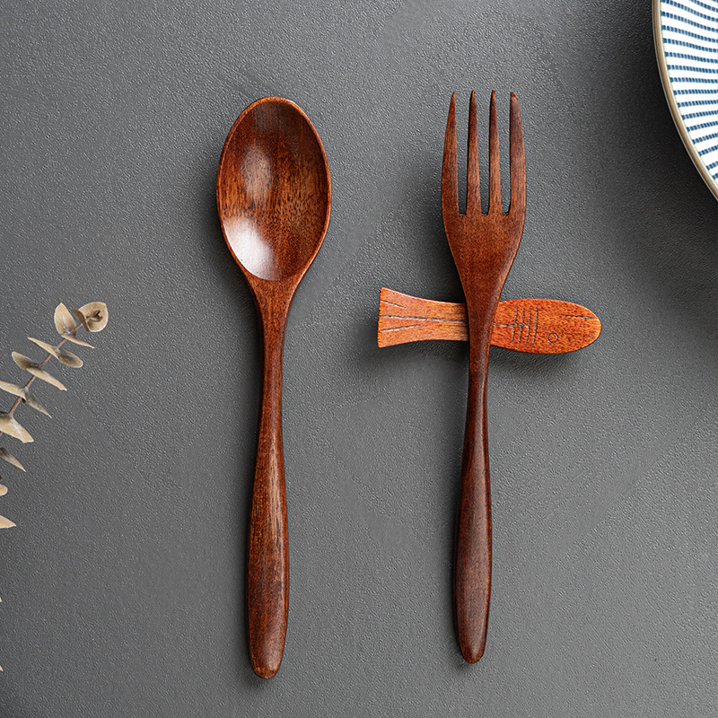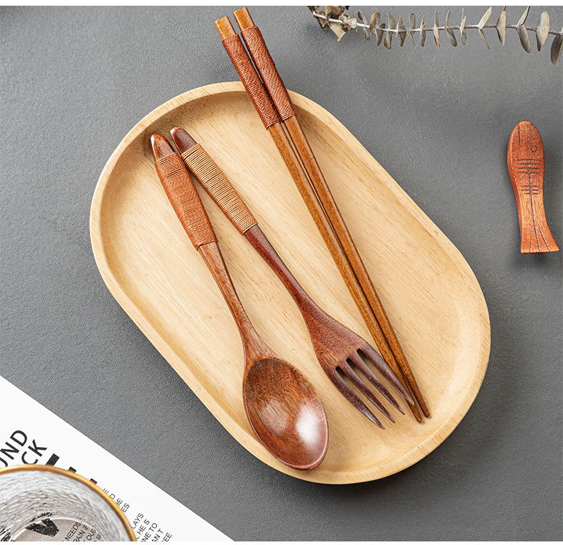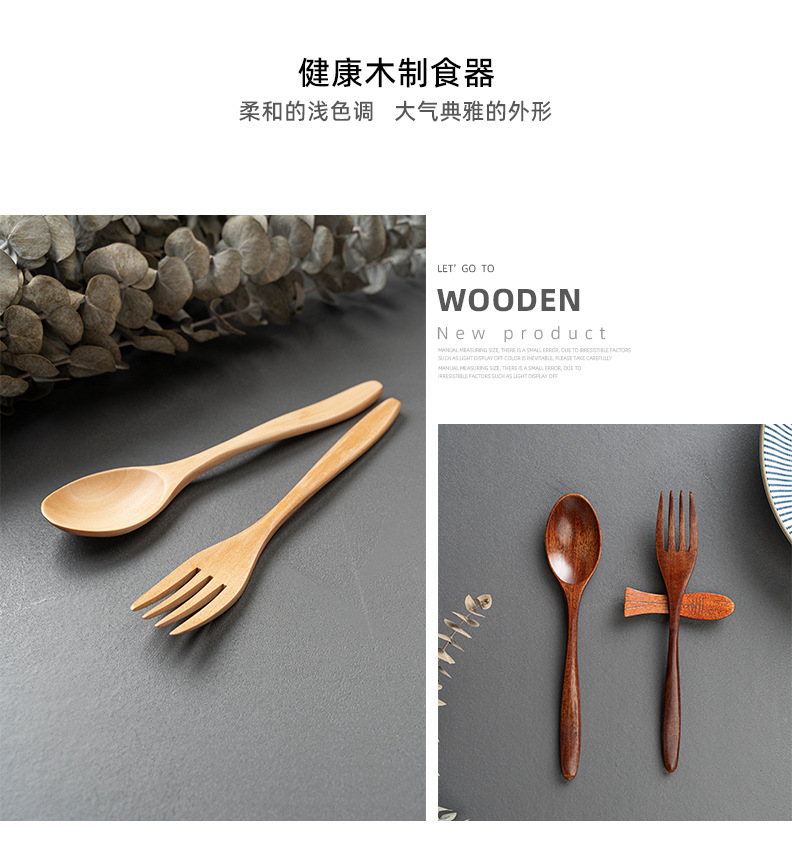 일본식 나무 식기 스푼 포크 젓가락 나무 숟가락 3 종 세트 긴 손잡이 커플 어린이 포크 스푼 젓가락 휴대용 식기