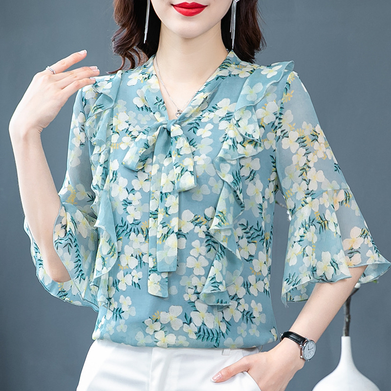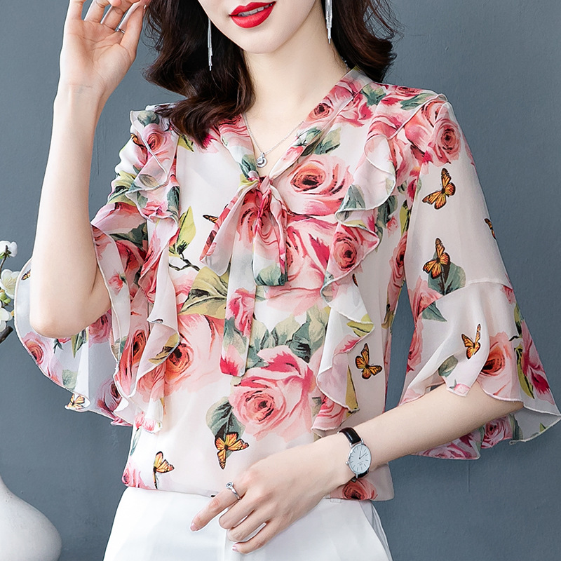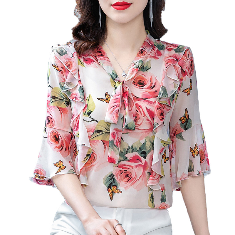 중년 루즈한 쉬폰 셔츠 여성용 반팔 2021 년 새로운 패션 플로럴 탑 슬림 배꼽 커버 연령 감소 셔츠