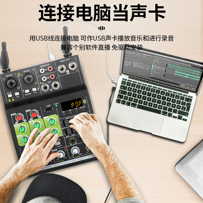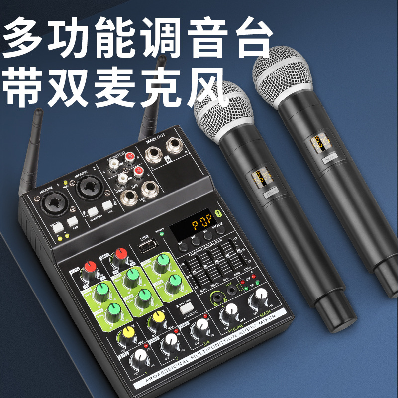 무선 마이크가있는 크로스 보더 4 방향 믹서 컴퓨터 사운드 카드 녹음 소형 라이브 USB Bluetooth 리버브 마이크