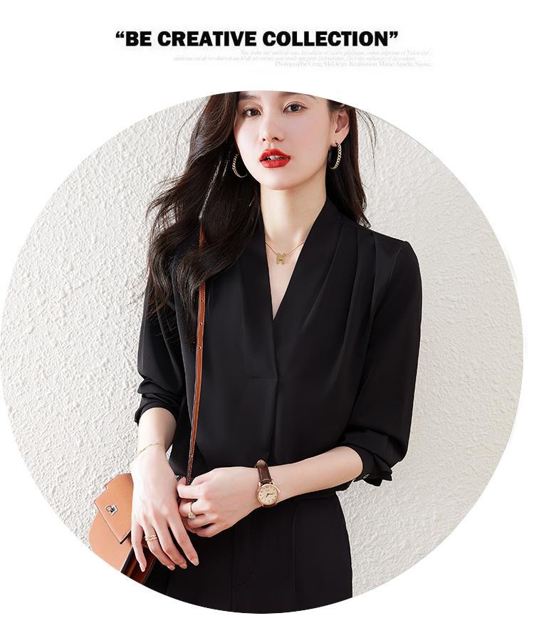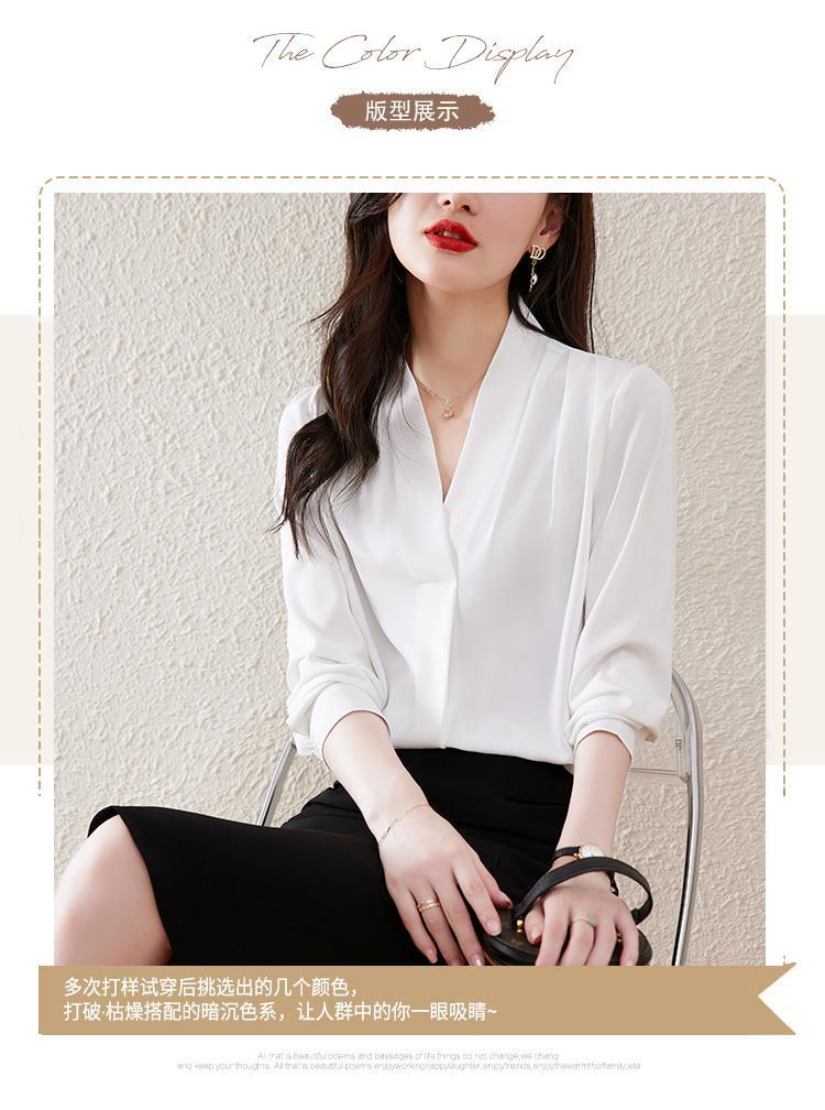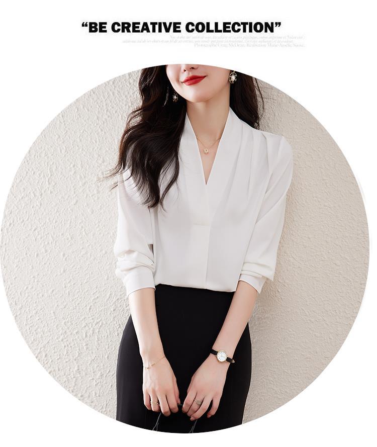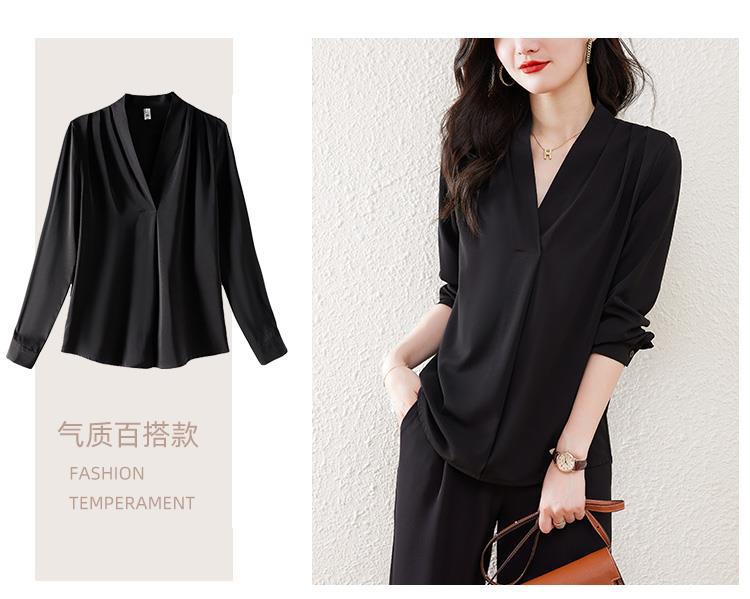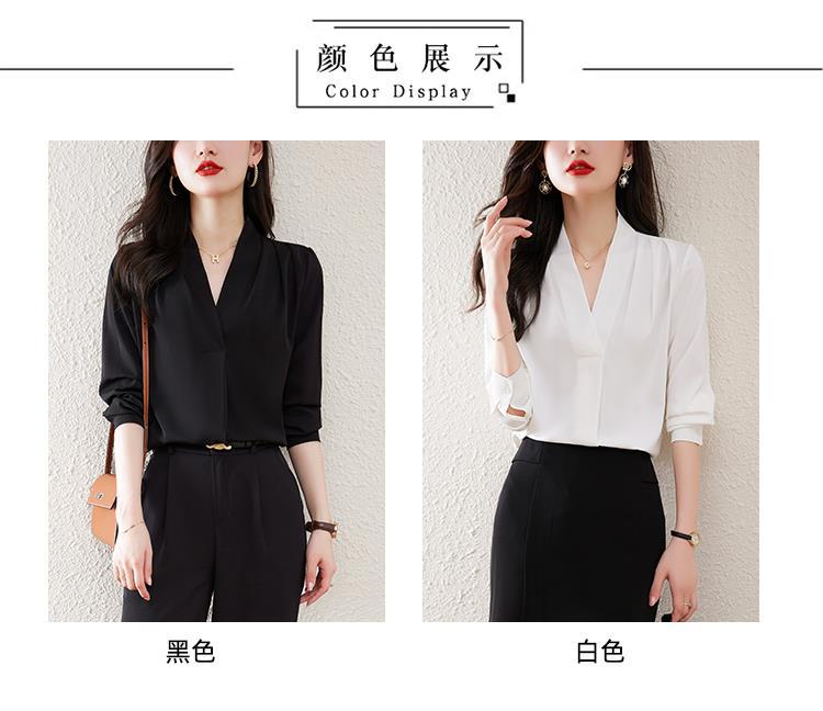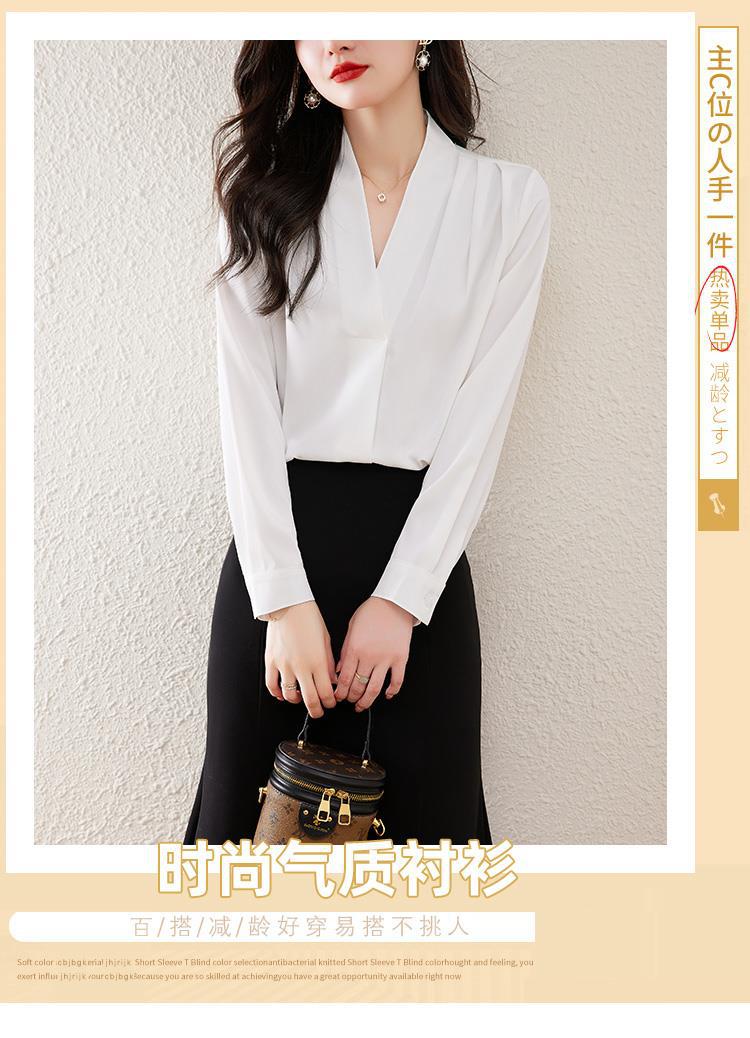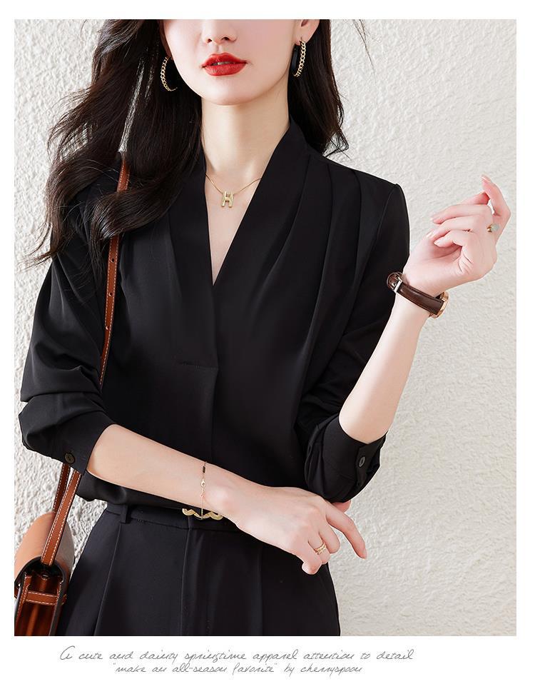 실제 사진 디자인 2024 새로운 V 넥 긴팔 기질 셔츠 시폰 솔트 셔츠 여성 게으른 스타일 솔리드 컬러 탑
