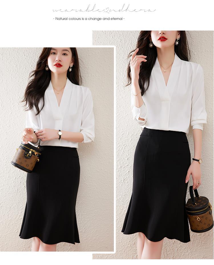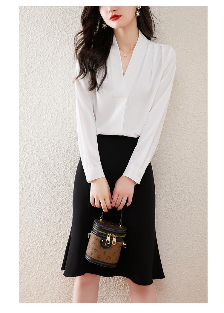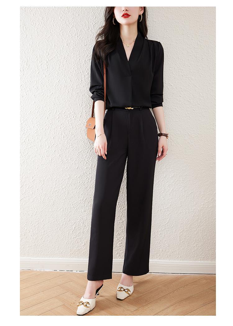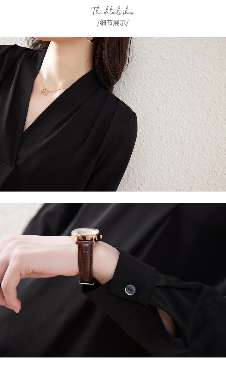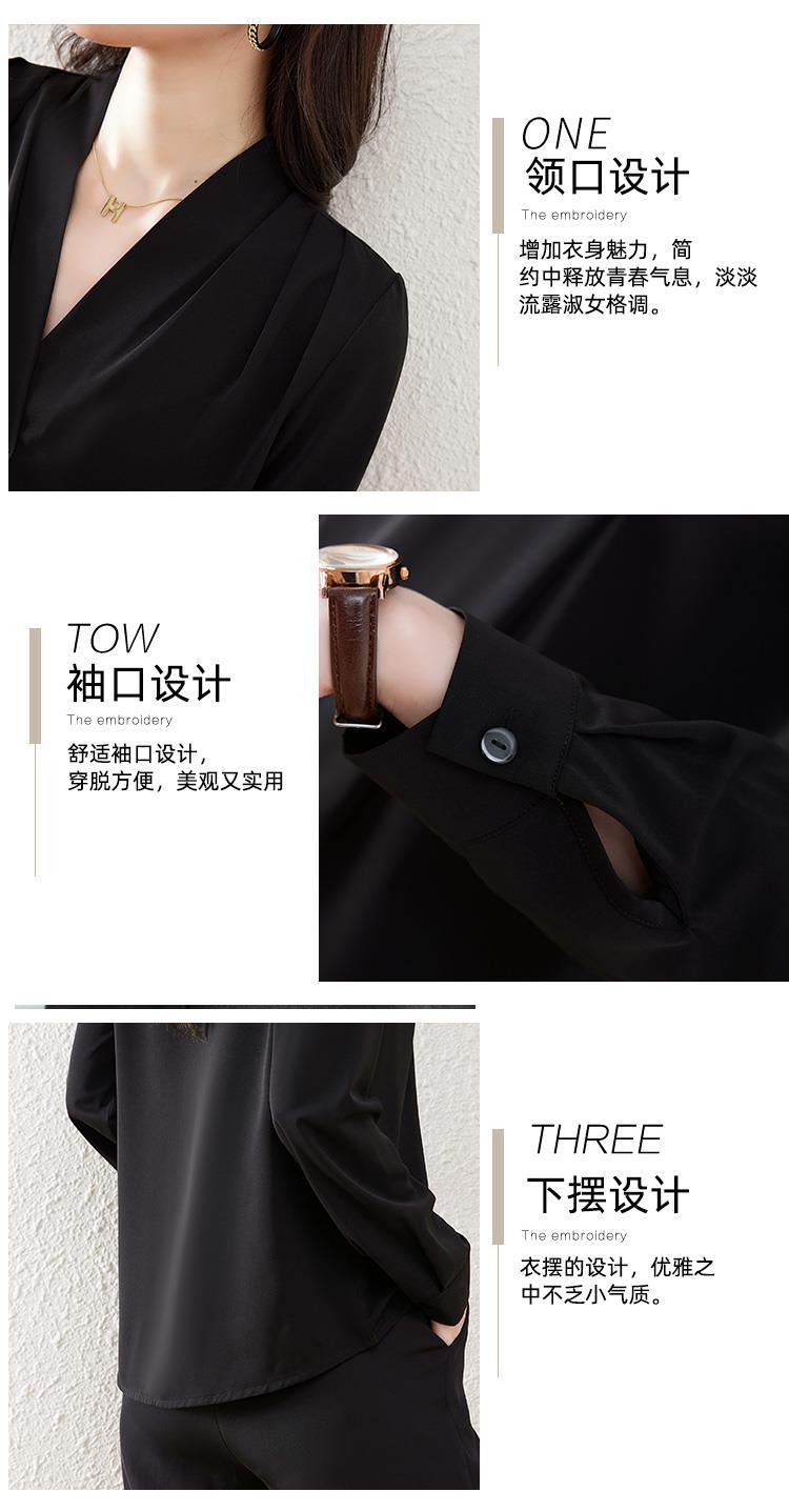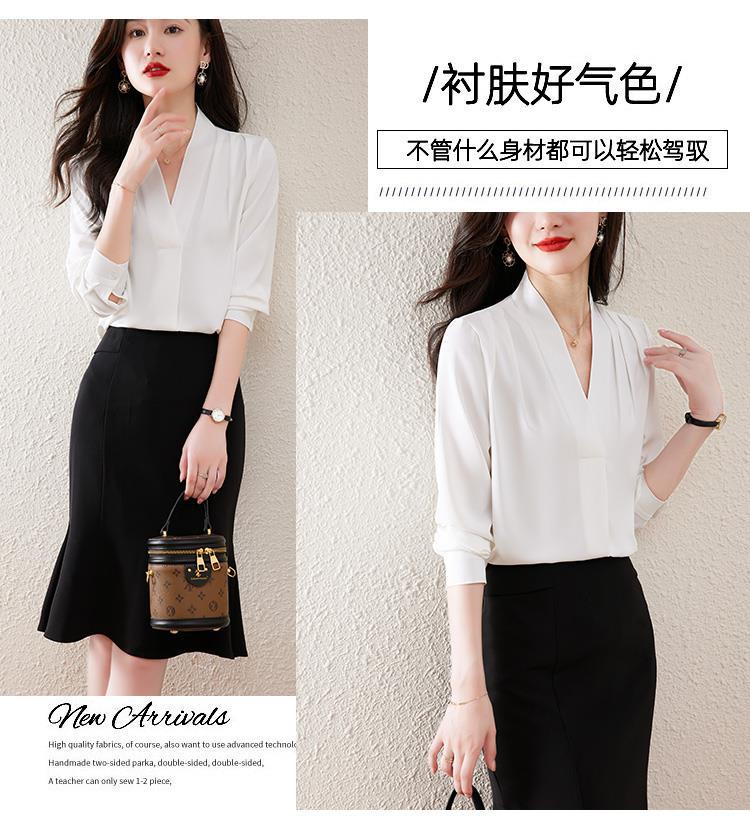 실제 사진 디자인 2024 새로운 V 넥 긴팔 기질 셔츠 시폰 솔트 셔츠 여성 게으른 스타일 솔리드 컬러 탑