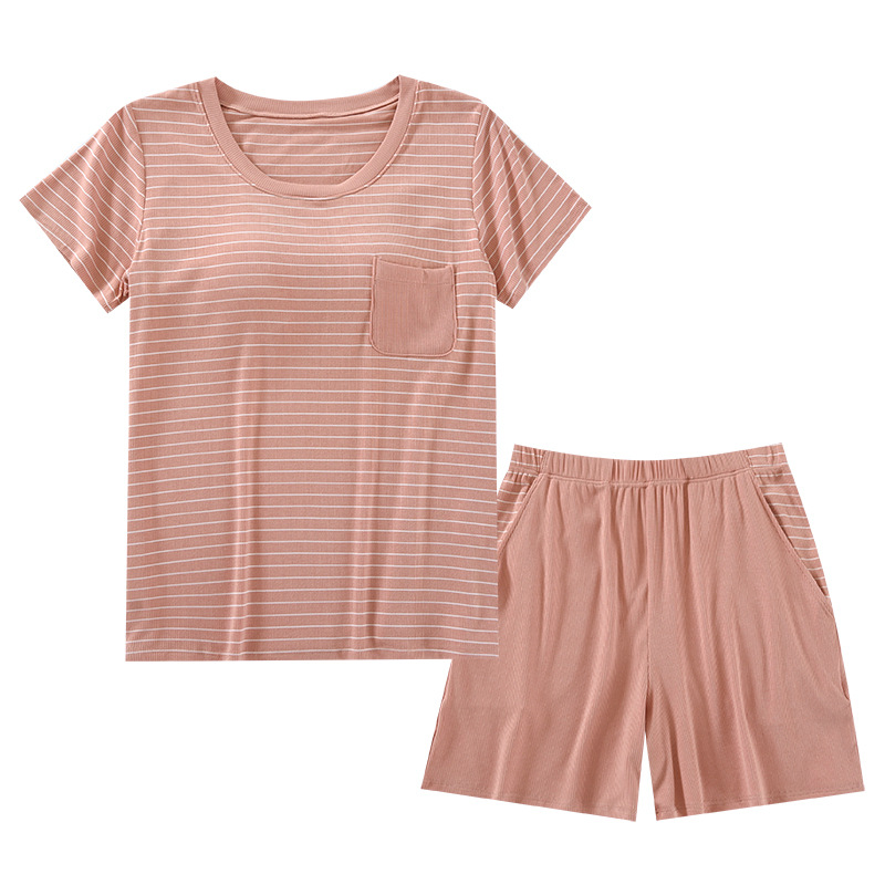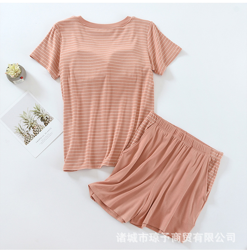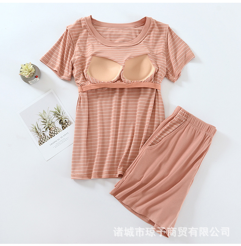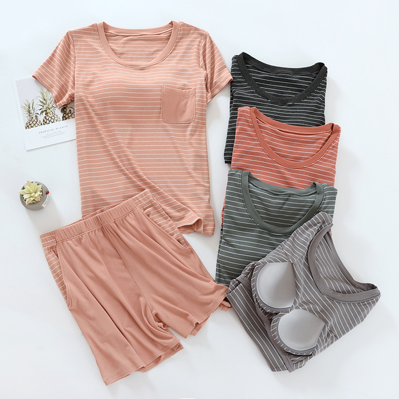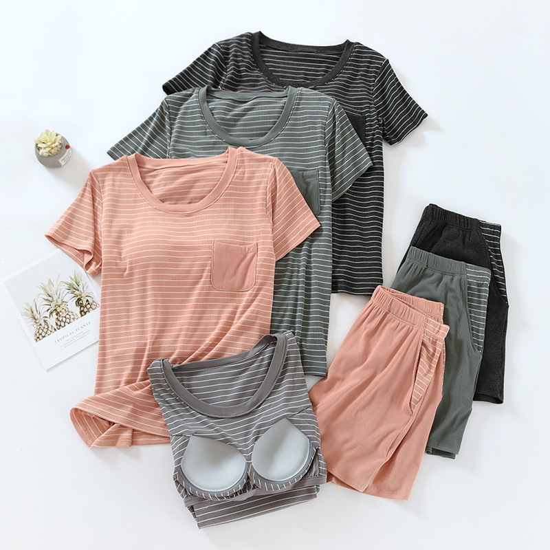 착용 없는 브래지어 가정복 반팔 세트 여성용 여름 라운드 넥 스트라이프 가슴 패드 가정복 반바지 투피스 세트