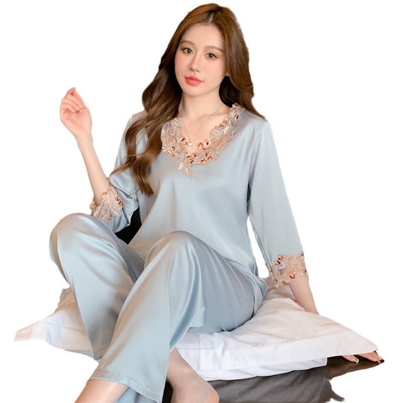 잠옷 여자의 봄과 가을 실키 새틴 긴 소매 여자의 잠옷 가정 옷 세트 섹시한 다채로운 레이스 하이 엔드 감각