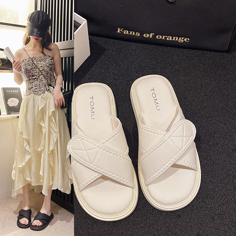 슬리퍼 여성용 여름 겉옷 새로운 유행 모든 매치 크로스 벨트 플랫 두꺼운 바닥 미끄럼 방지 레트로 부드러운 바닥 슬립온 슬리퍼