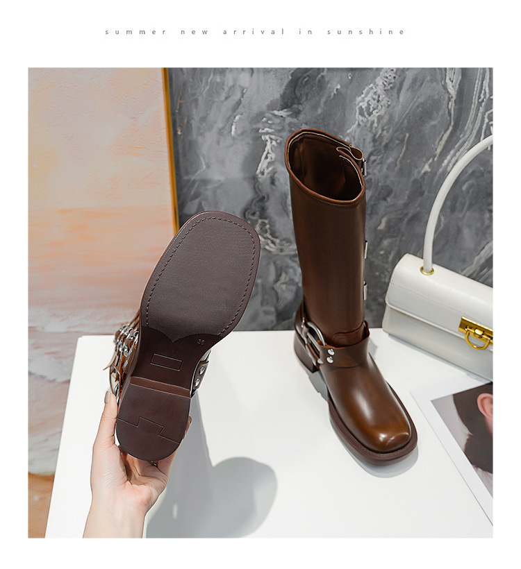 Miu * 캣워크 벨트 버클 두꺼운 힐 마틴 부츠 여성 봄과 여름 정품 가죽 복고풍이지만 무릎 긴 부츠 웨스턴 부츠