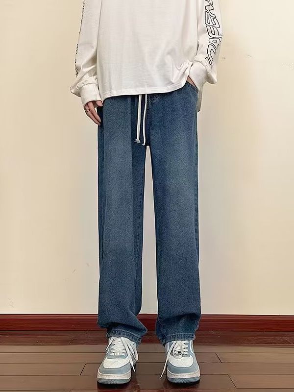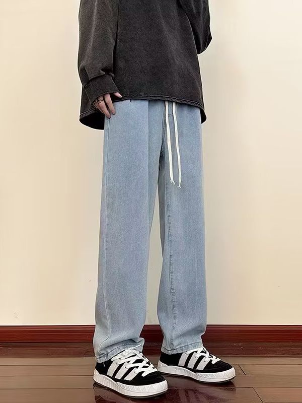 봄과 여름 소년 청바지 남성용 스트레이트 레그 루즈한 팬츠 캐주얼 신축성 허리 레이스 업 십대 고등학교 중학생