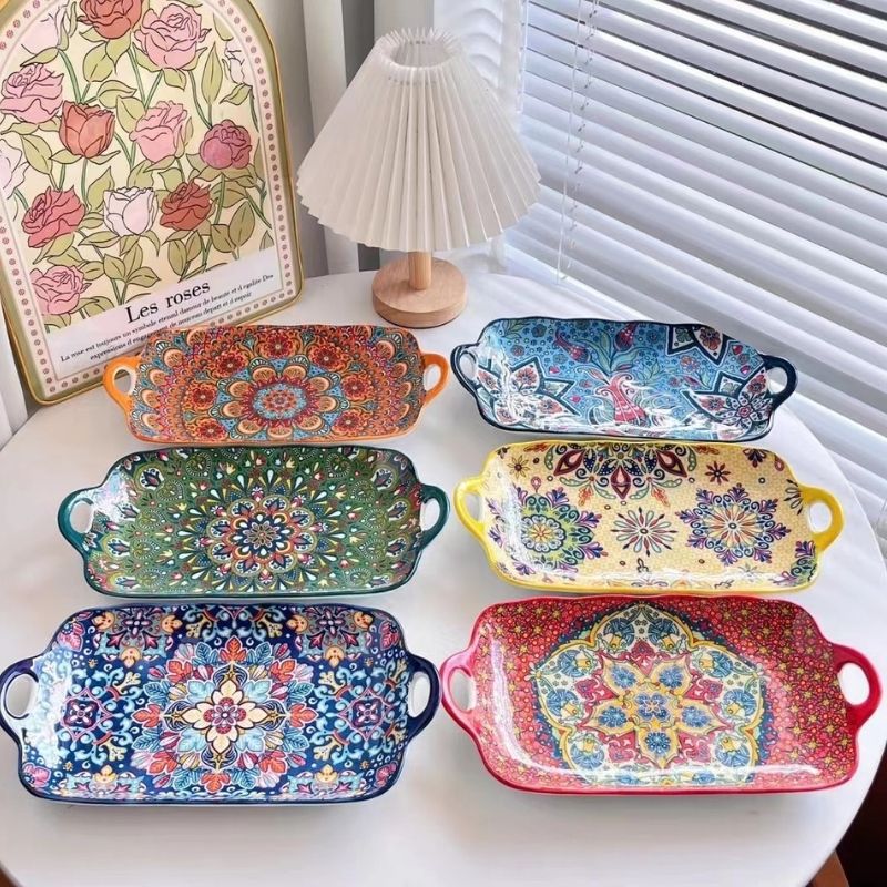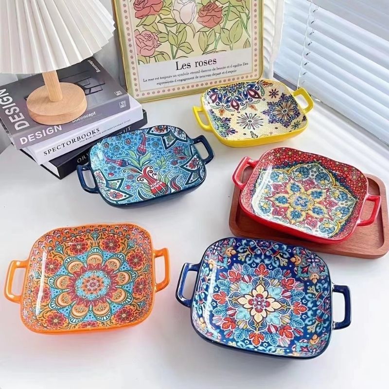 보헤미안 스타일 이중 손잡이 도자기 접시, 언더글레이즈 컬러 세라믹 식기, 대형 사각 생선 접시, 가정용 전자레인지 접시, 라이트 럭셔리
