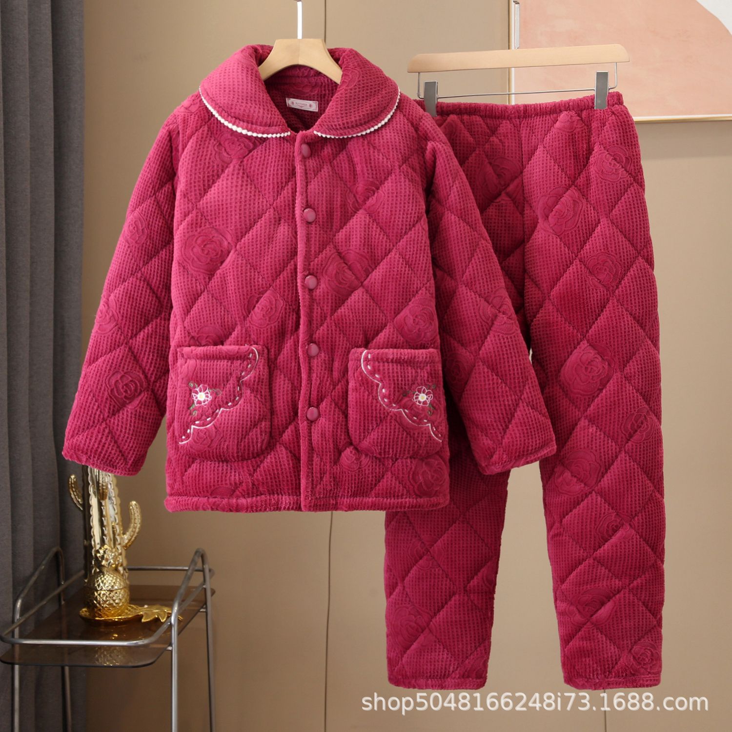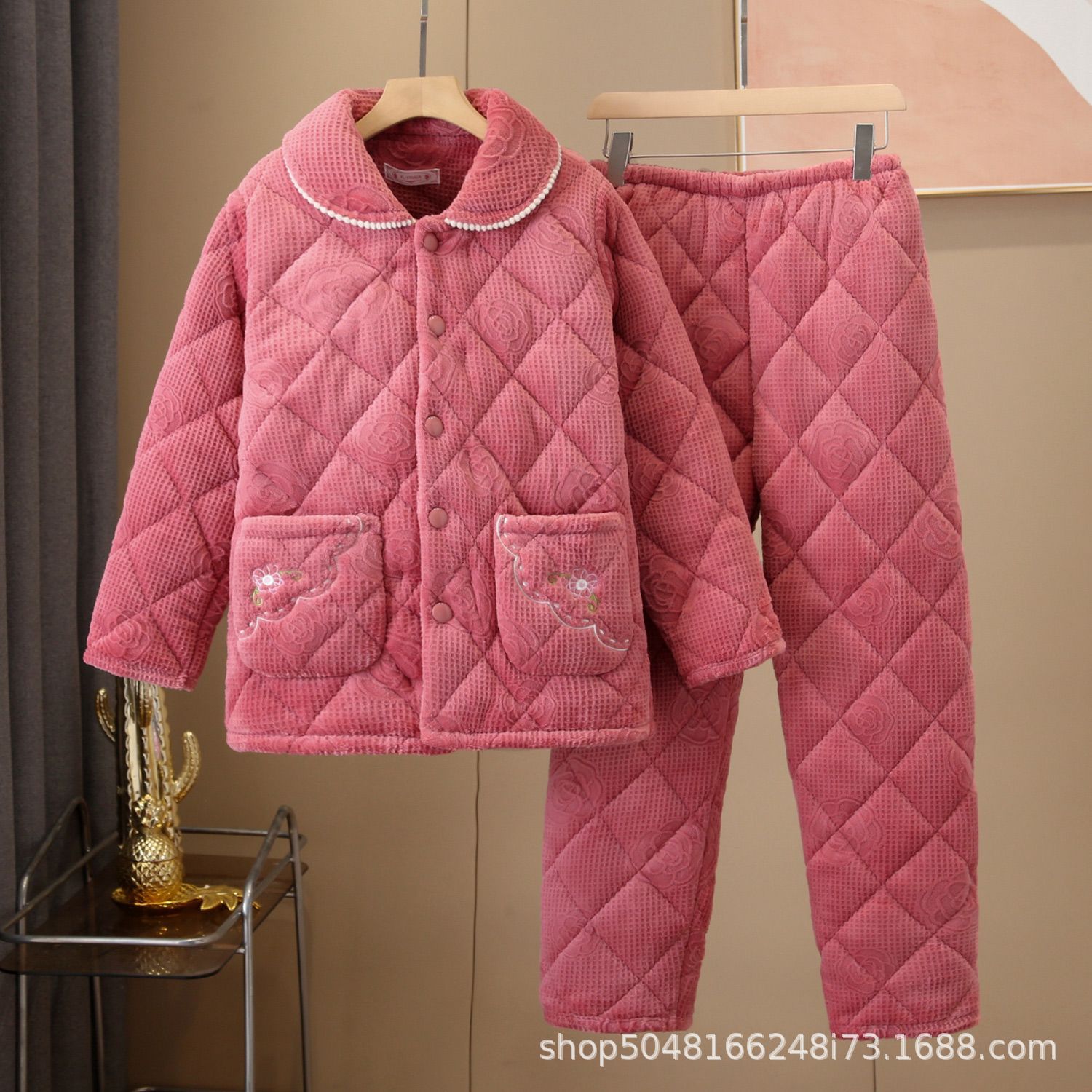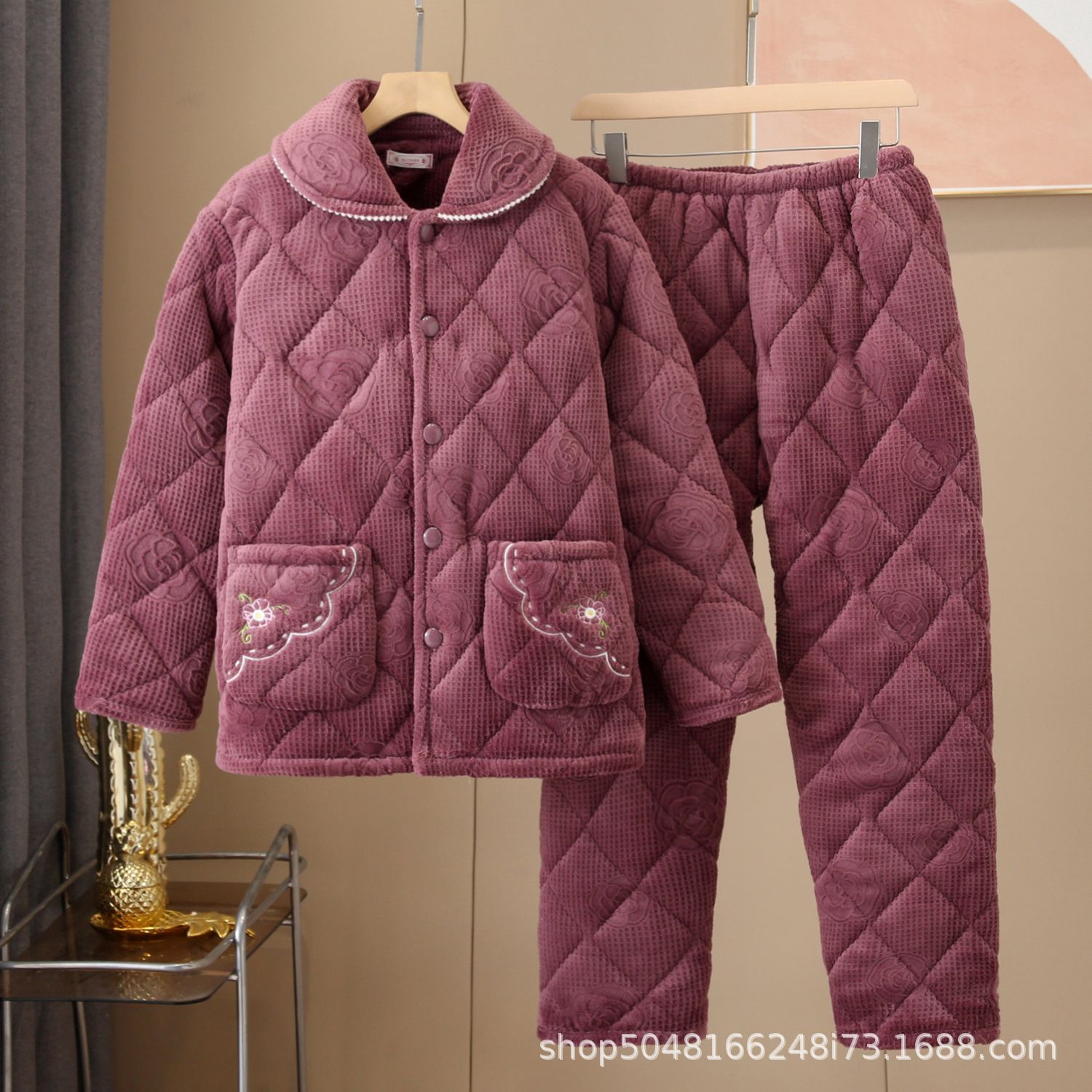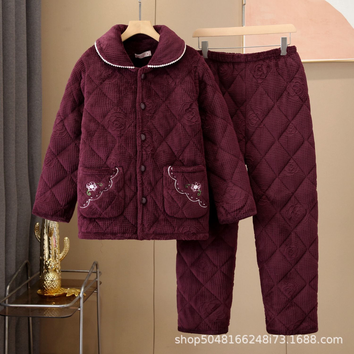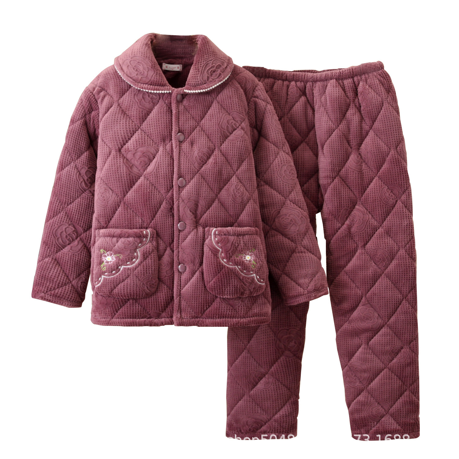 겨울철 중노년층을 위한 따뜻하고 편안한 겨울용 3중 두꺼운 플란넬 누빔 잠옷, 엄마들을 위한 특별히 두꺼운 플리스 안감 잠옷