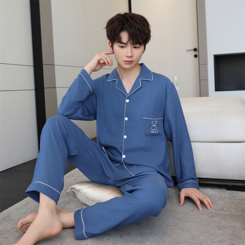 봄과 가을 구름 면 잠옷 남자의 카디건 얇은 긴 소매 바지 옷깃 세트 만화 복장