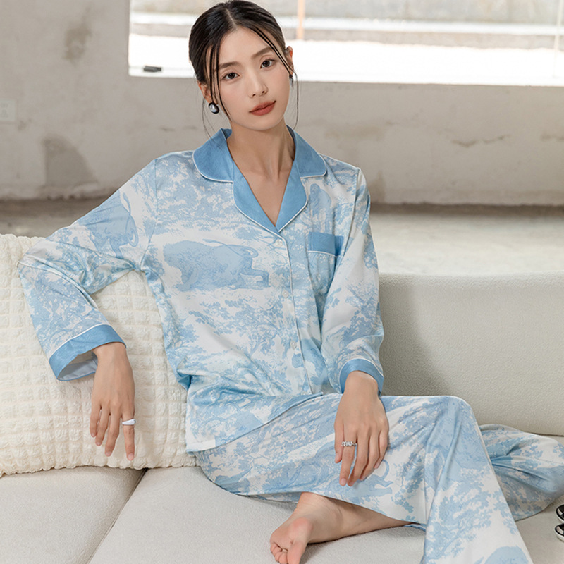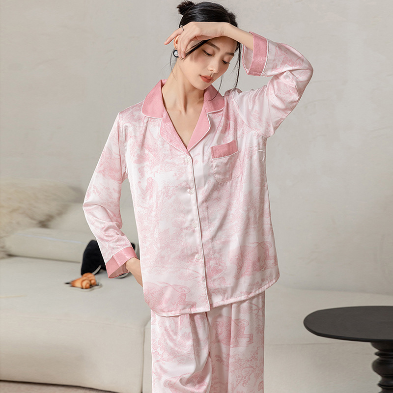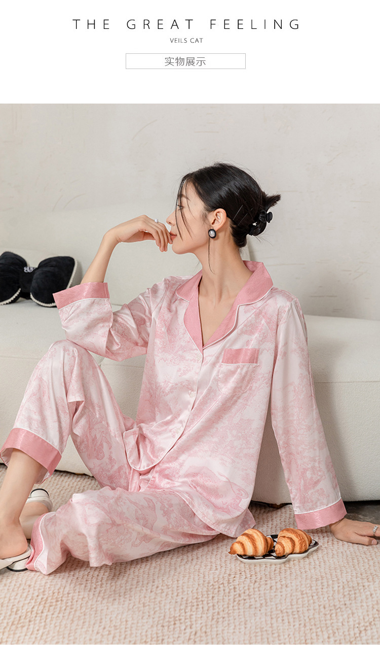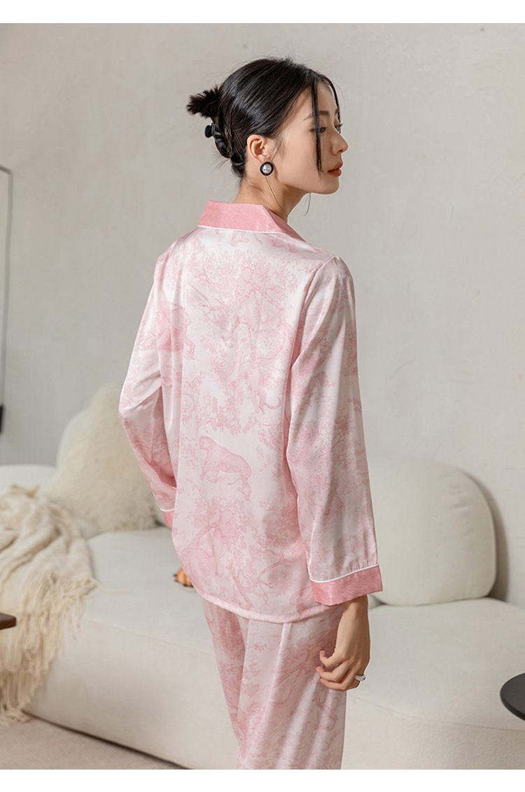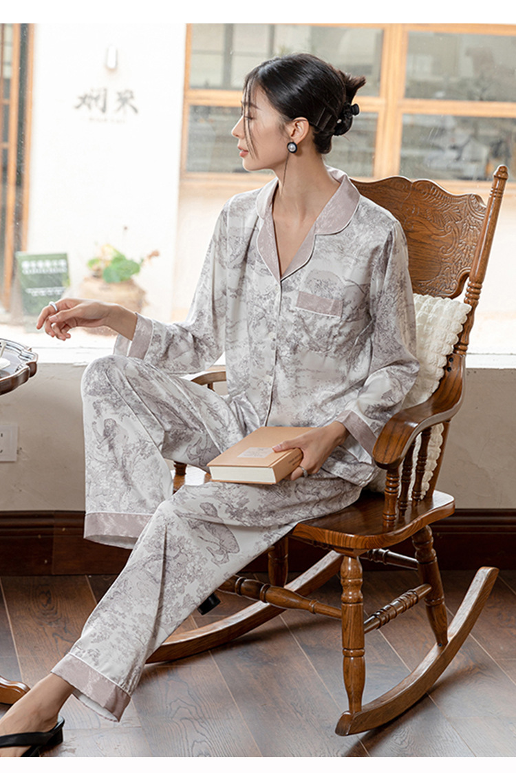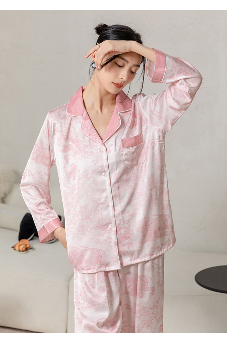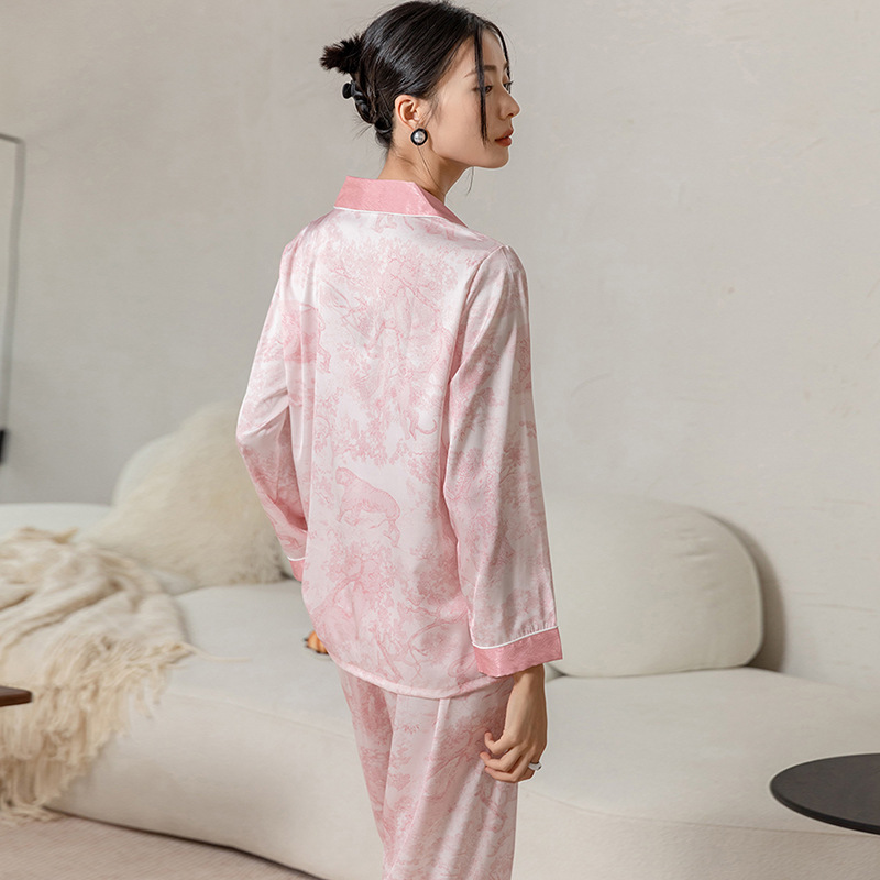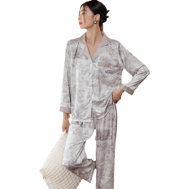 잠옷 여성의 봄과 가을 아이스 실크 얇은 긴팔 바지 투피스 세트 옷깃 카디건 실크 홈 의류