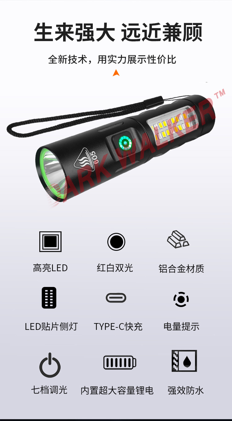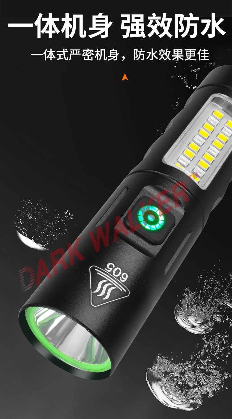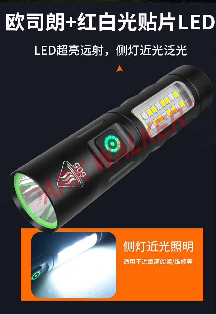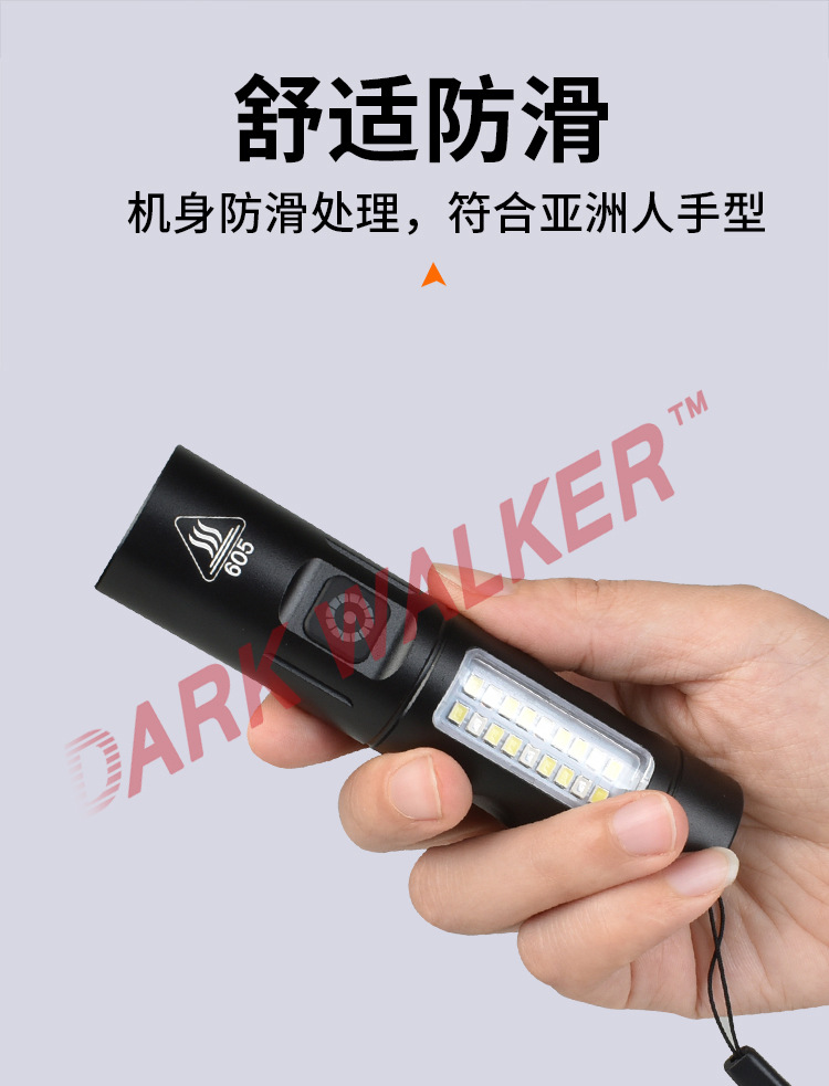 국경 새로운 강한 빛 손전등 LED 강한 빛 비상 손전등 사이드 라이트 고정 초점 미니 손전등으로 USB 충전