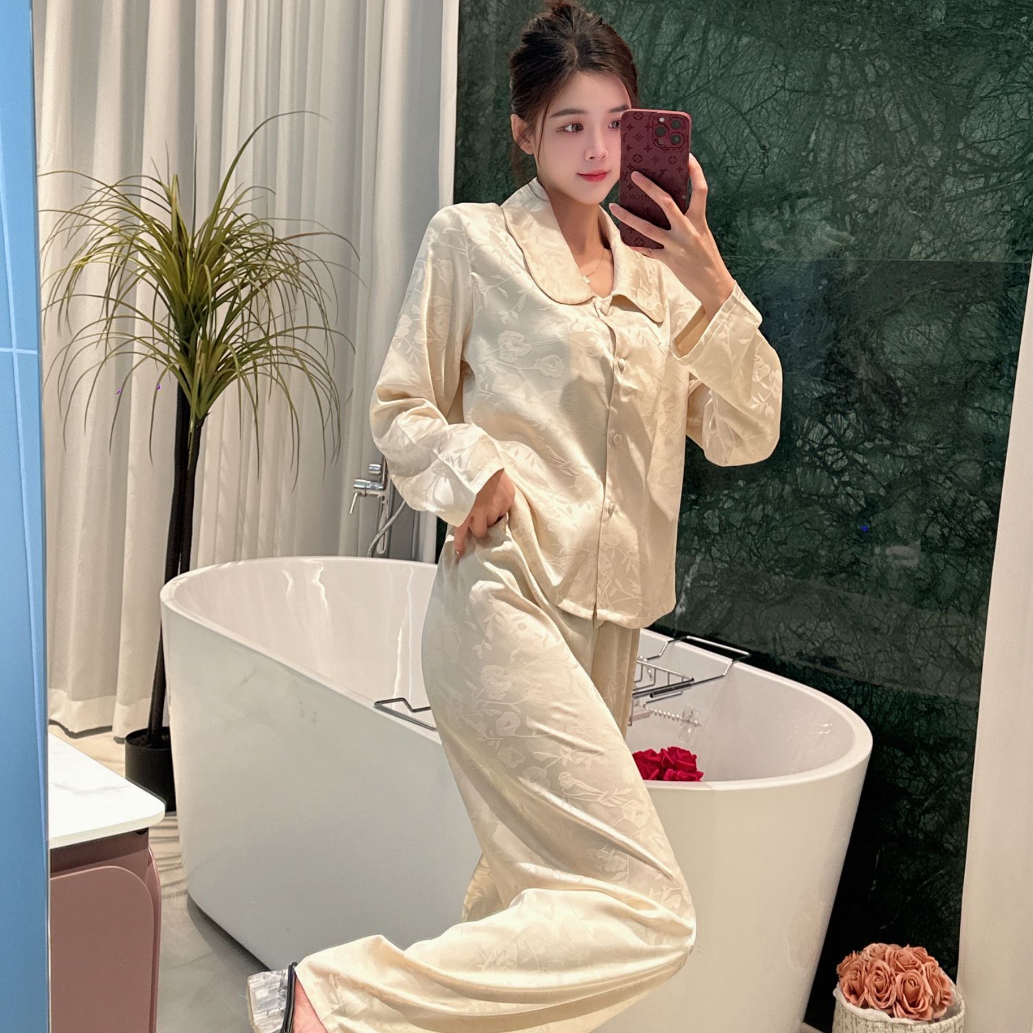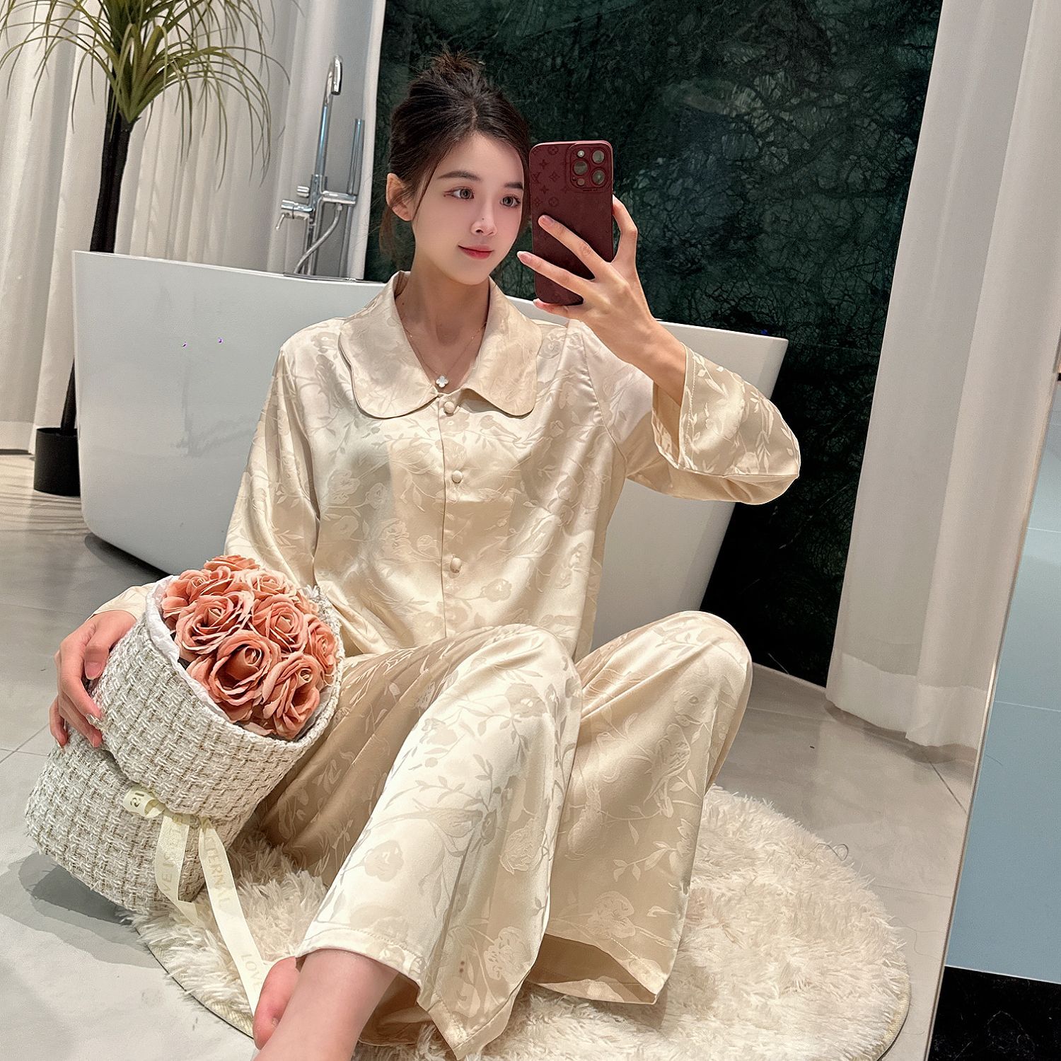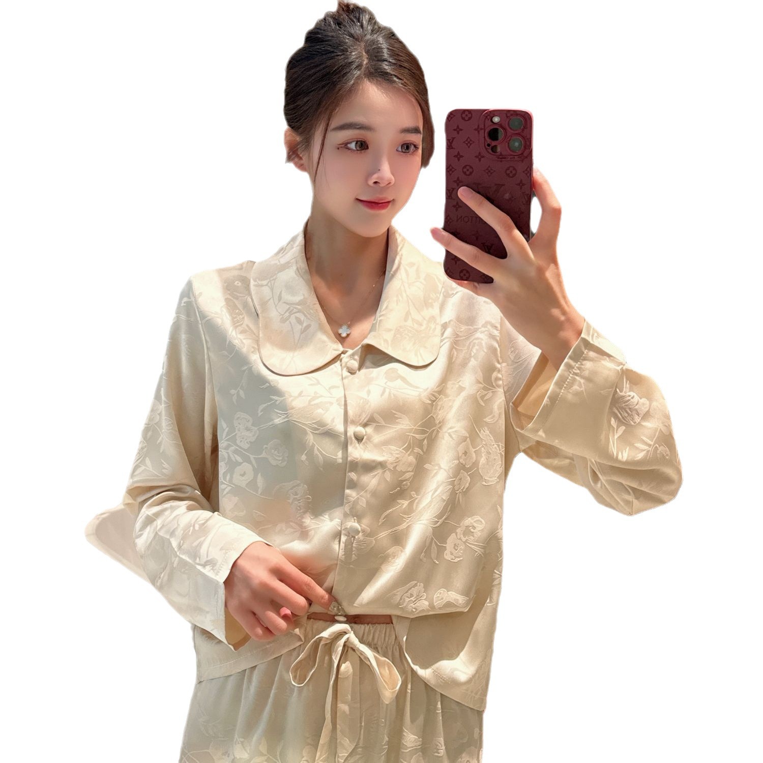 봄 여름 신상 중국풍 인형 칼라 아이스 실크 자카드 잠옷 세트 여성용 얇고 편안한 홈웨어 여성용 중국풍 디자인