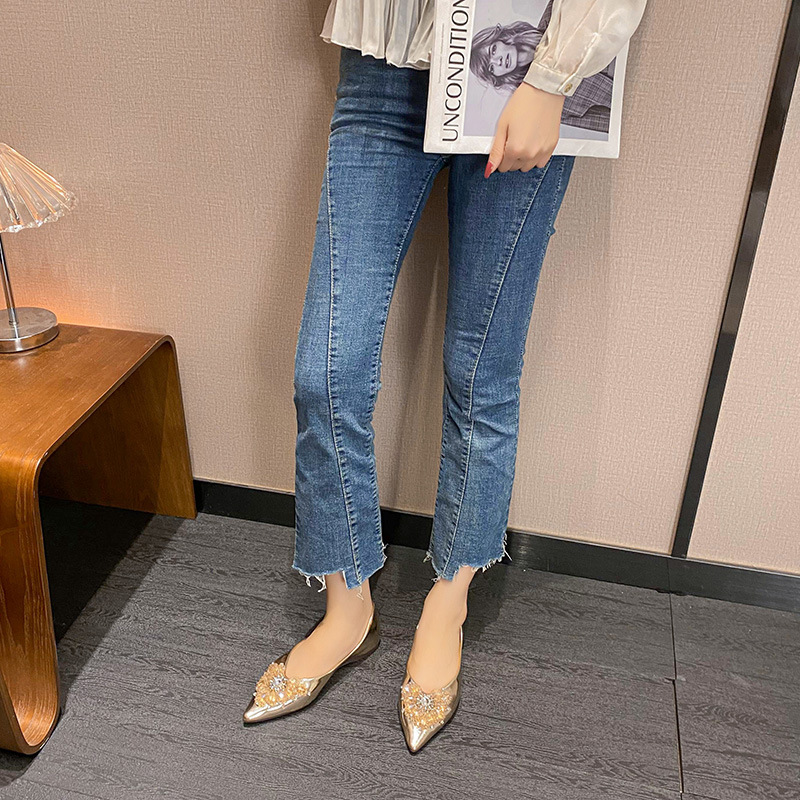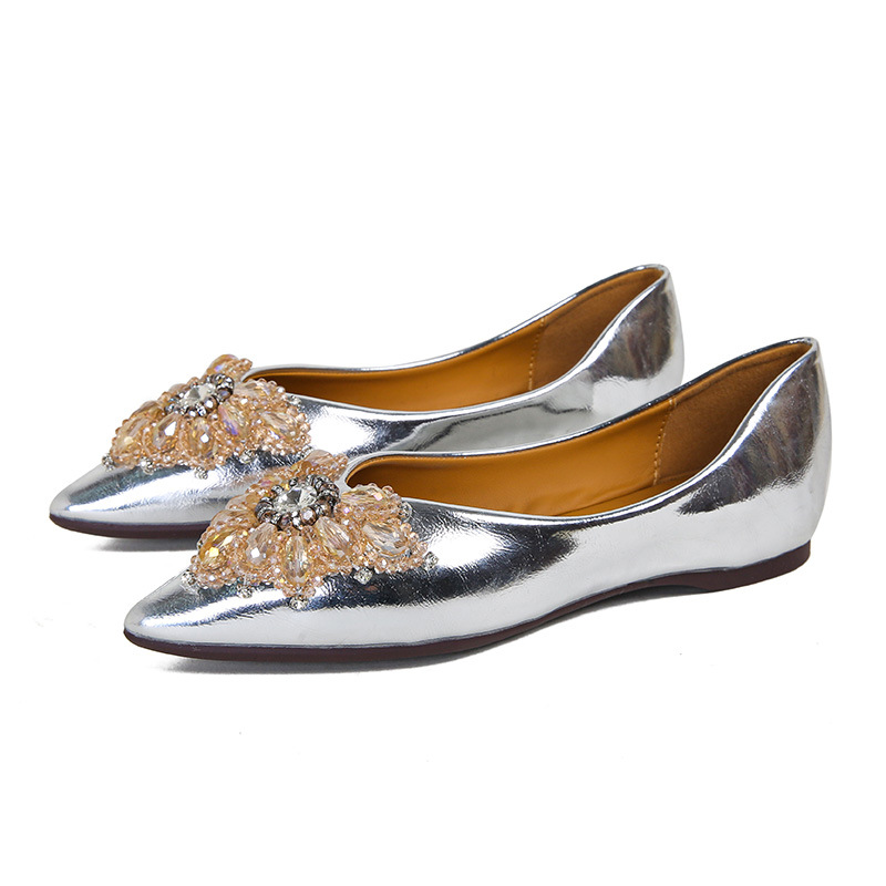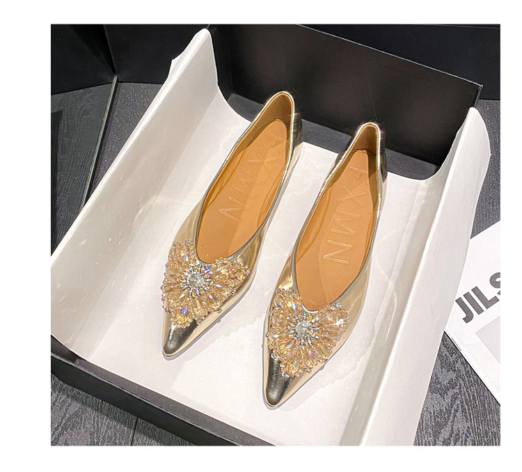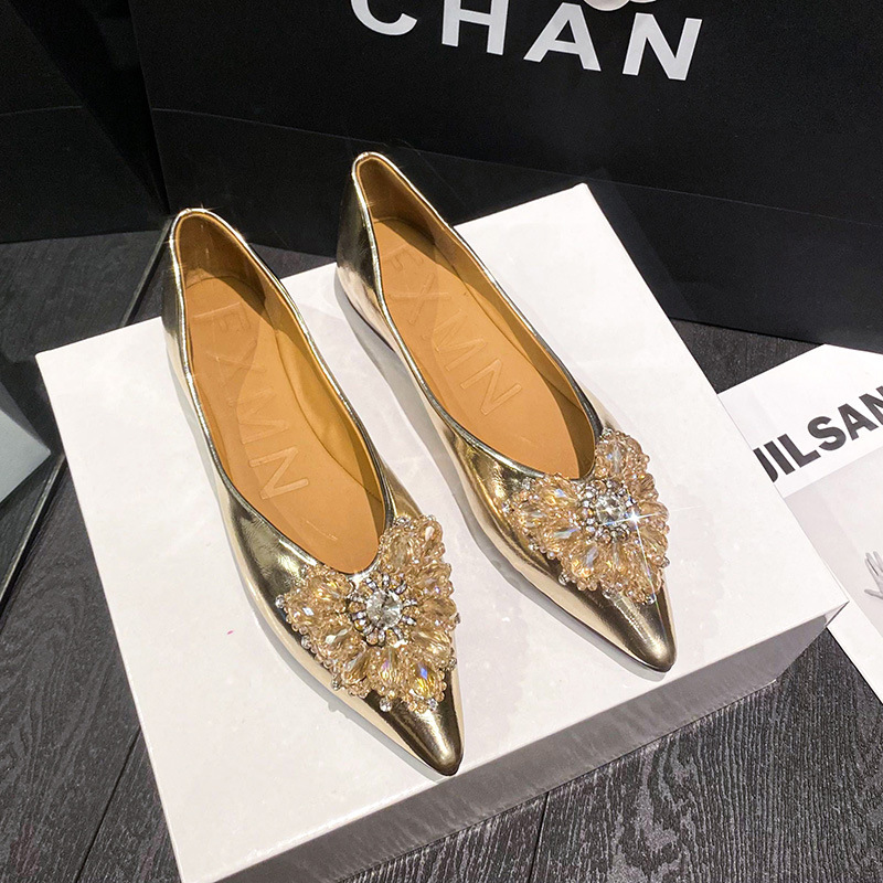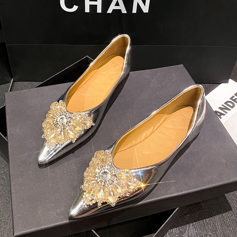 라인스톤 뾰족한 싱글 레이어 신발 여성 플랫 신발 프랑스 스타일 2024 새로운 신발 요정 스타일 여성 신발 봄과 가을 낮은 입 플러스 사이즈
