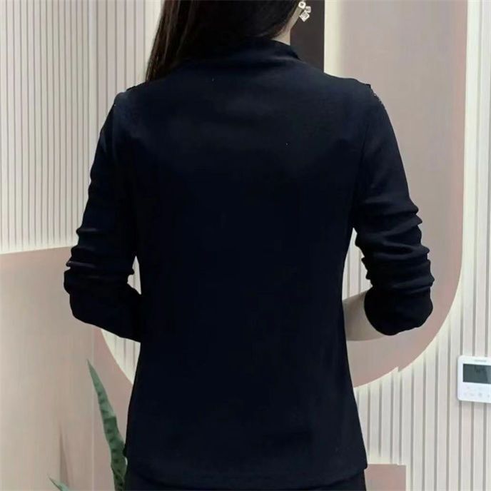 크로스 보더 하프 터틀넥 따뜻한 바닥 셔츠 2024 봄과 가을 얇은 새 레이스 라인 석 서양식 슬림 티셔츠 여성용