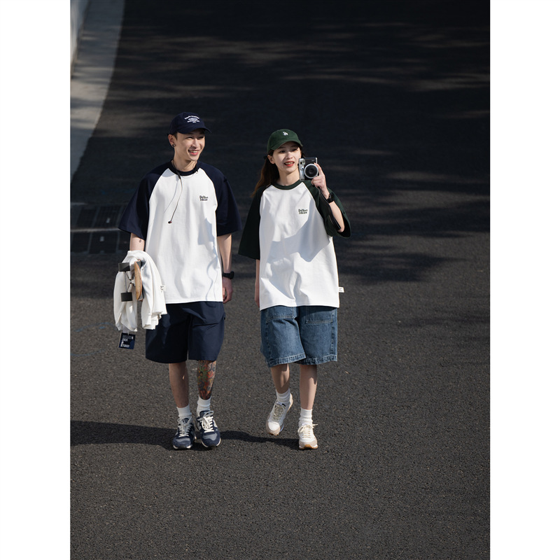 여름 헤비 솔리드 컬러 캐주얼 일본 스타일 십대 Raglan 소매 티셔츠베이스 셔츠 남성용 루즈 스플라이스 슬리브 짧은 소매 트렌디