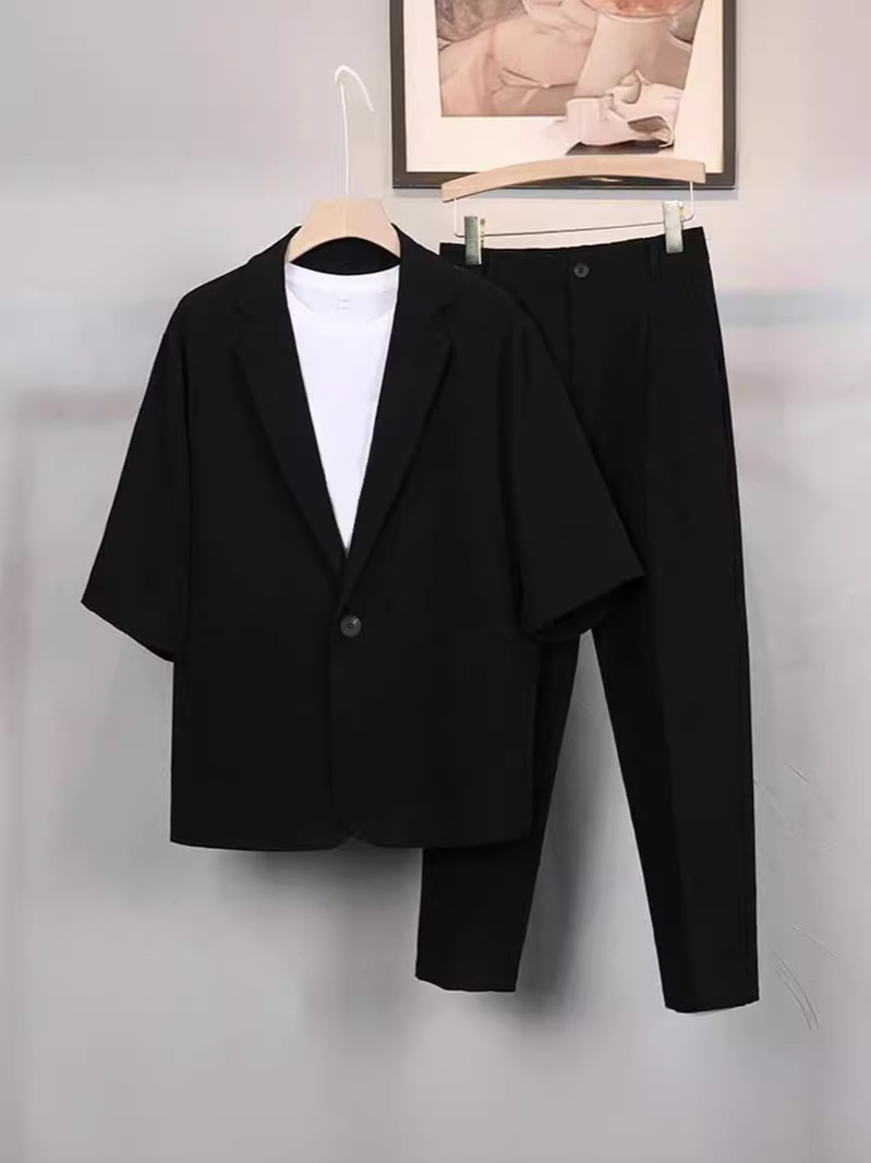 여름 세트 세트 남자 신랑 반팔 한국식 슬림 핏 리퍼 핸즈섬 남성 전문 캐주얼 비즈니스 웨딩 세트