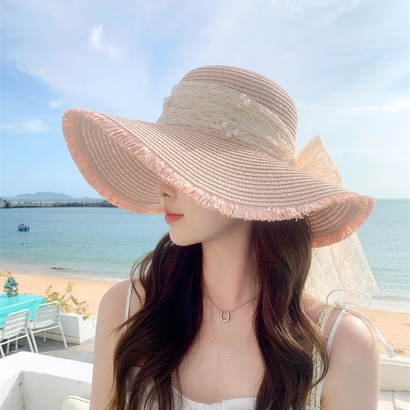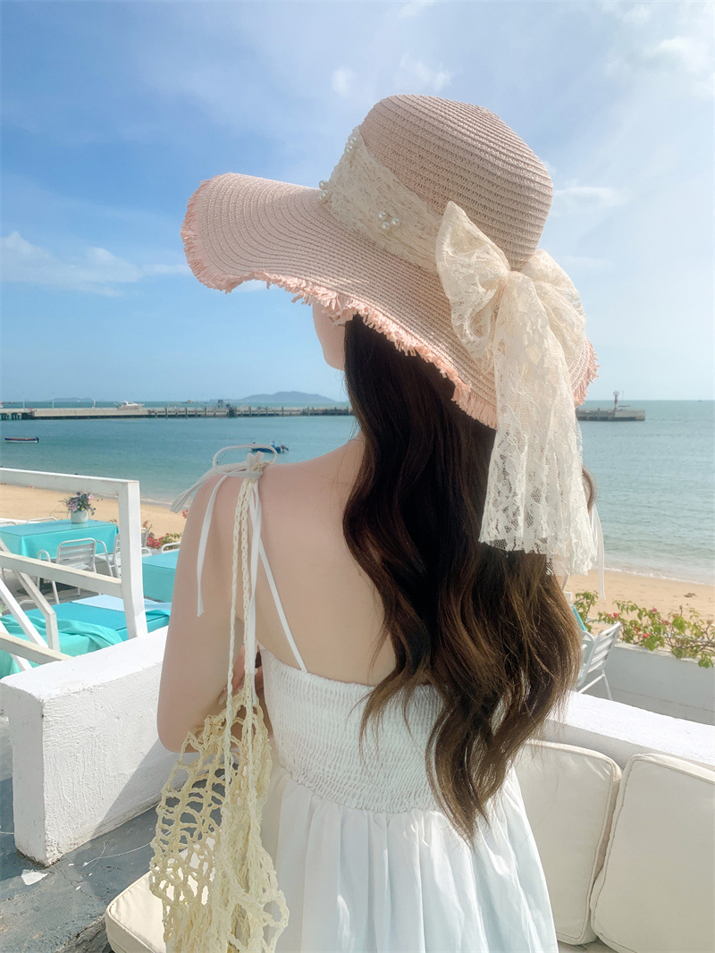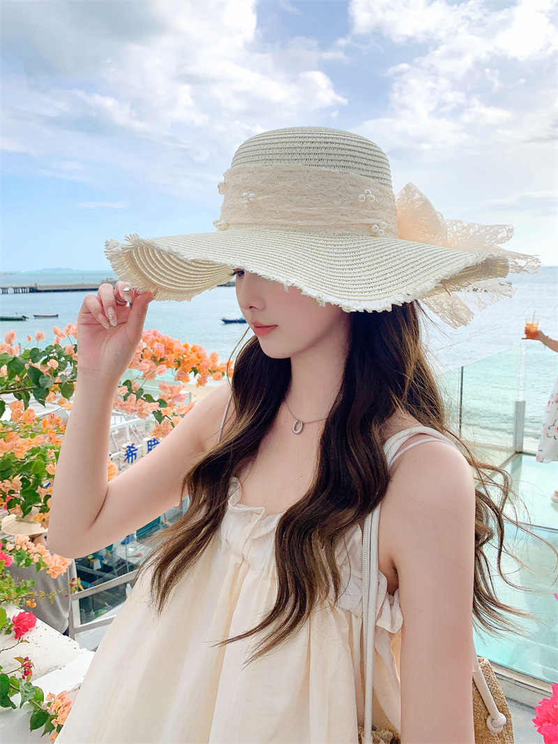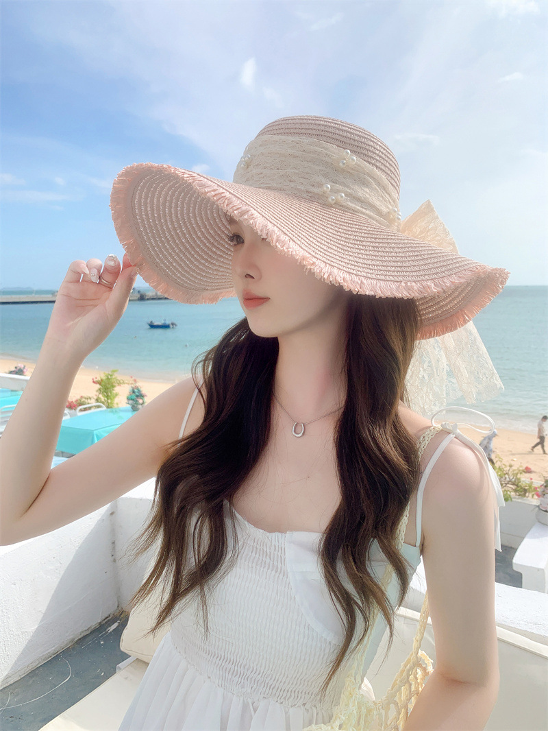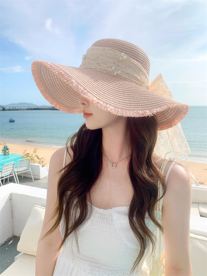 새로운 달콤한 큰 활 햇살 밀짚 모자 진주 가장자리 패션 큰 브림 태양 모자 야외 태양 모자