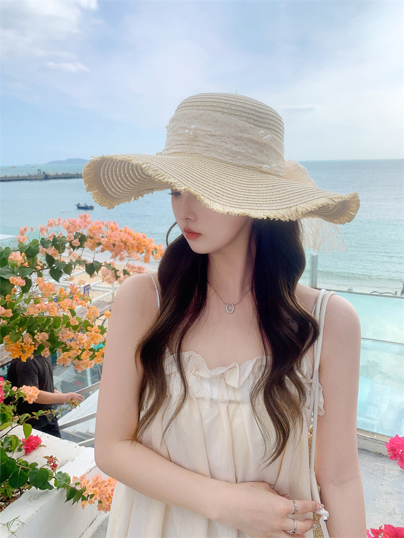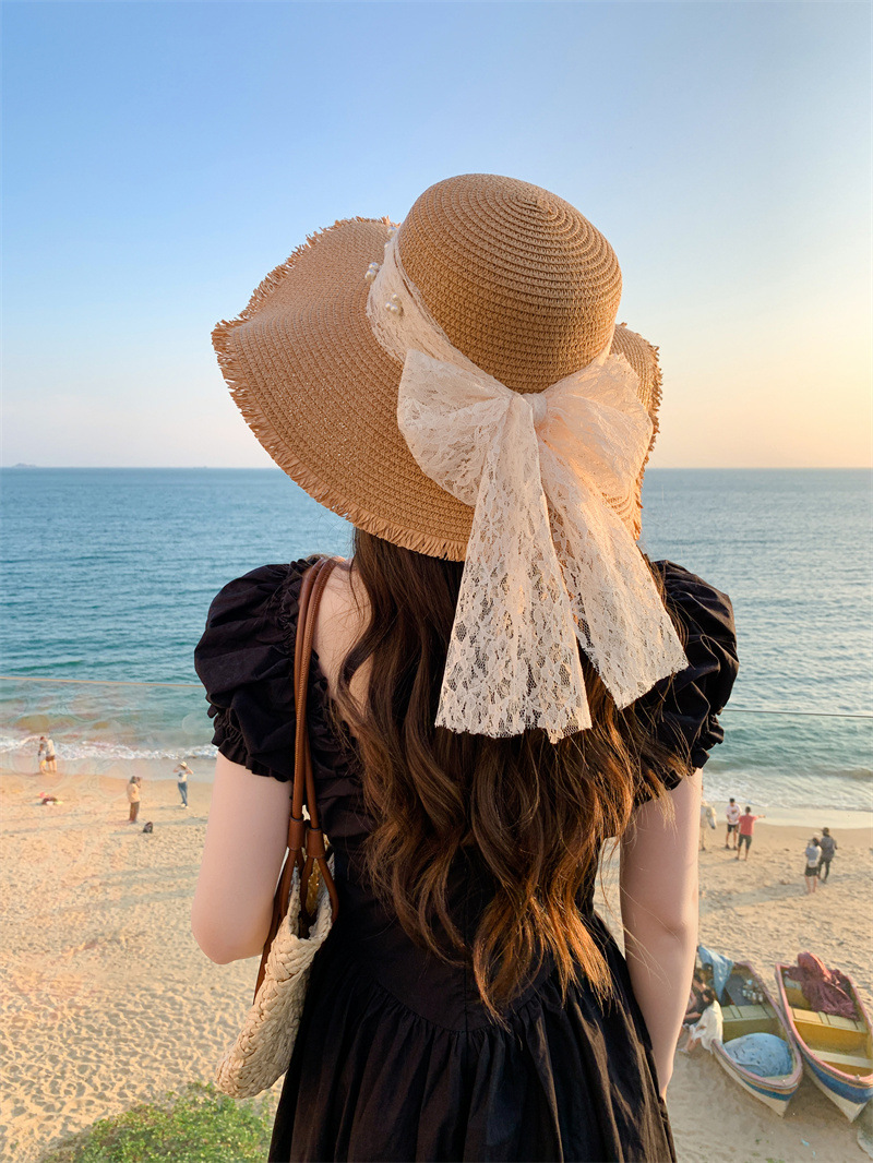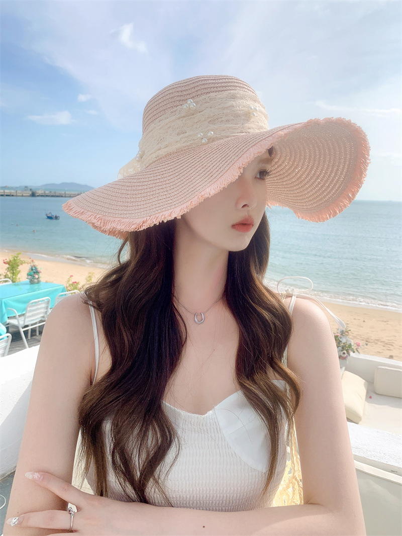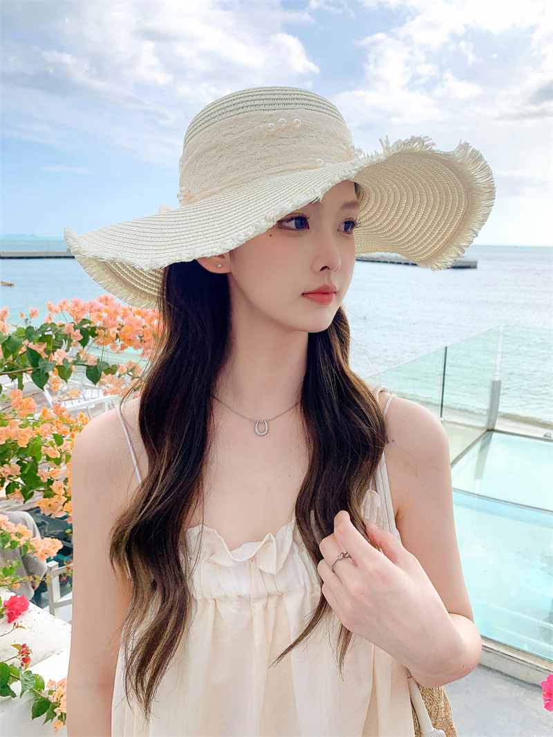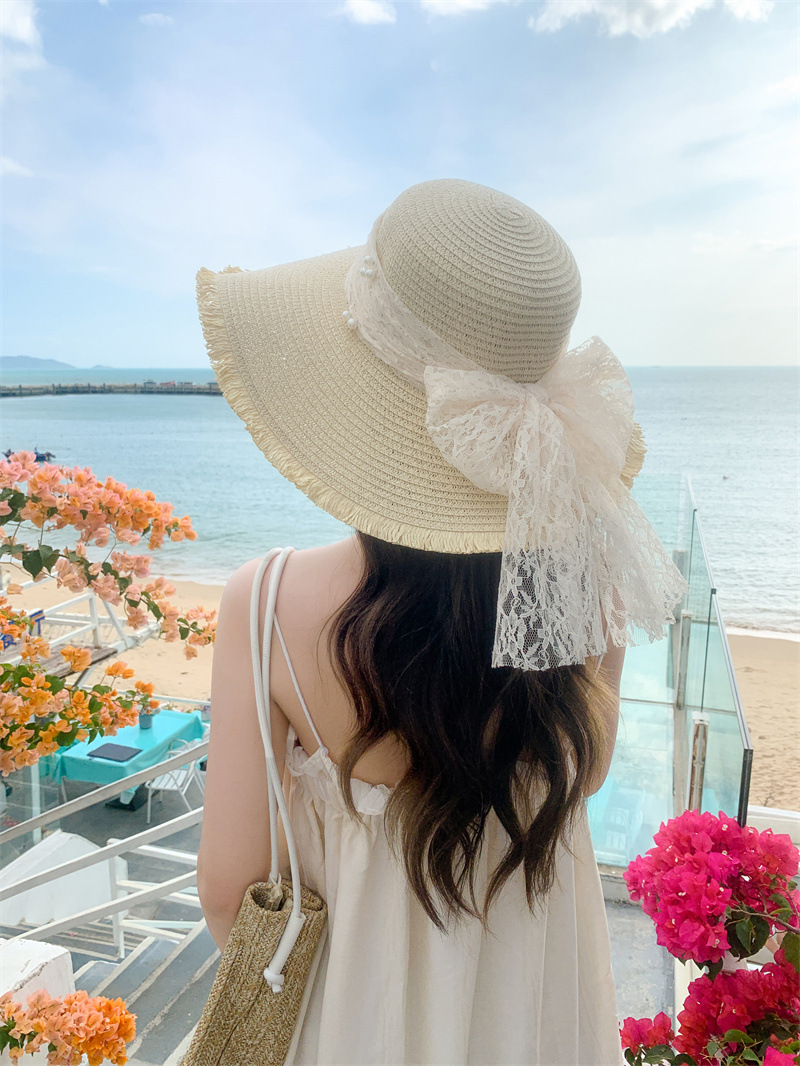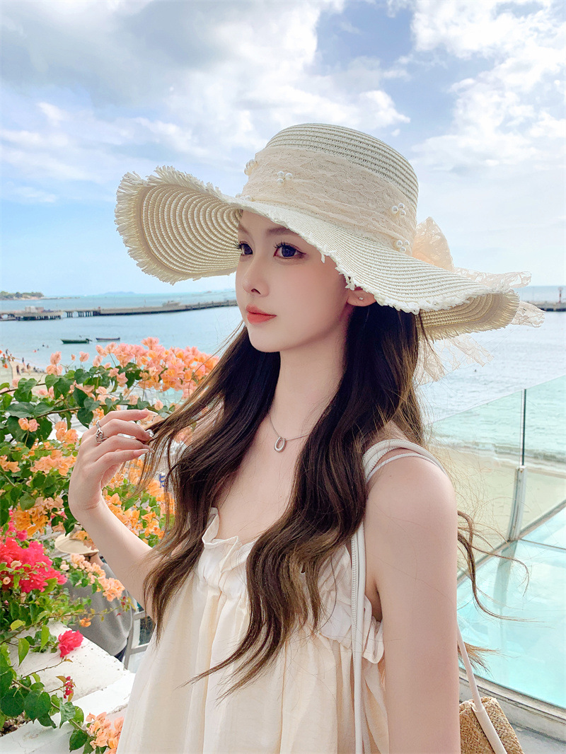 새로운 달콤한 큰 활 햇살 밀짚 모자 진주 가장자리 패션 큰 브림 태양 모자 야외 태양 모자