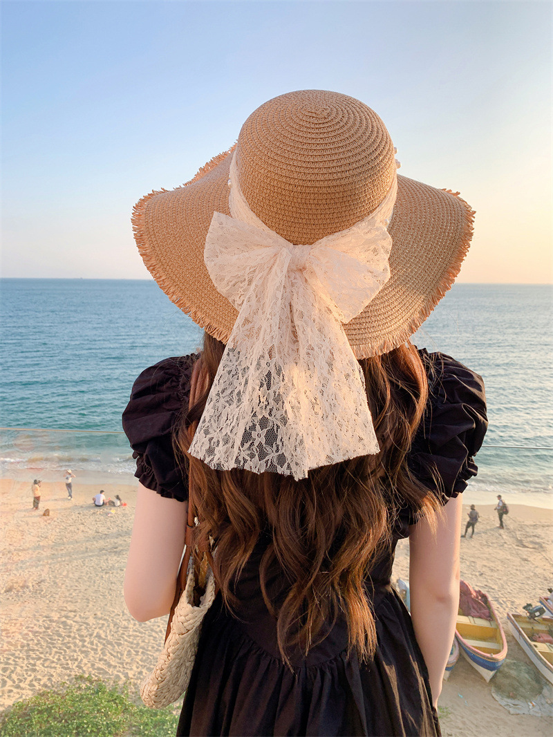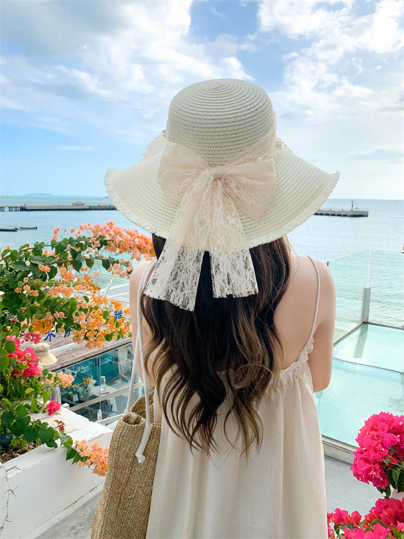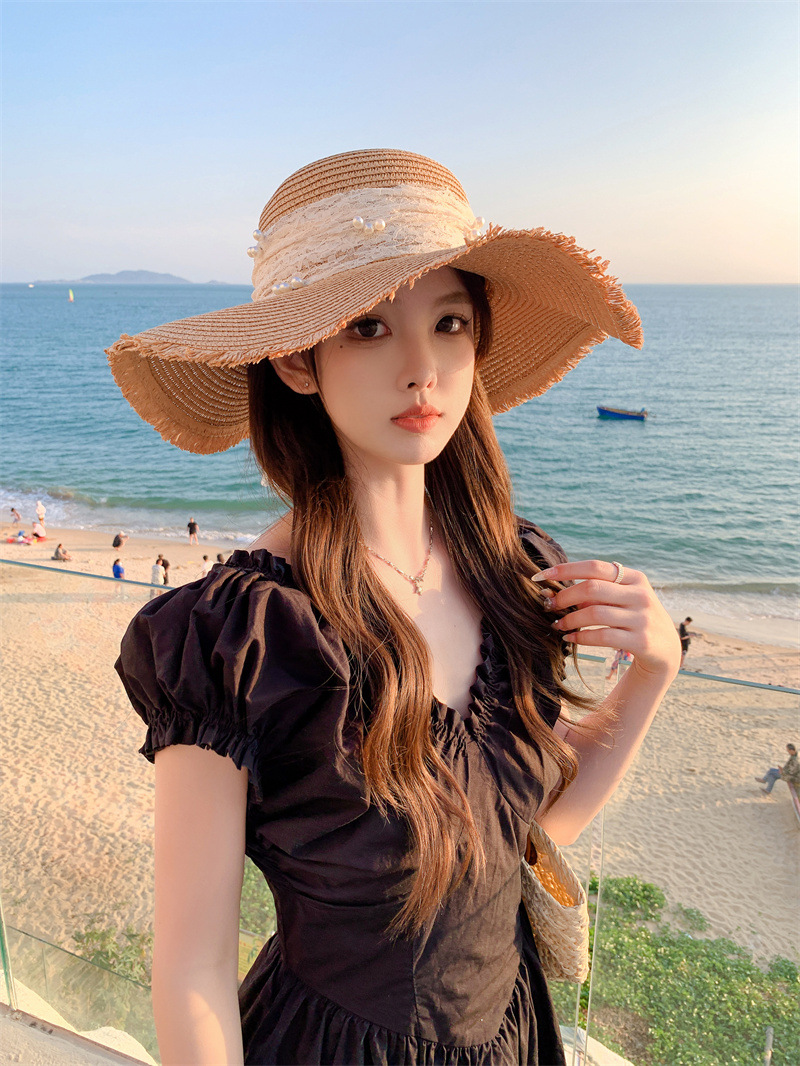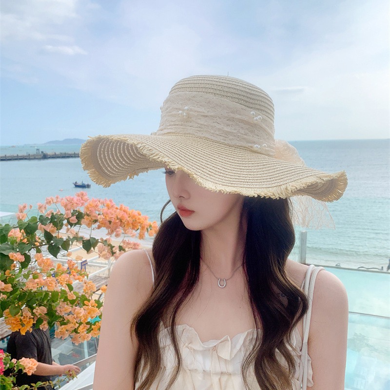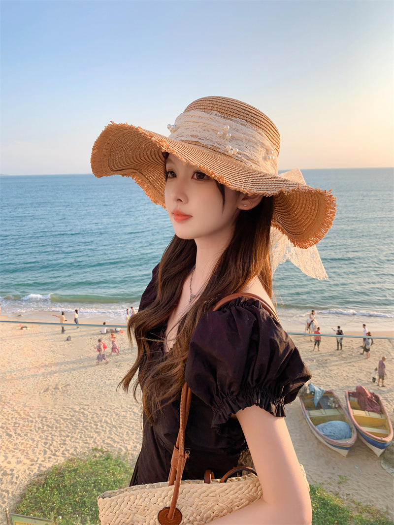 새로운 달콤한 큰 활 햇살 밀짚 모자 진주 가장자리 패션 큰 브림 태양 모자 야외 태양 모자