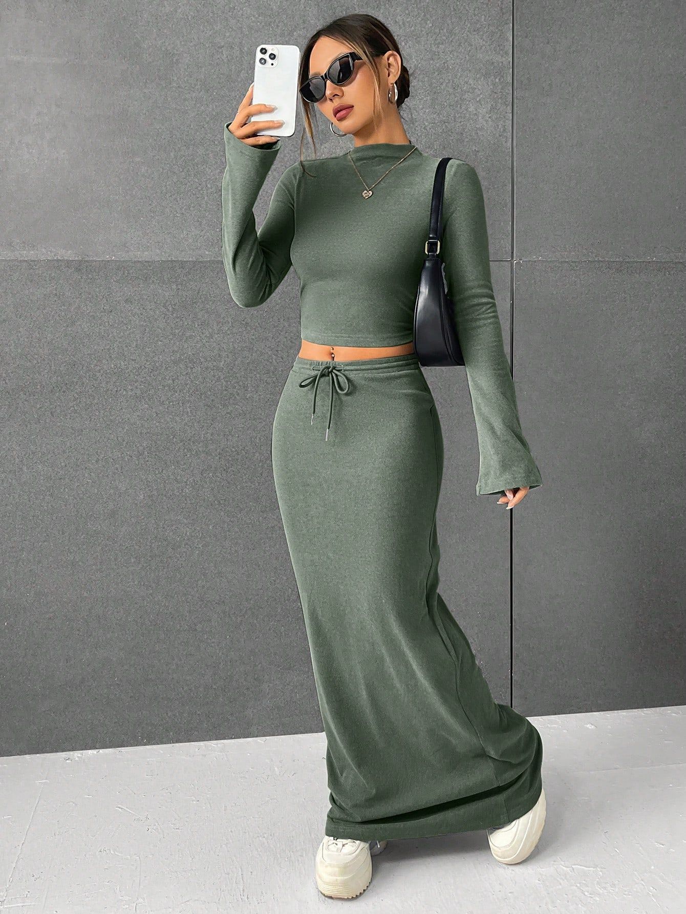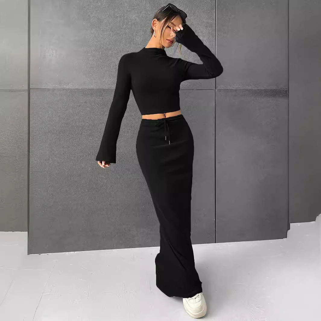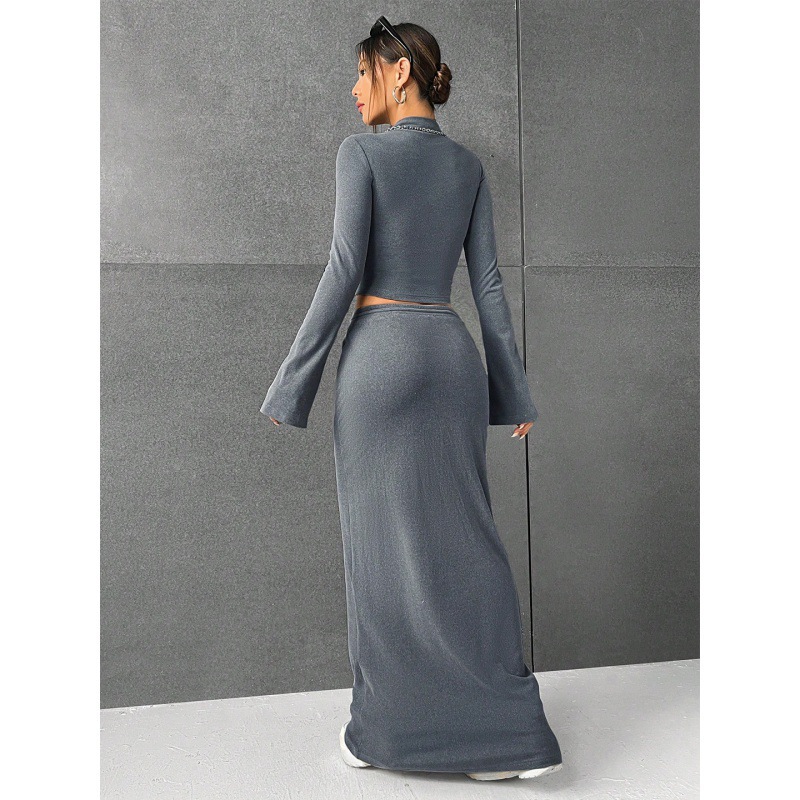 재고 유럽과 미국의 대외 무역 여성 국경 아마존 핫 니트 솔리드 컬러 스커트 긴 소매 패션 투피스 세트