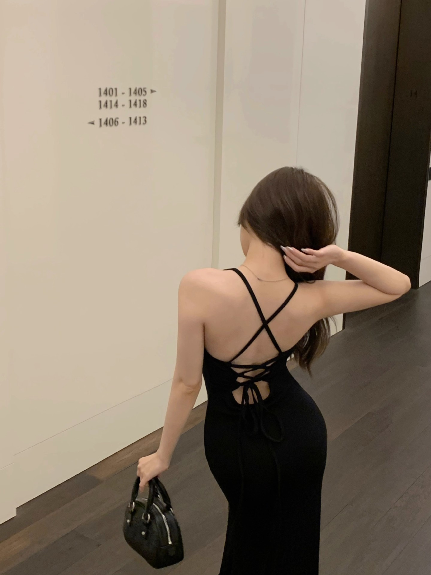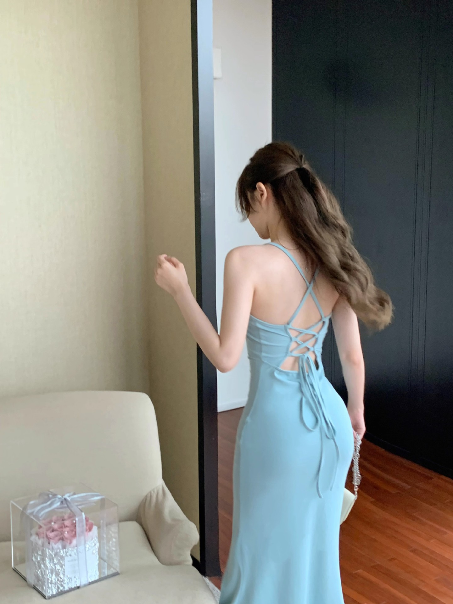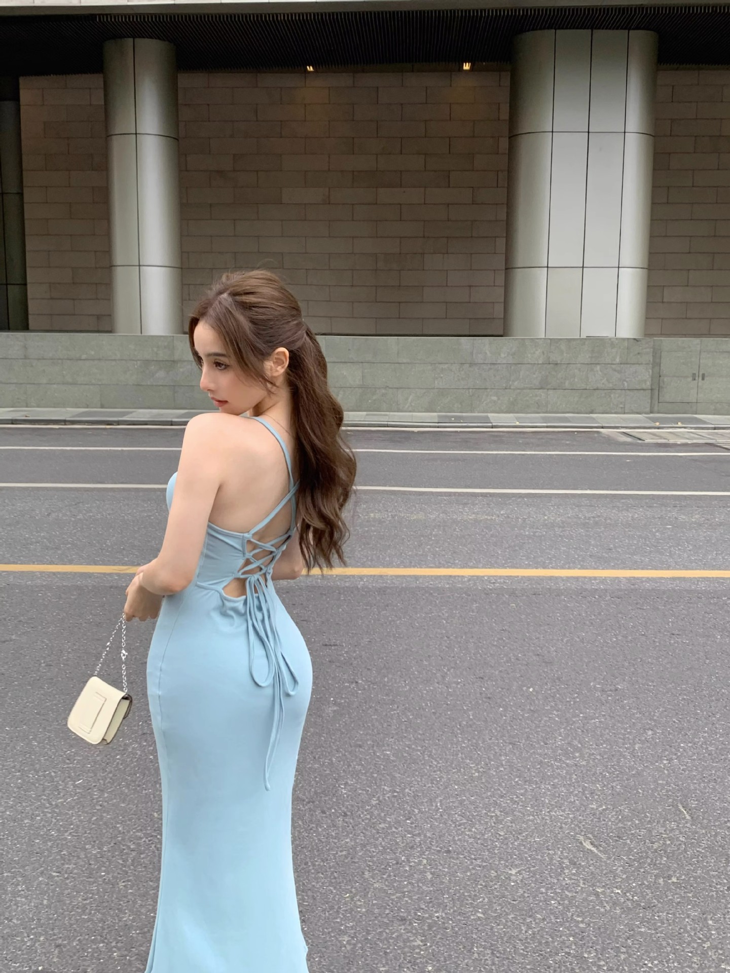 한국식 Ins Backless Hollow-out 레이스 업 원피스 여성용 타이트 허리 타이트 힙 스플릿 피쉬 테일 스커트