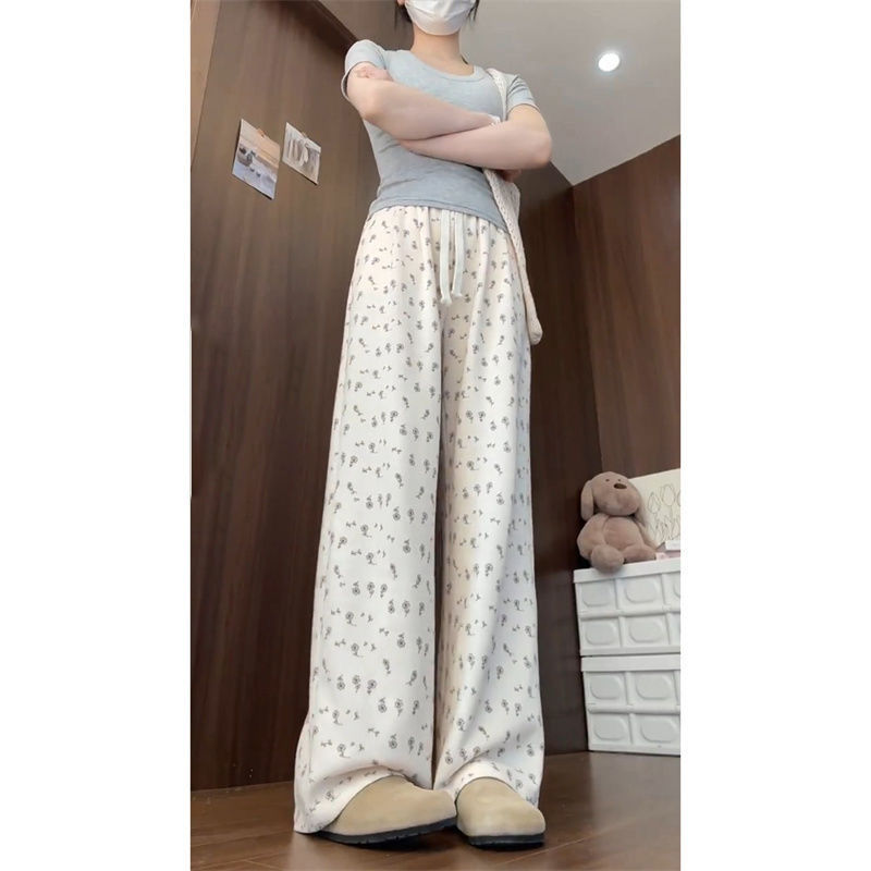 살구색 부드러운 꽃 넓은 다리 바지 여성 여름 얇은 새그 높은 허리 느슨한 편안한 캐주얼 스포츠 스트레이트 바지