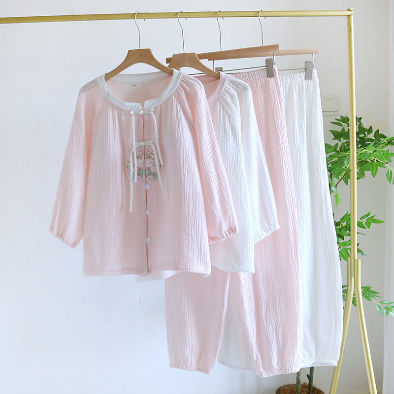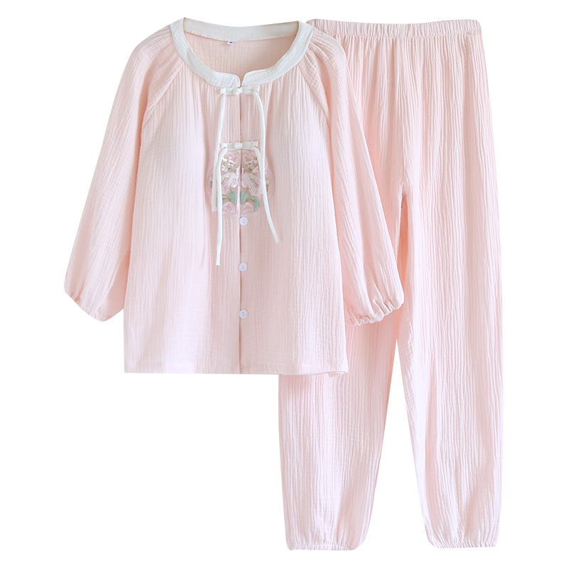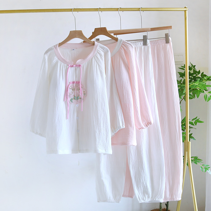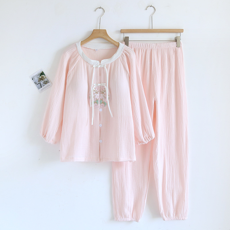 여름 가을 겨울 긴 소매 중국 순면 파자마 여성 가슴 패드 원피스 봄 착용 외투 무료 브래지어 홈 의류 세트