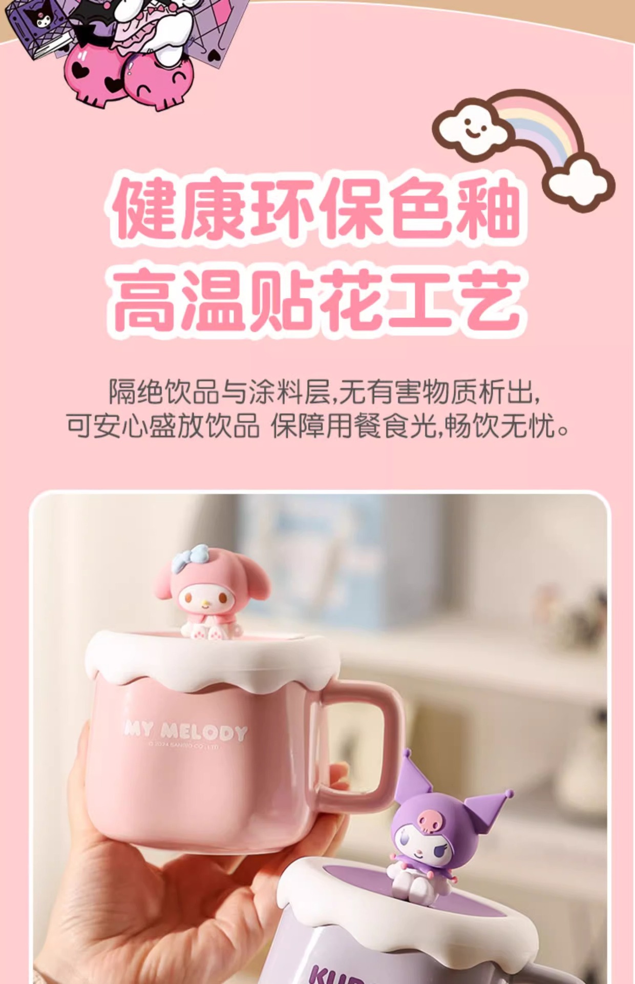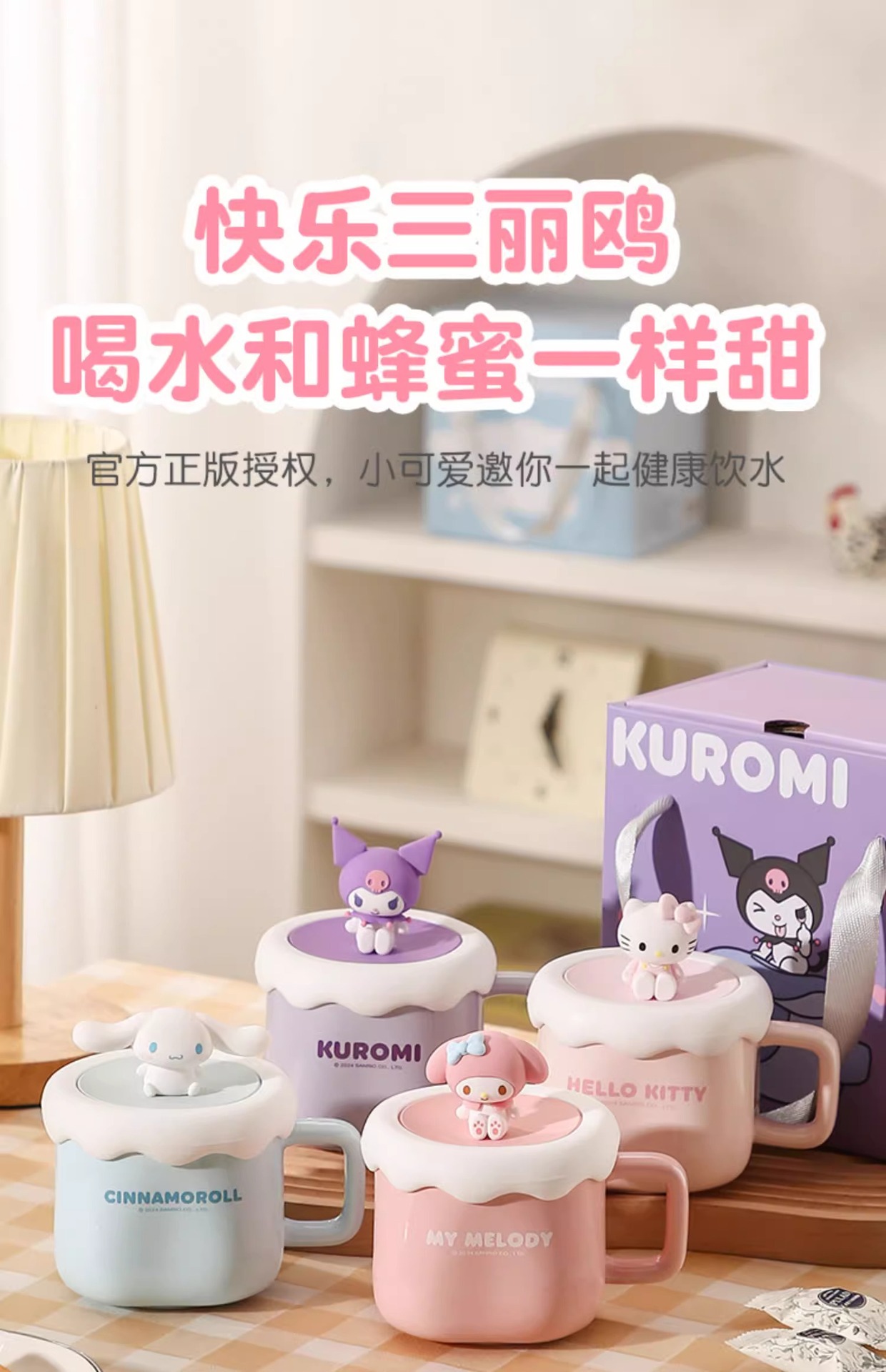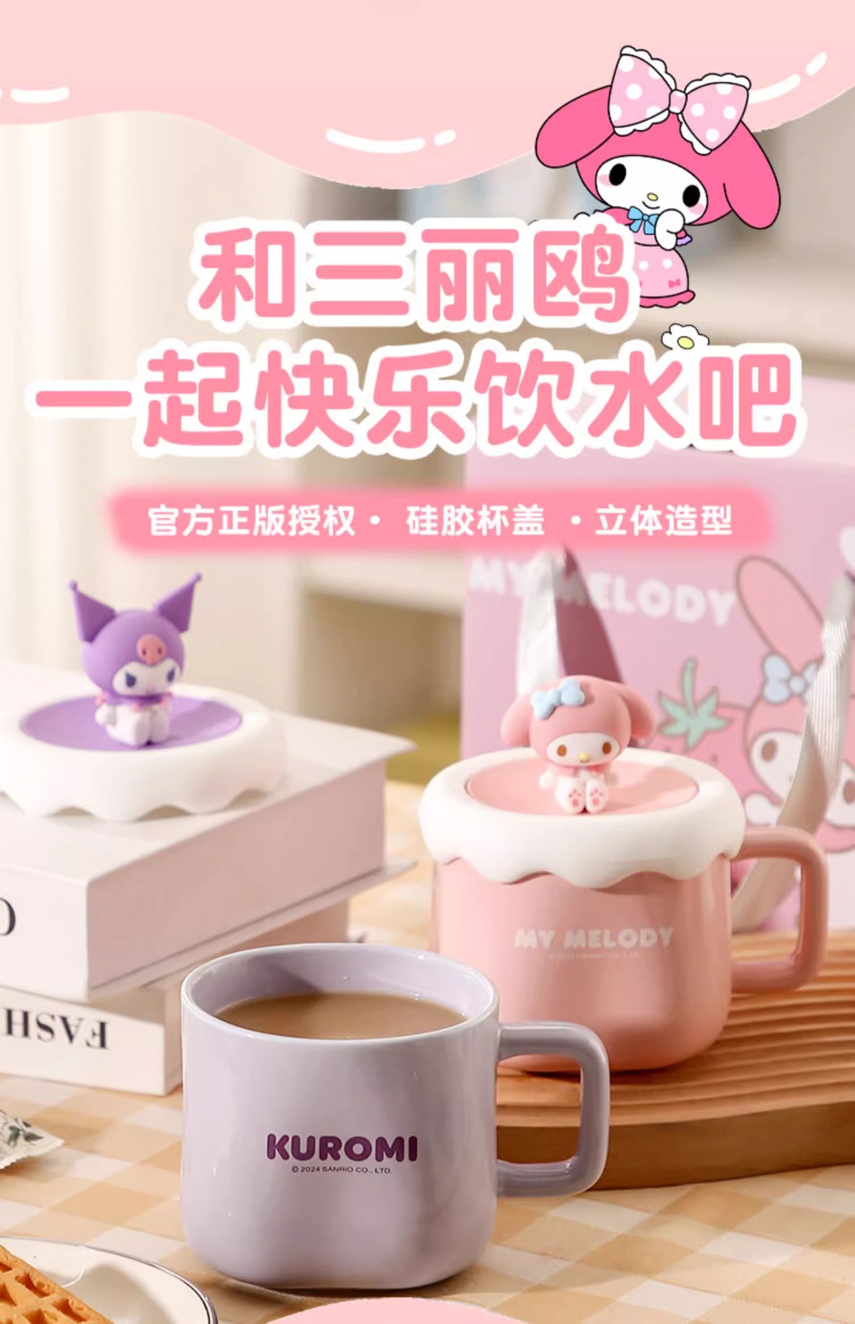 Sanrio 머그잔 실리콘 뚜껑이 달린 고급스러운 세라믹 마시는 컵 Kuromi 헬로 키티 만화 워터 컵 도매