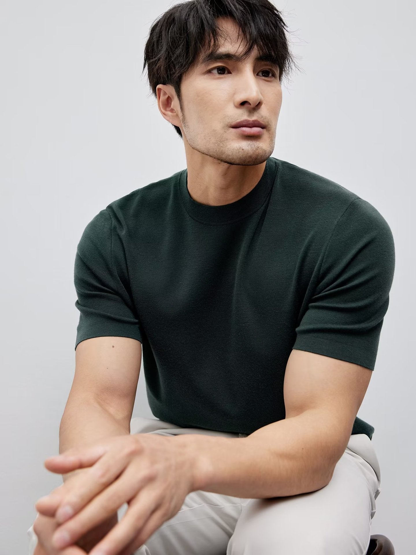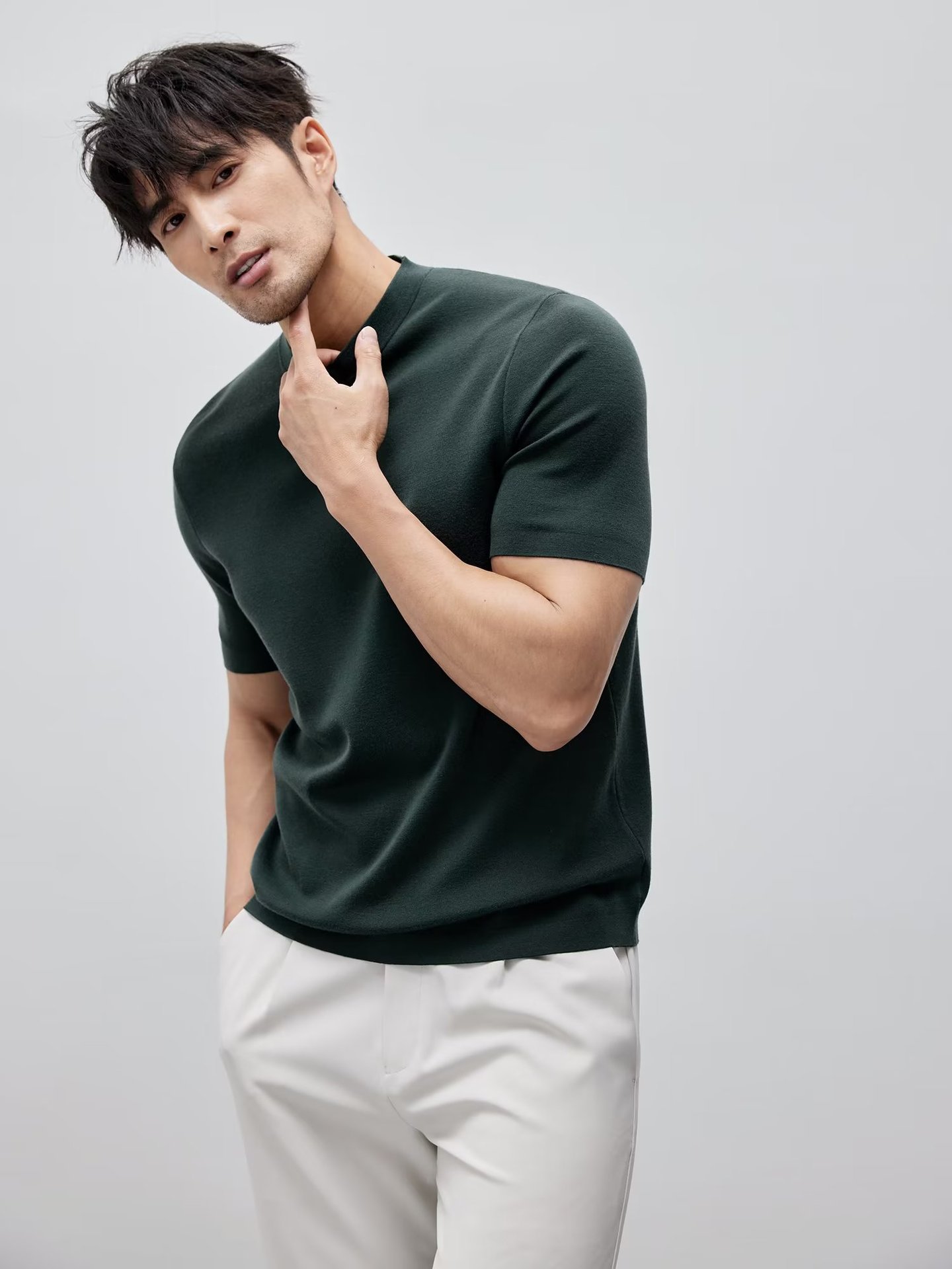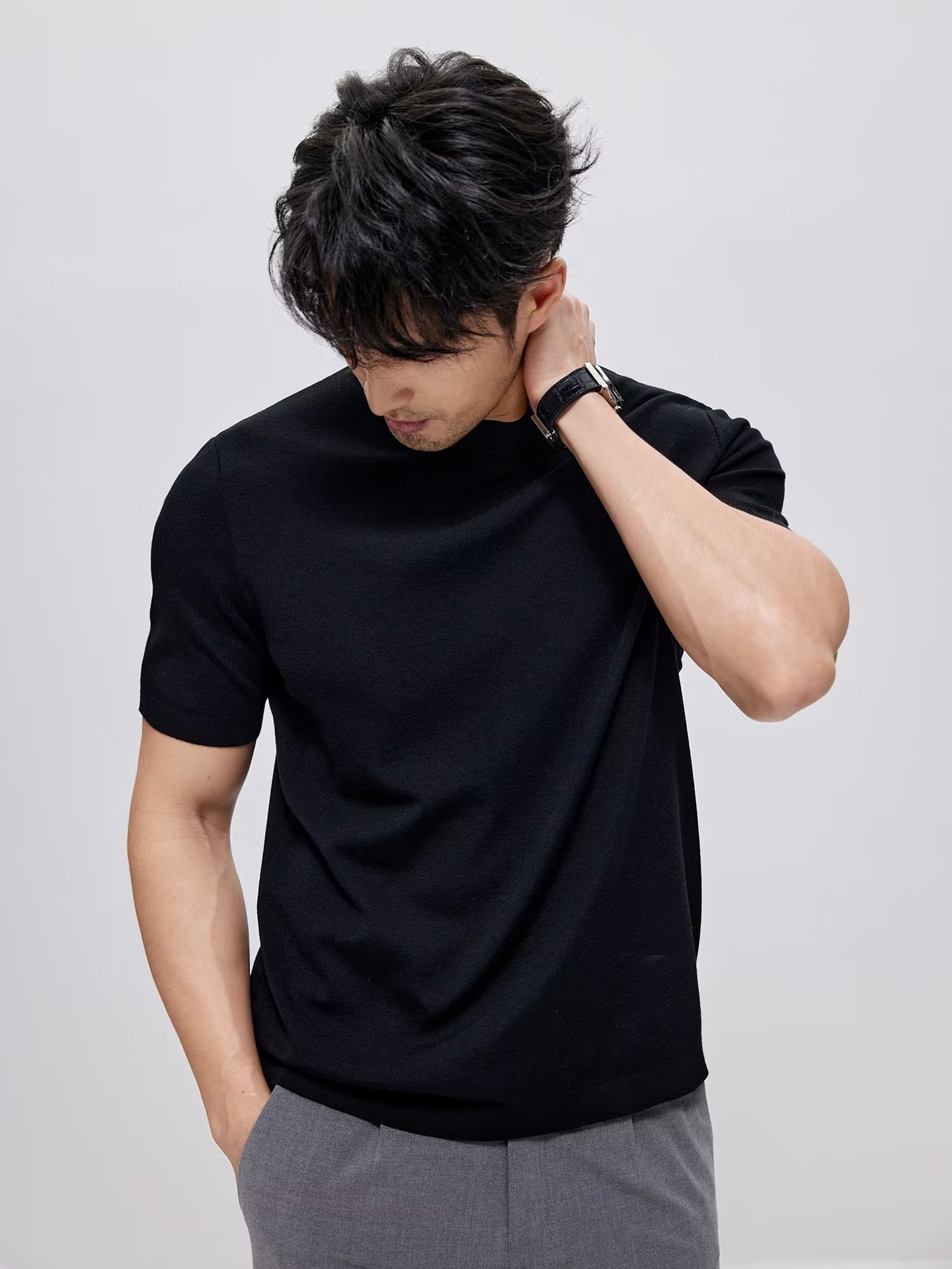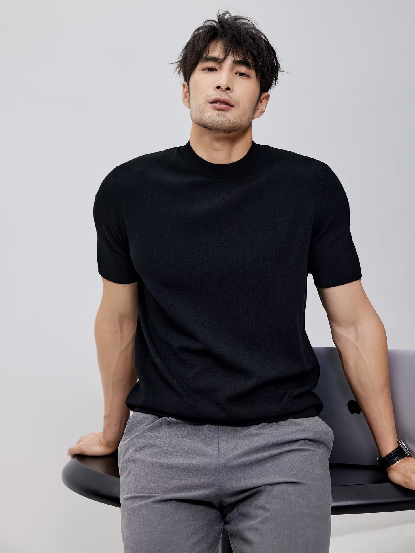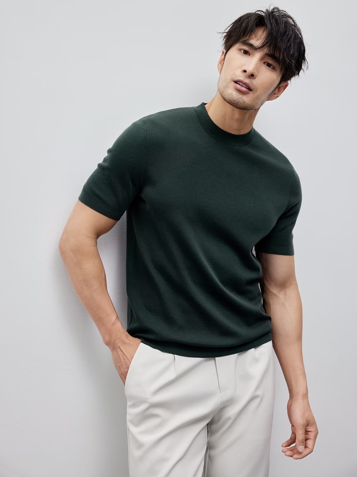 유럽과 미국의 터프 가이 머서 코튼 아이스 실크 티셔츠 근육 남성용 작은 목선 슬림 핏 짧은 소매 시원한 통기성 니트 스웨터