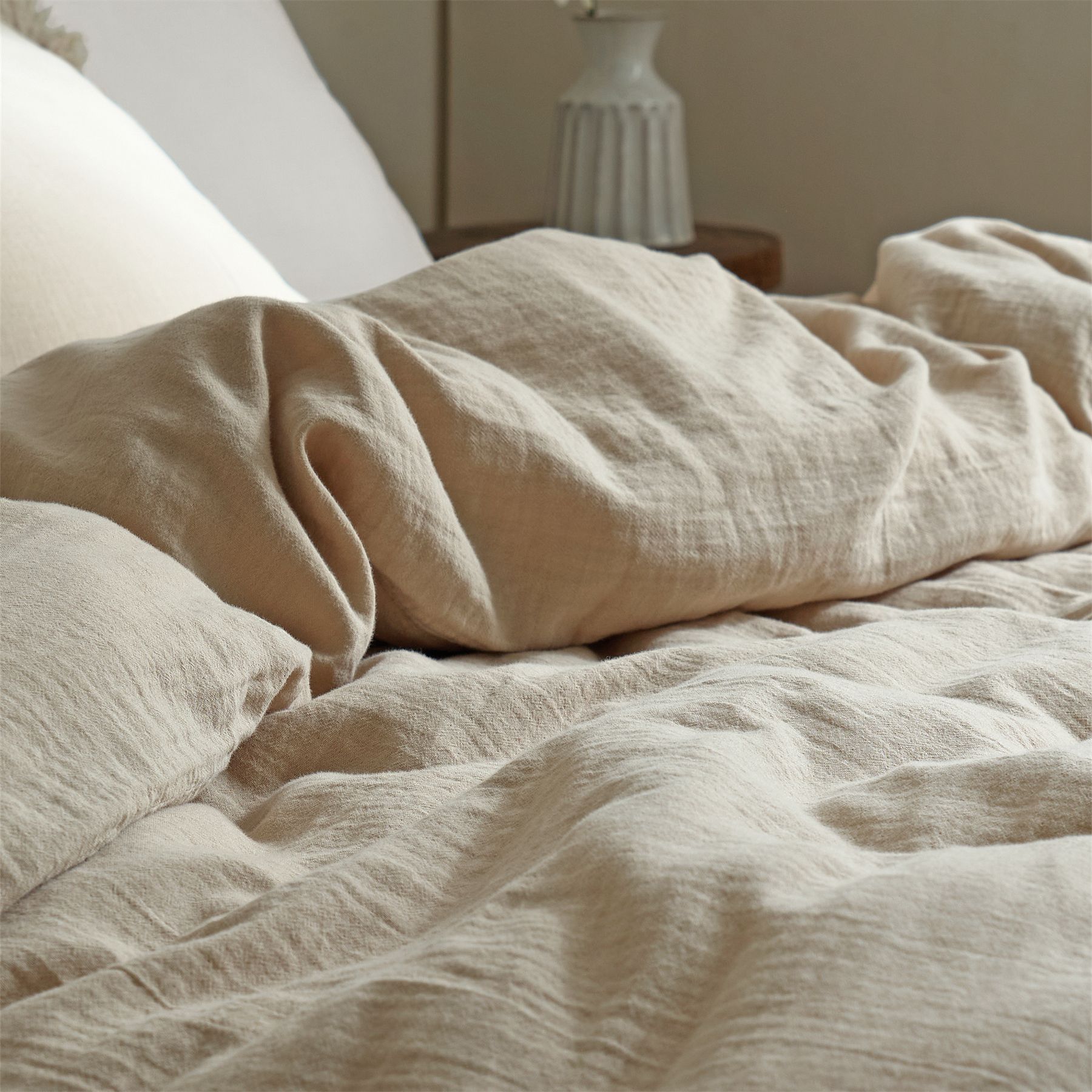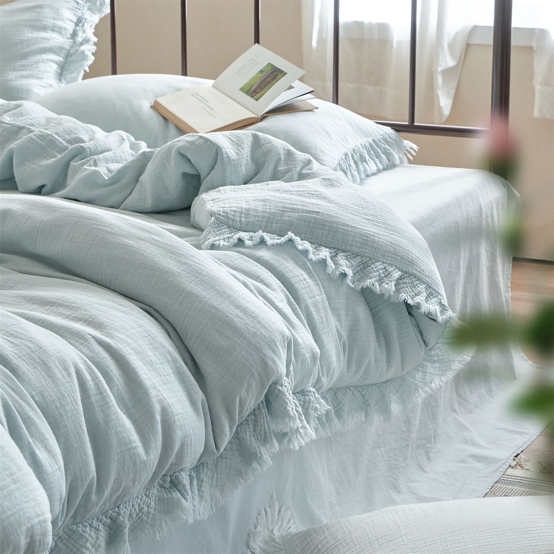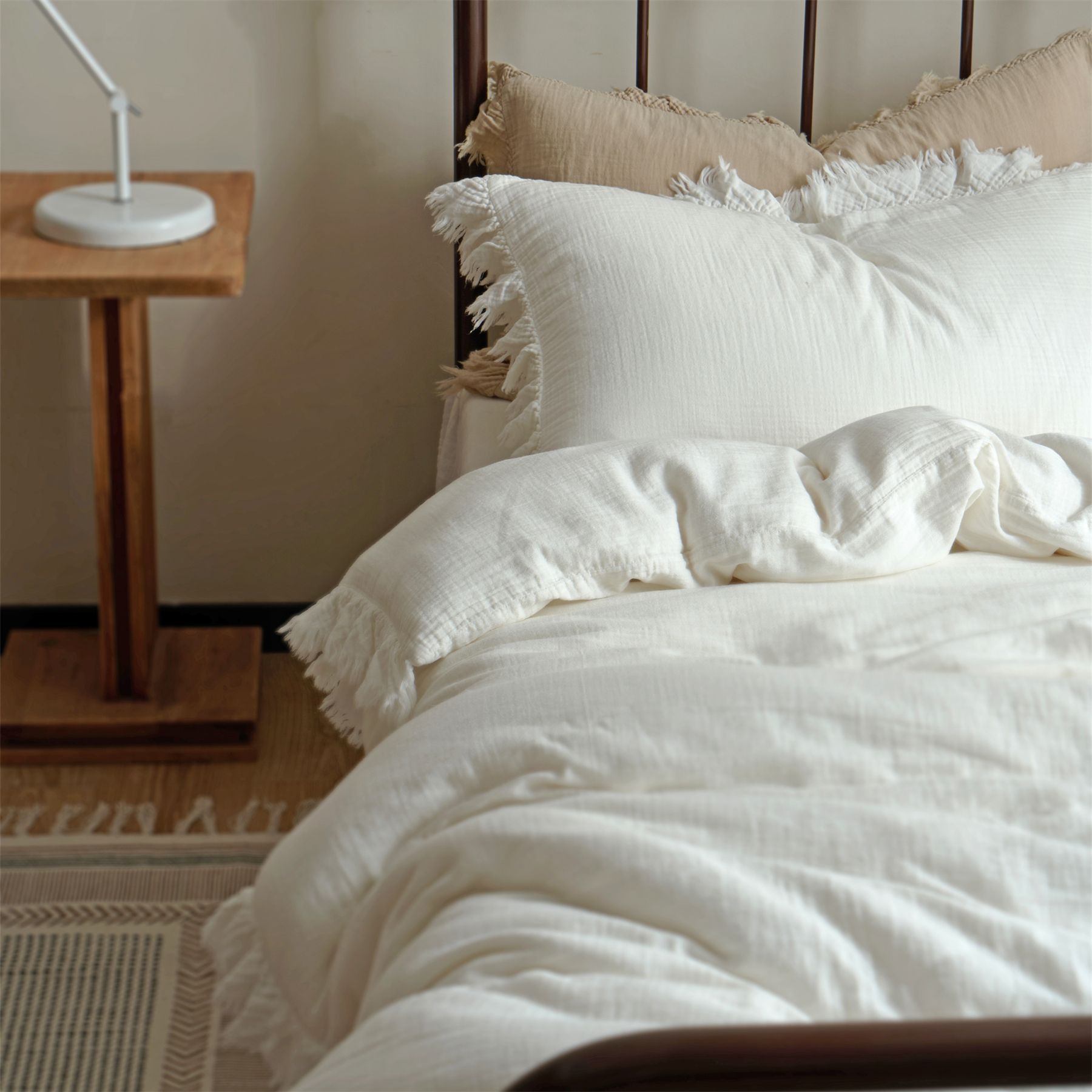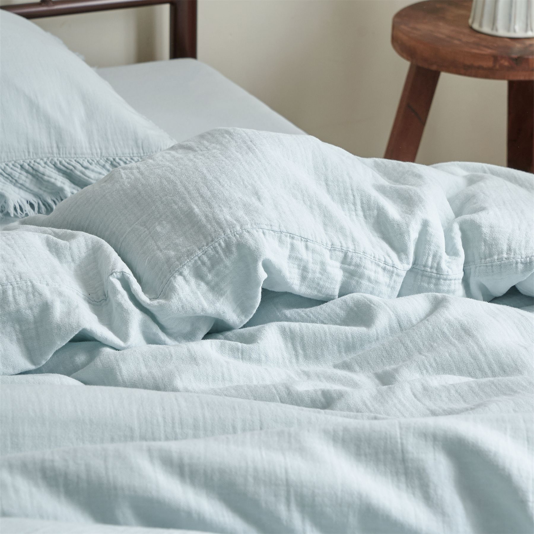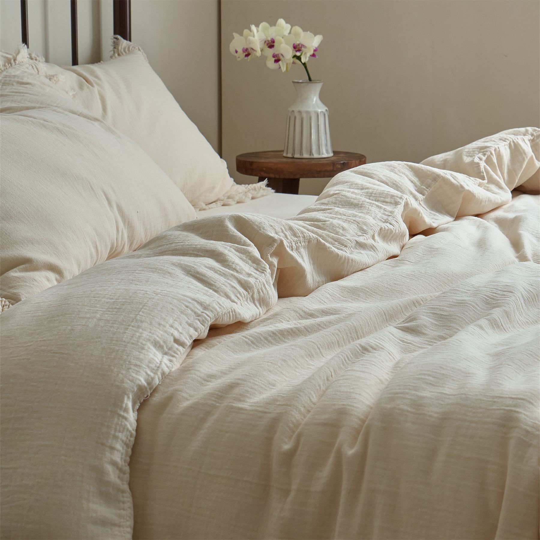 被套包括反面、枕套都是双层纱,床单采用的加密平纹,杜绝双层纱面料做床单有可能会起球的隐患,卖得更安心。