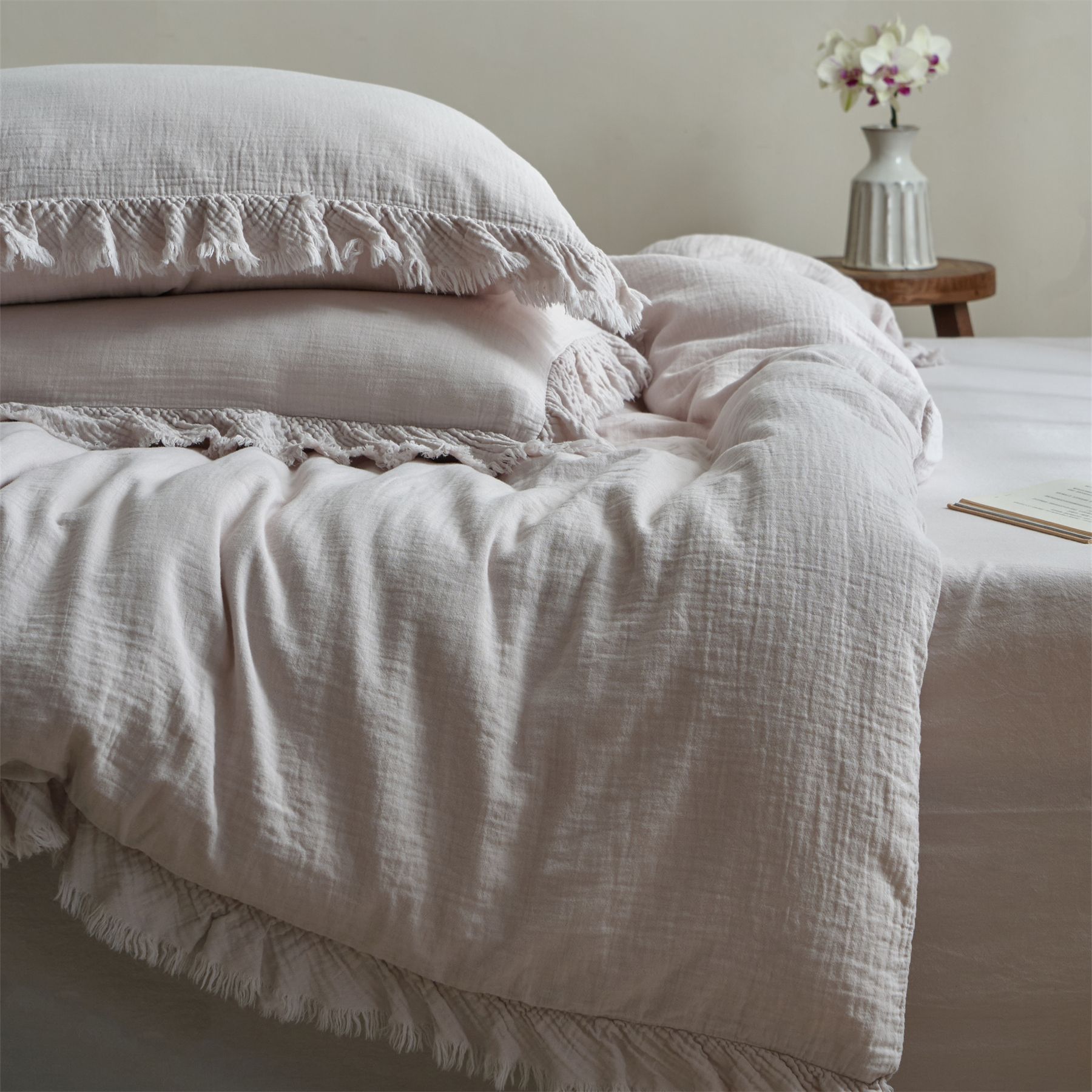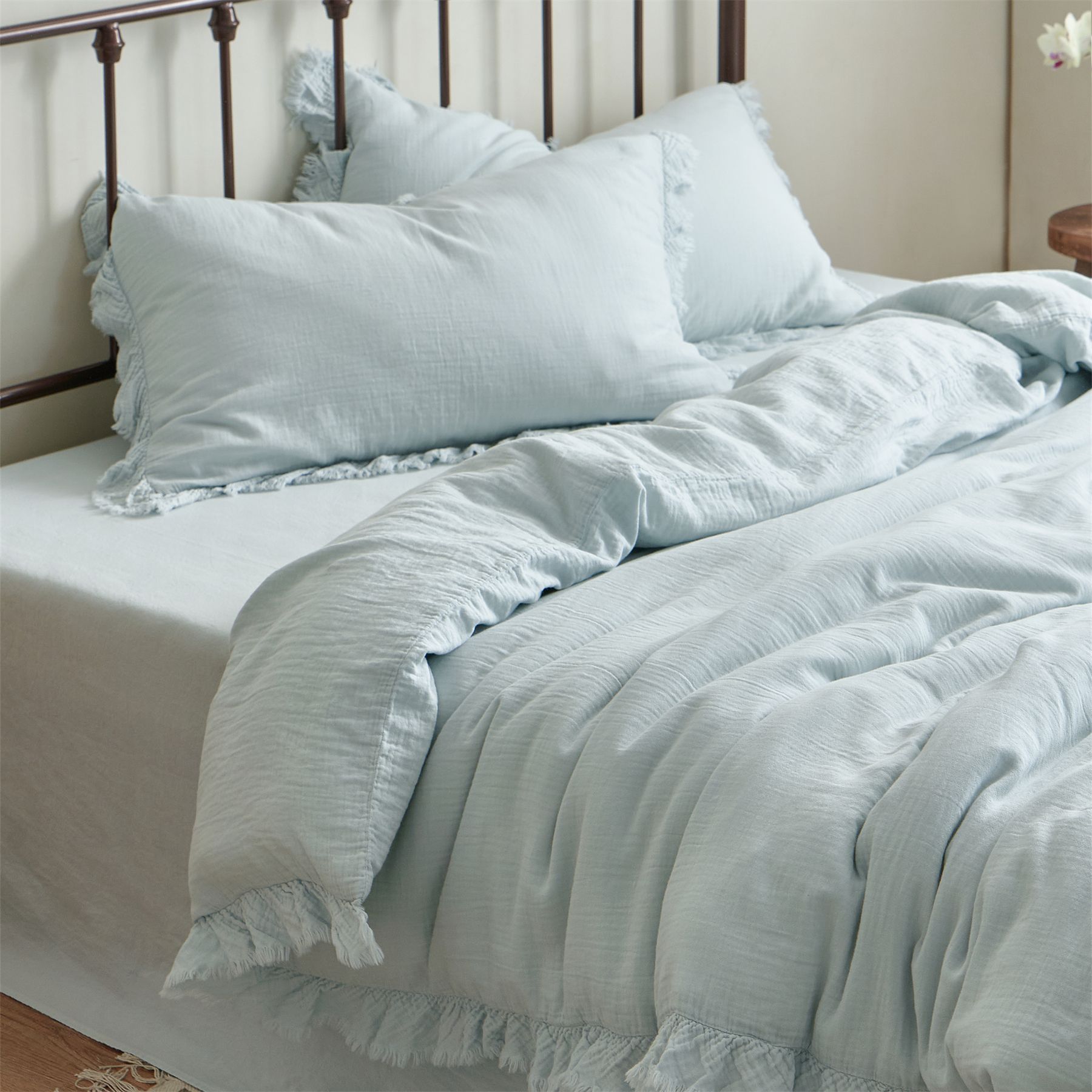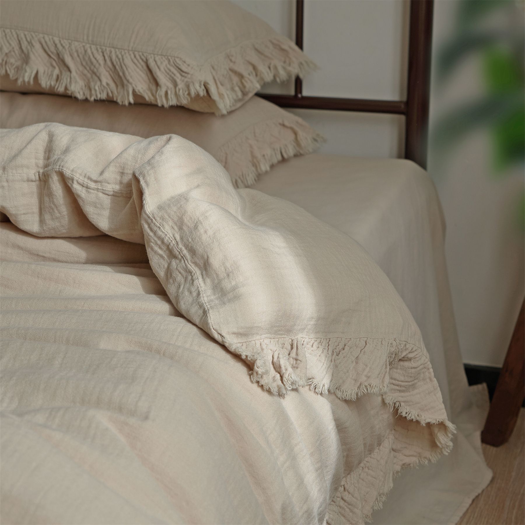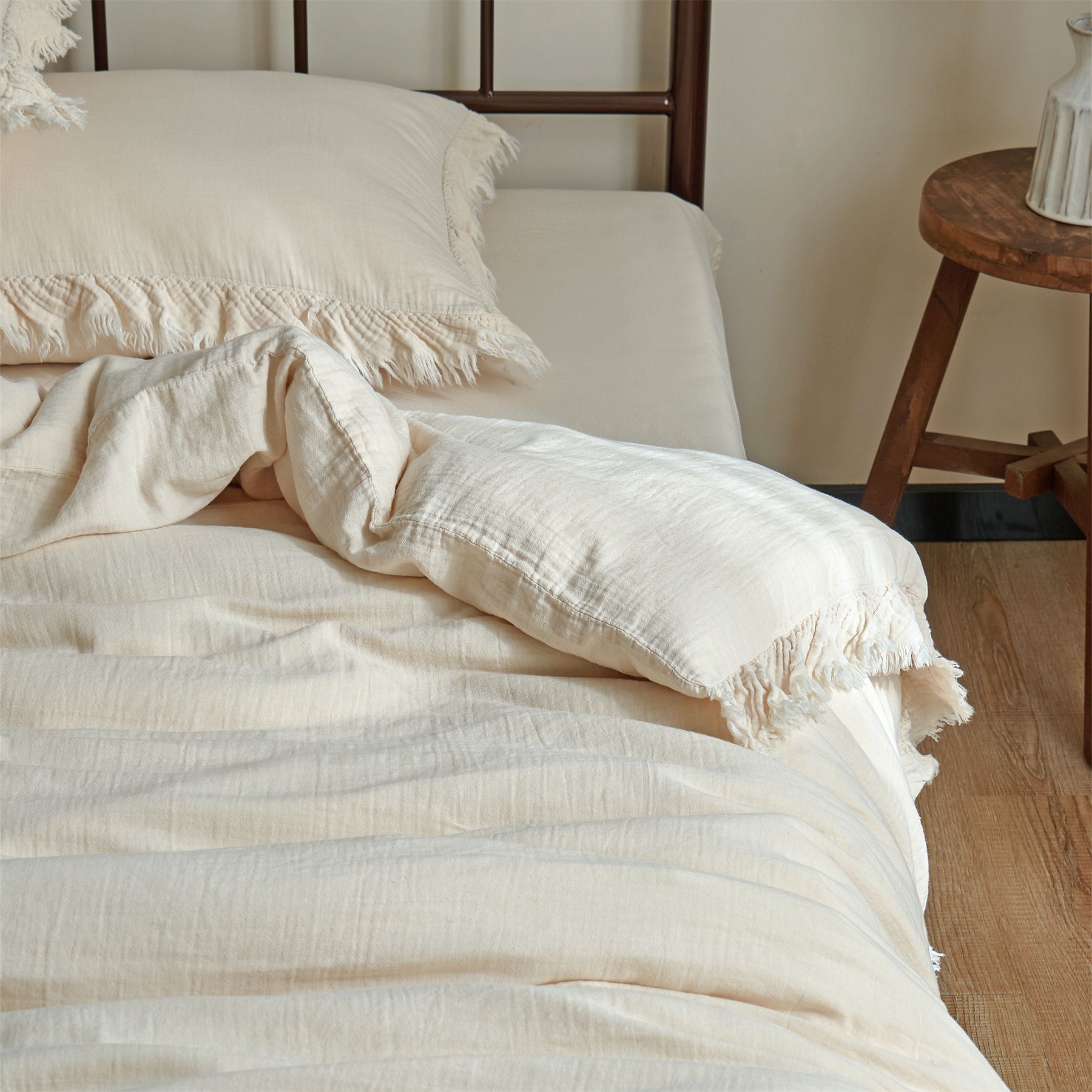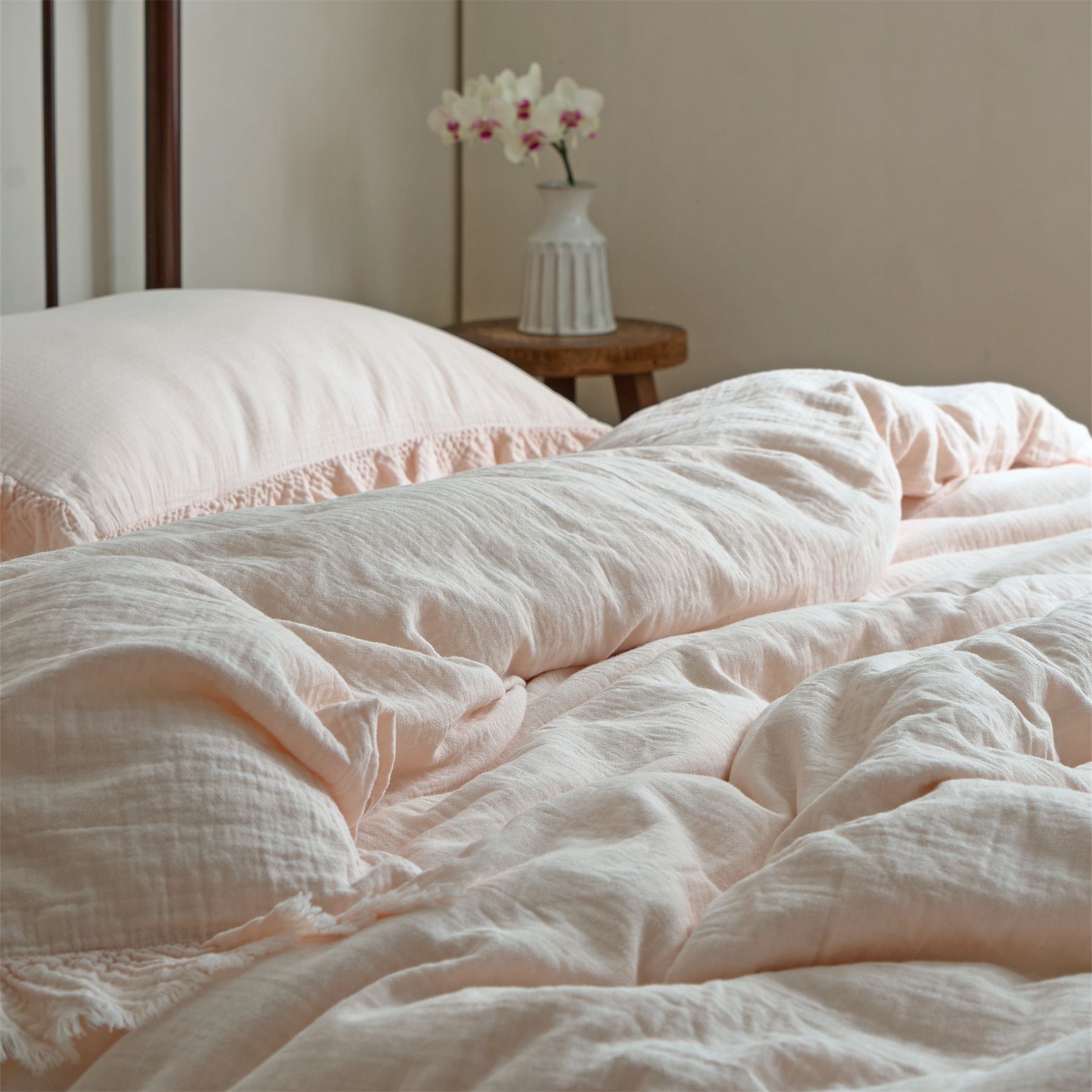 被套包括反面、枕套都是双层纱,床单采用的加密平纹,杜绝双层纱面料做床单有可能会起球的隐患,卖得更安心。