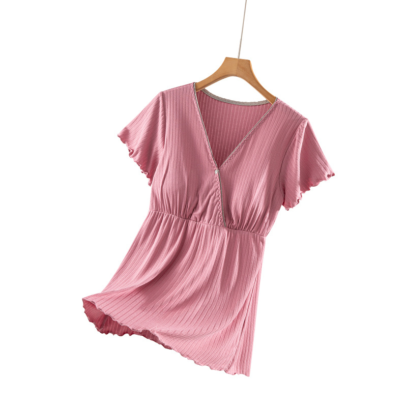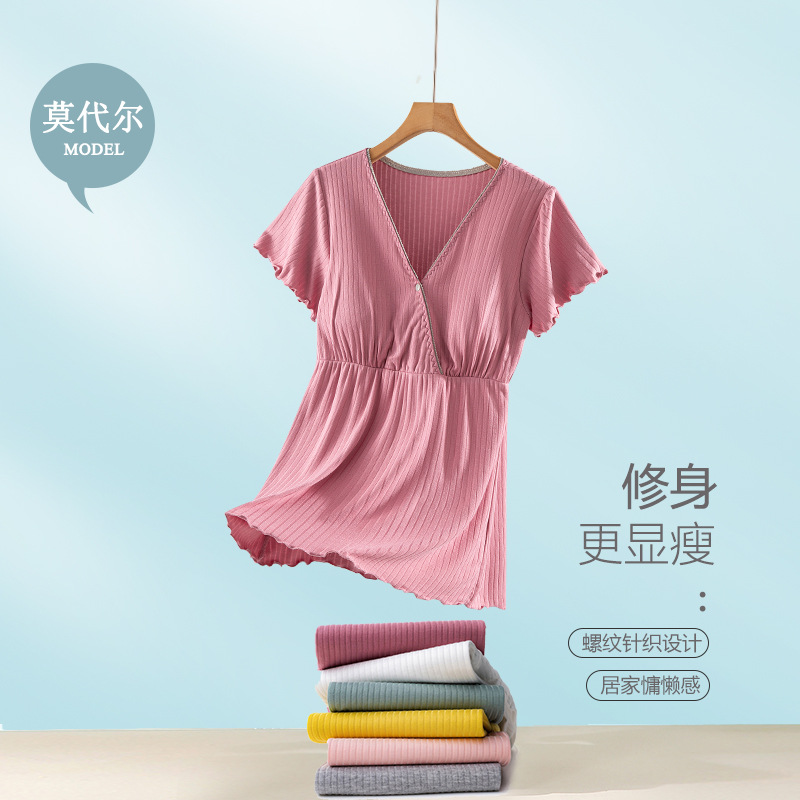 모달 반팔 수유복 잠옷, 속옷 불필요, 가슴 패드 포함, 산후복, 임신 중 및 산후 얇은 임산부복