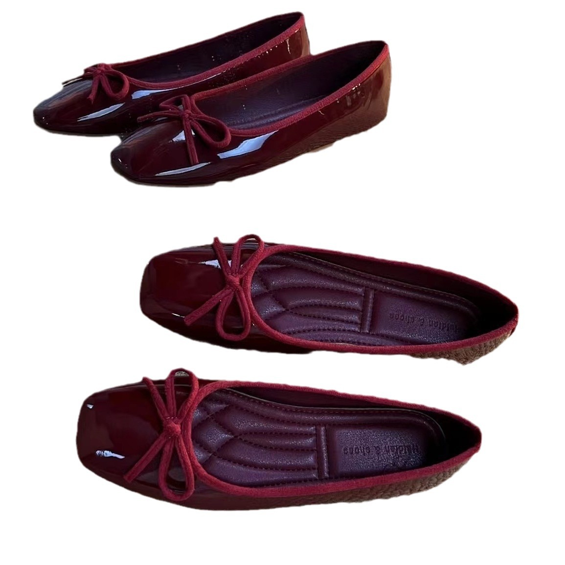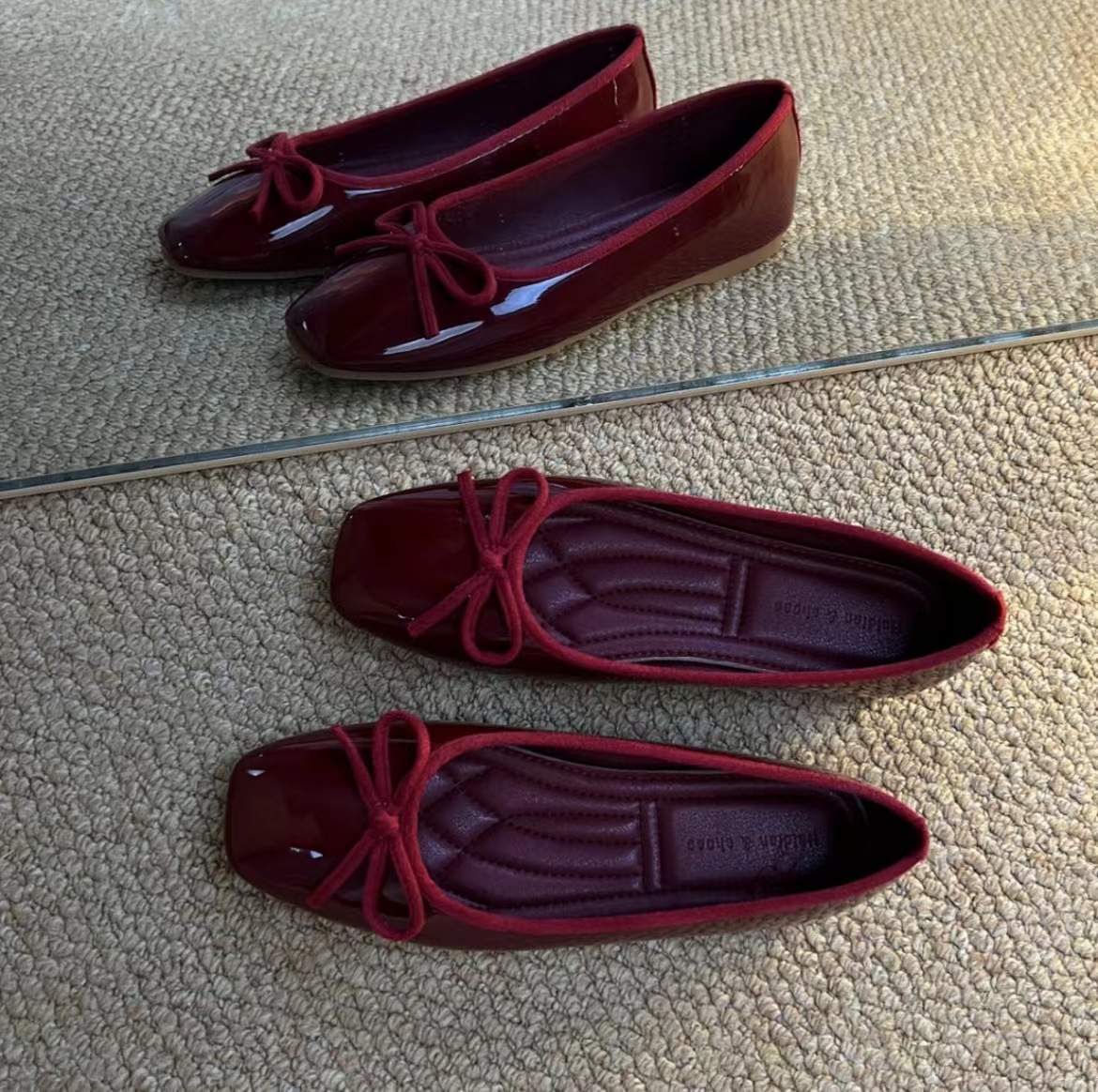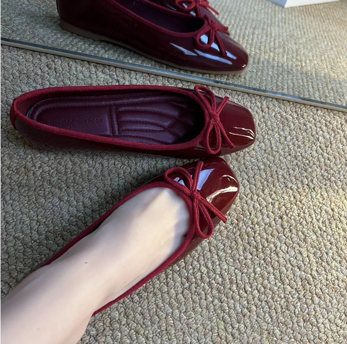 양가죽 버전 ~ 버건디 활 신발 여성의 봄/여름 2024 새로운 흰색 사각형 머리 통근 롤 플랫 신발