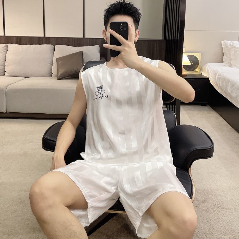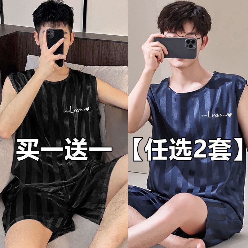 아이스 실크 파자마 남성 여름 플러스 사이즈 초박형 민소매 반바지 빠른 건조 얇은 간단한 홈 의류 캐주얼 투피스 세트