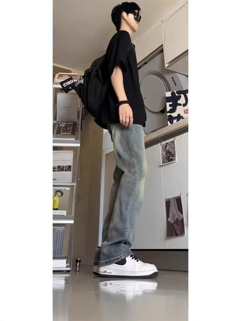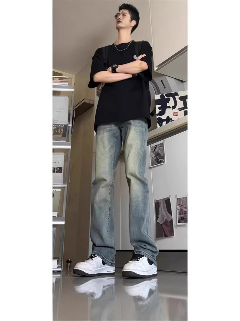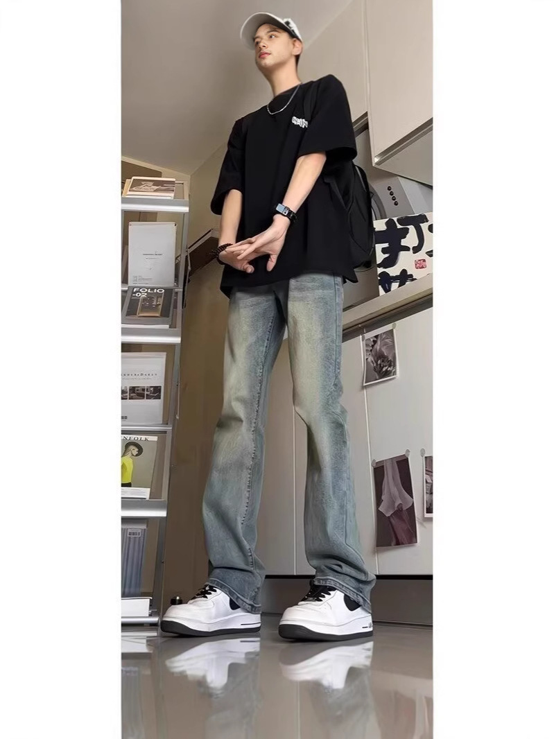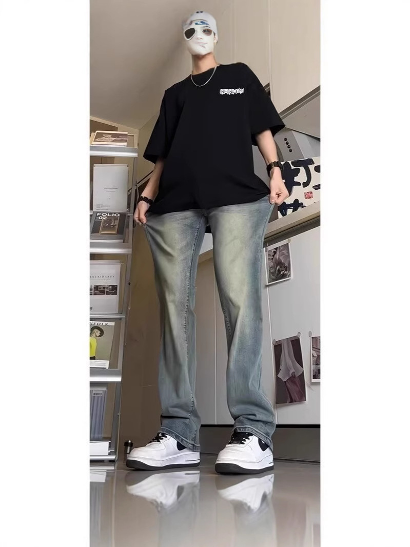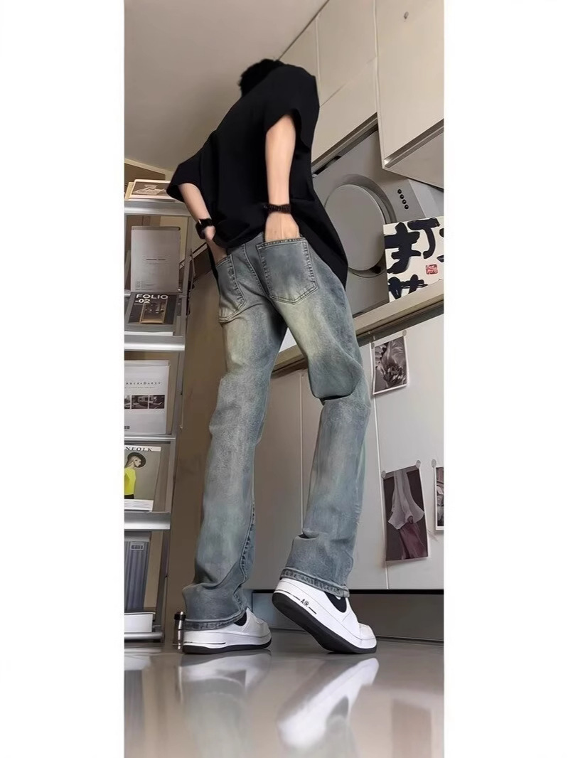 빈티지 블루 좁은 슬림 핏 청바지 남성 여름 빈티지 세탁 미국 바지 높은 허리 슬림 핏 바지