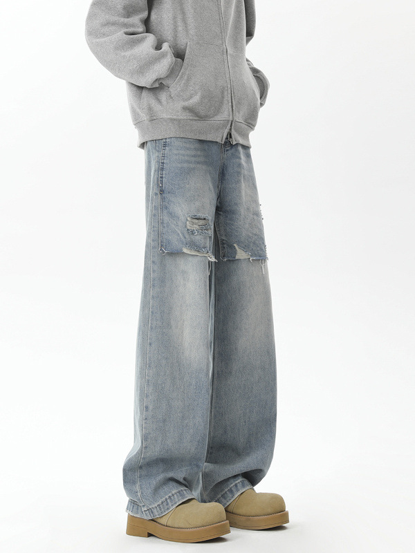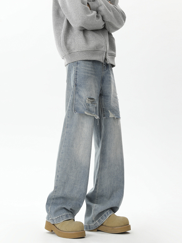 씻은 찢어진 가짜 2 조각 스티칭 디자인 청바지 남성과 여성의 2024 가을 복고풍 오래된 넓은 다리 바지