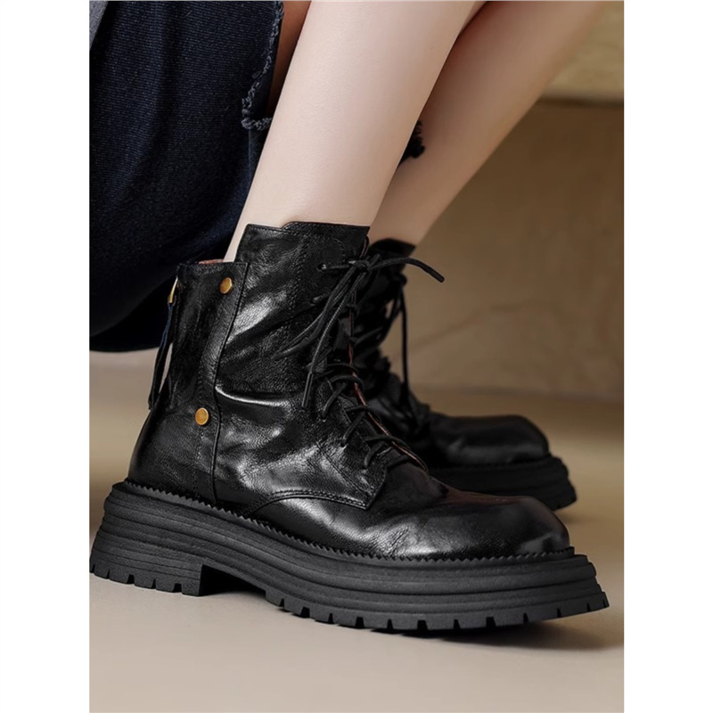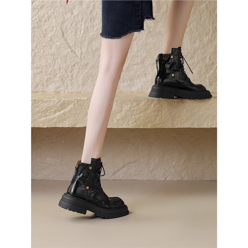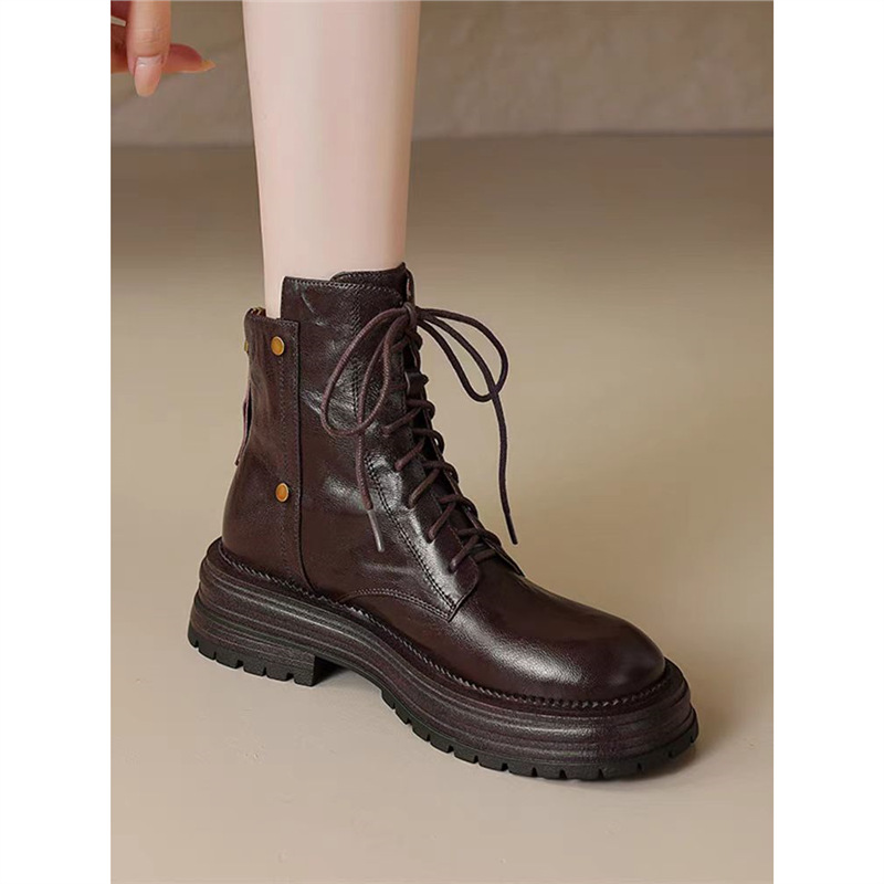 핸드 헬드 양가죽 다크 브라운 두꺼운 밑창 짧은 부츠 2024 년 초가을과 겨울 새로운 라운드 헤드 영국 스타일의 마틴 부츠 여성 싱글 부츠