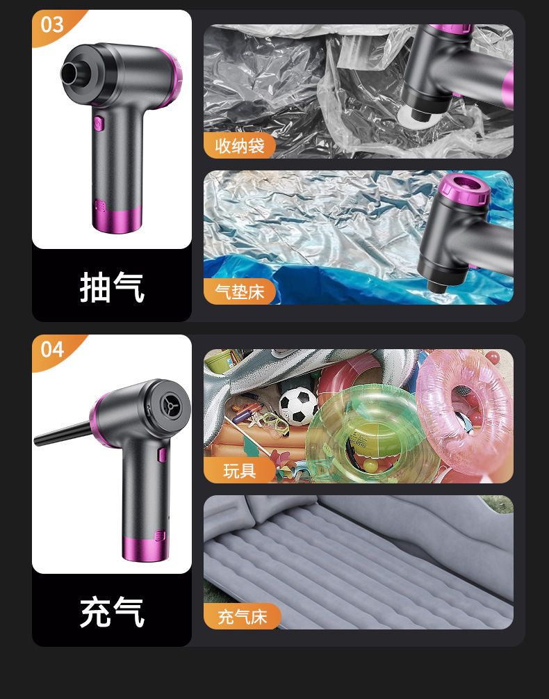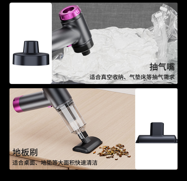 【包装清单】:附件:扁毛刷 圆毛刷 扁吸嘴 地板刷 电池包 抽气嘴 吹气嘴 充电线