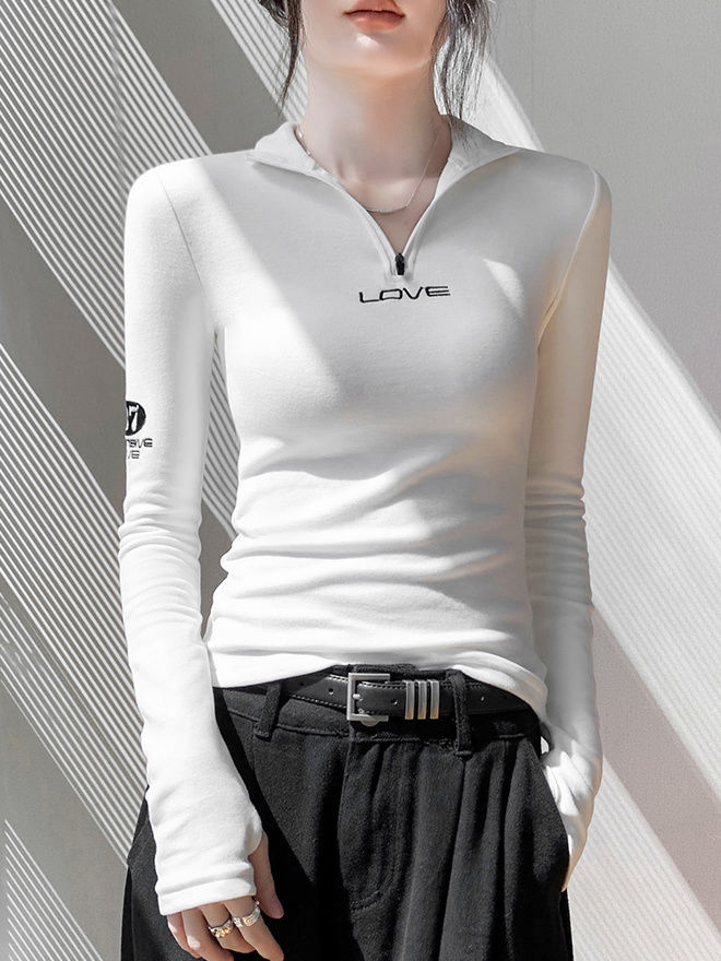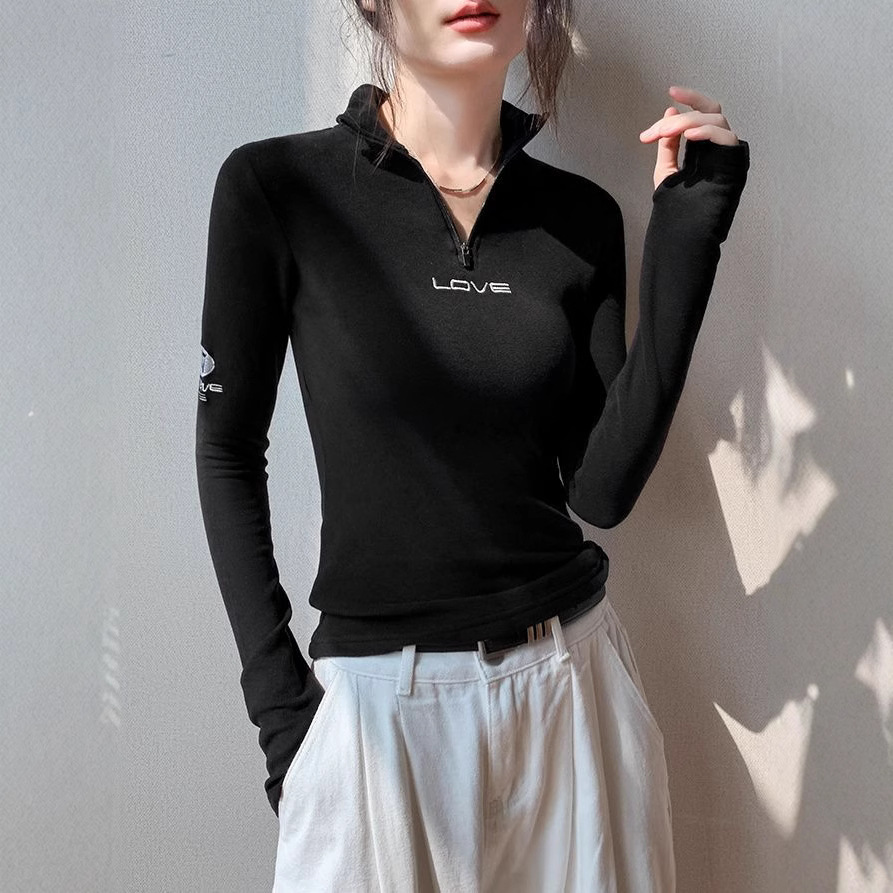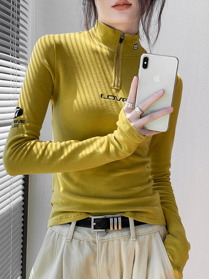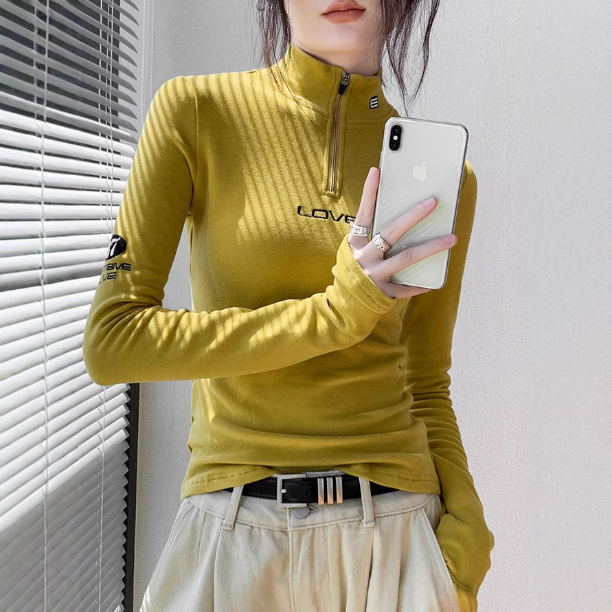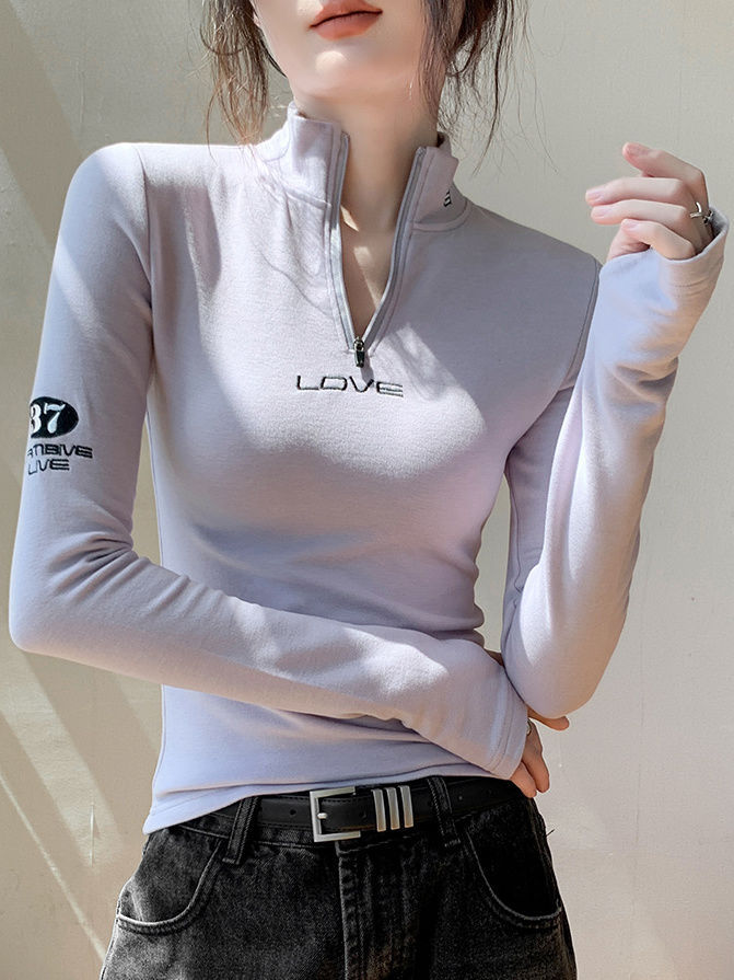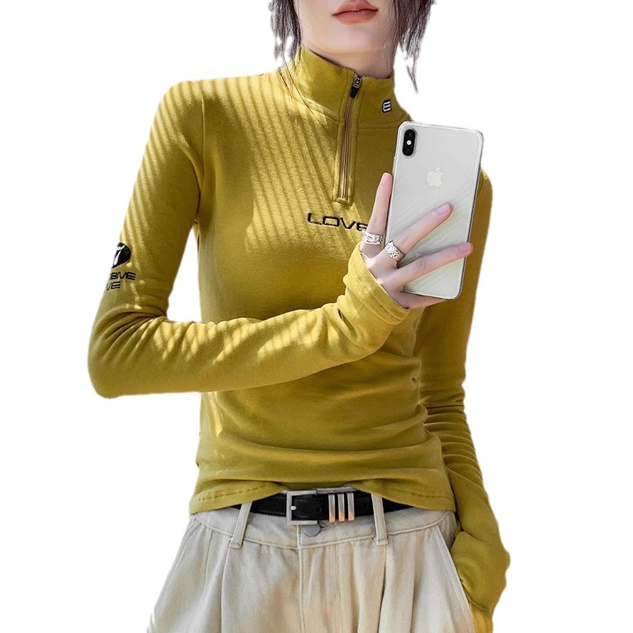양면 벨벳 지퍼 세미 하이 칼라 긴팔 티셔츠 여성용 2025 년 봄과 가을 새로운 슬림 핏 슬림 따뜻한 재킷