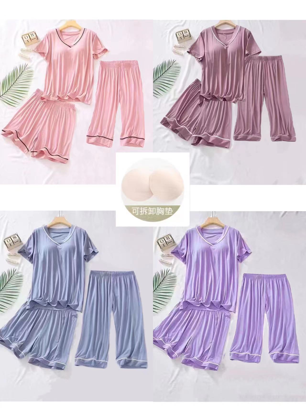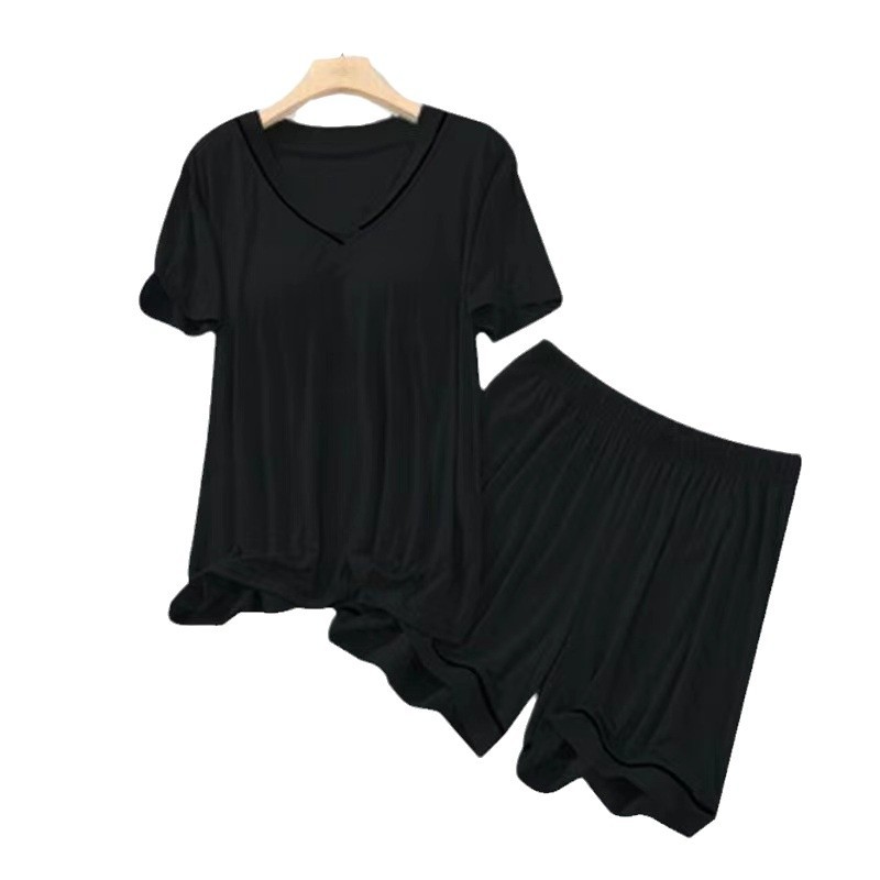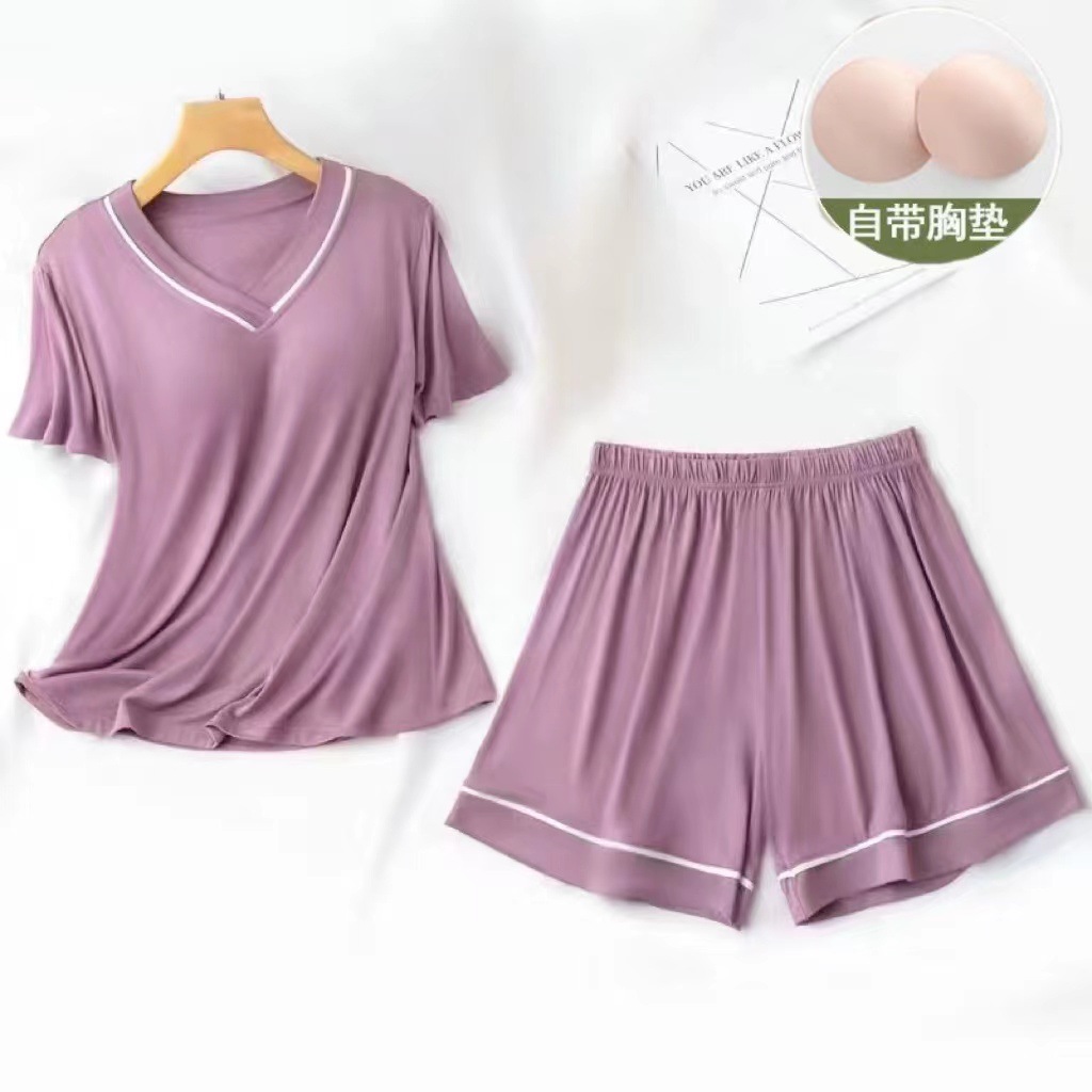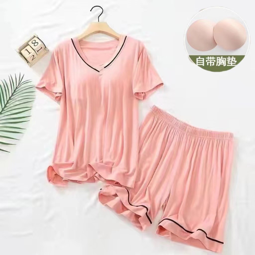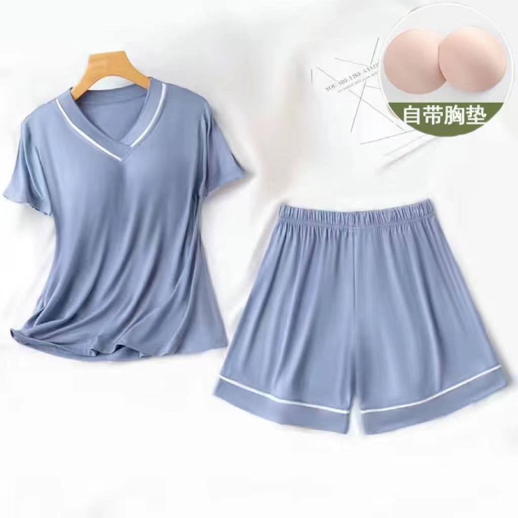 파자마 여성 여름 반팔 반바지 가슴 패드 V 넥 솔리드 컬러 루즈 캐주얼 쿨 국경 해외 무역 라이브 세트