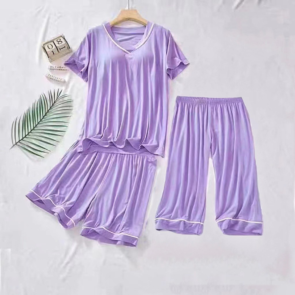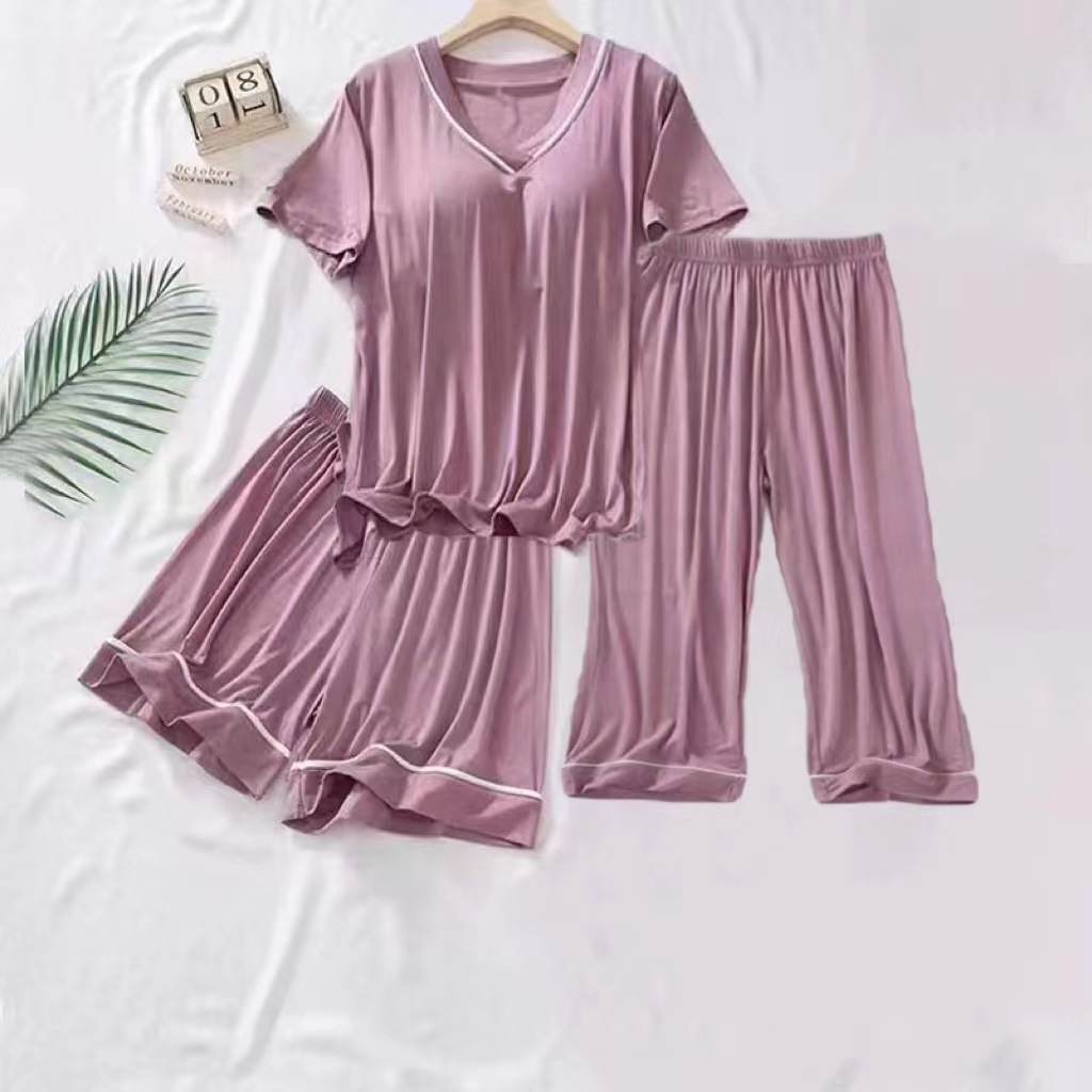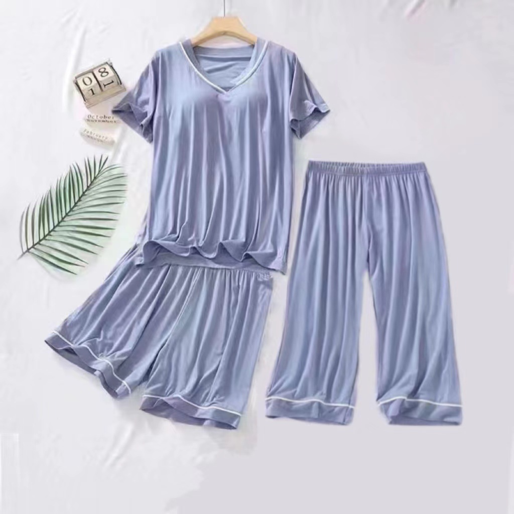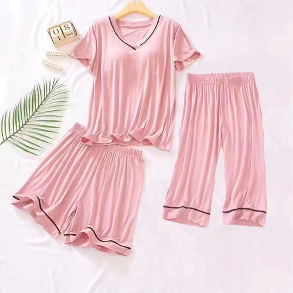 파자마 여성 여름 반팔 반바지 가슴 패드 V 넥 솔리드 컬러 루즈 캐주얼 쿨 국경 해외 무역 라이브 세트