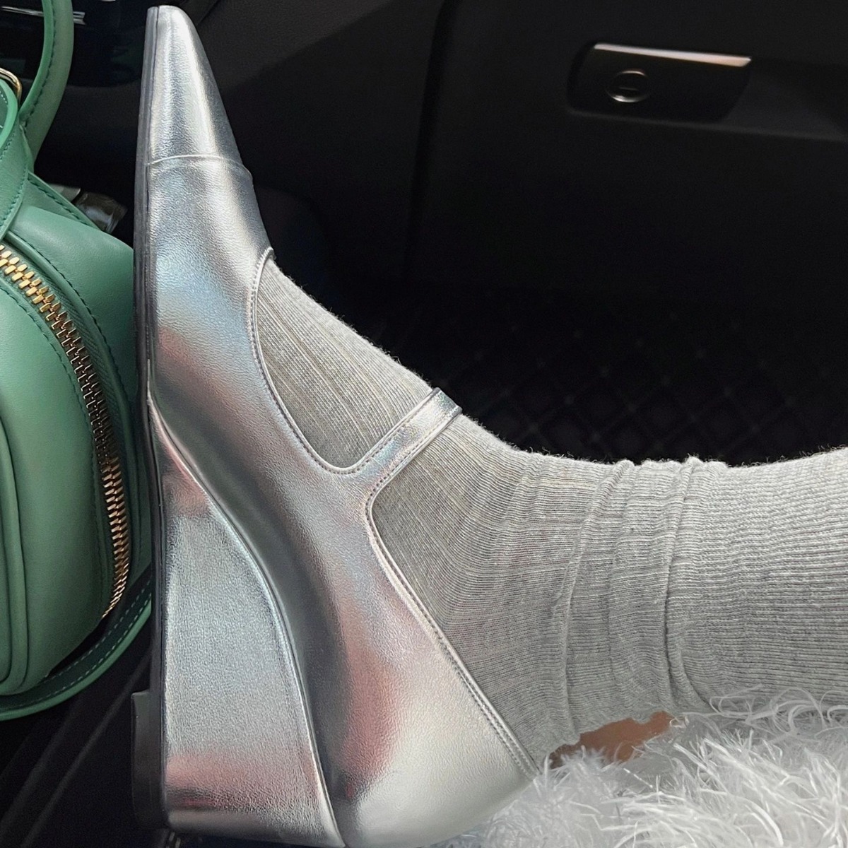 진짜 가죽 실버 프랑스 틈새 버클 스트랩 청키 힐 웨지 뾰족한 메리 제인 신발 여성의 봄과 여름 하이힐