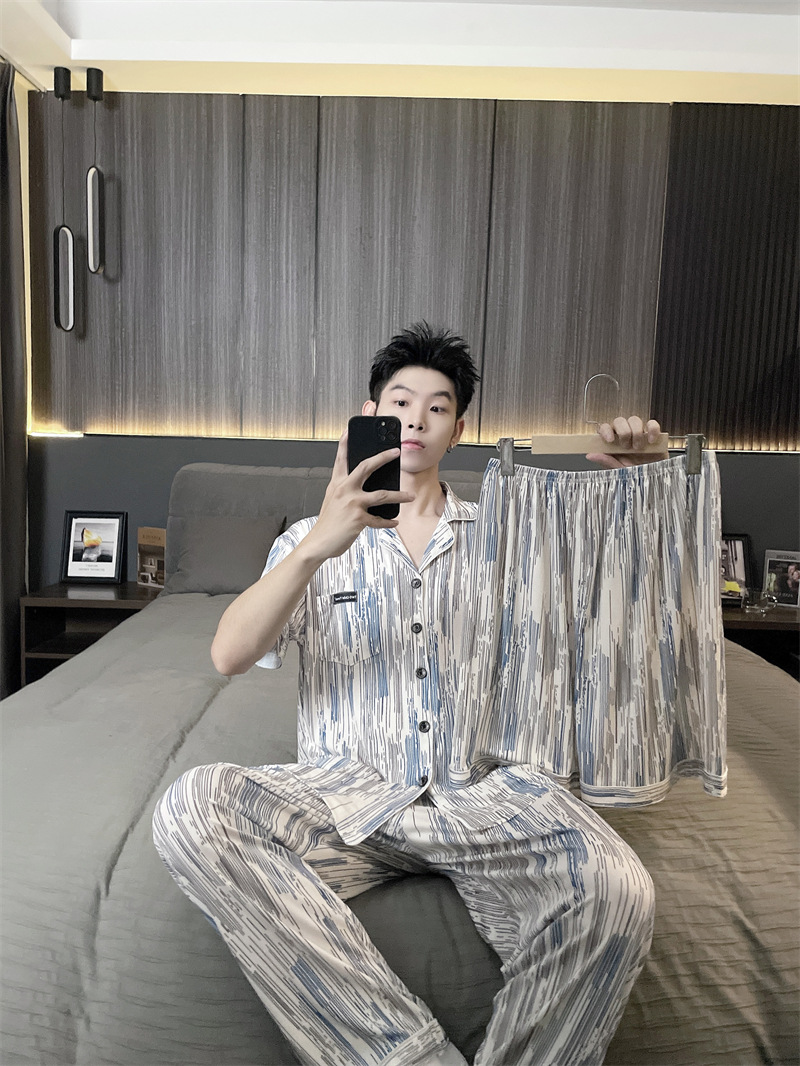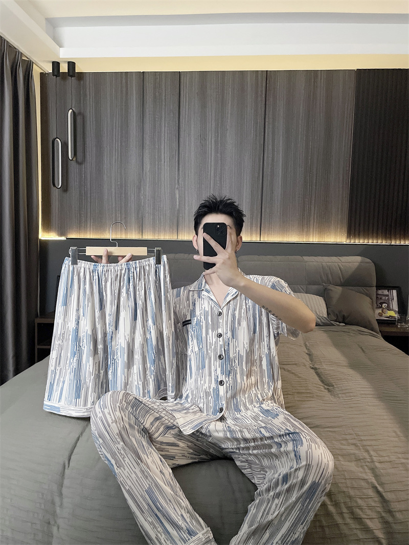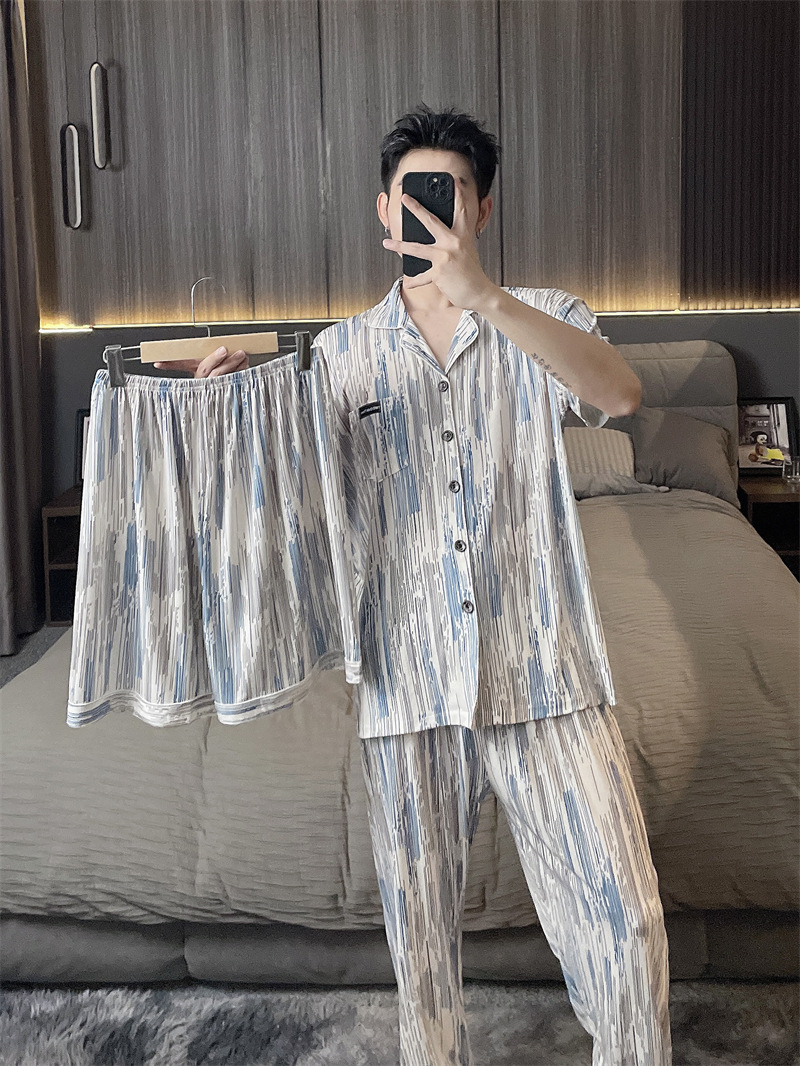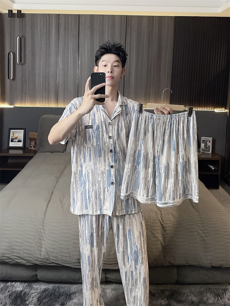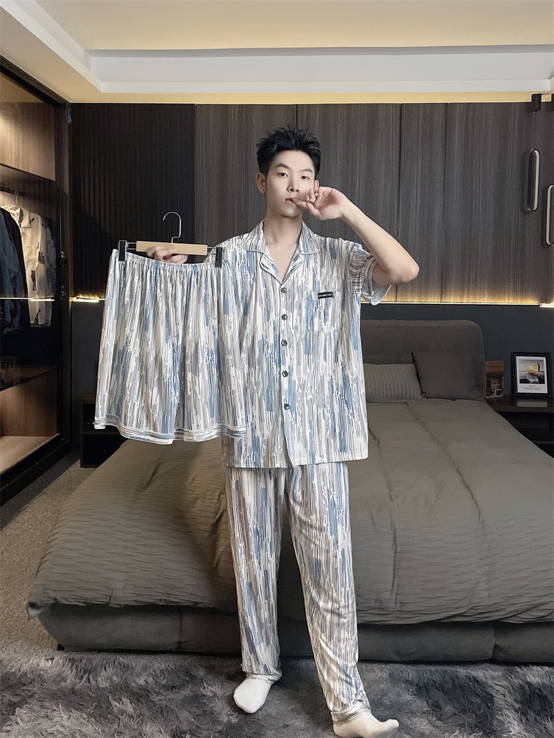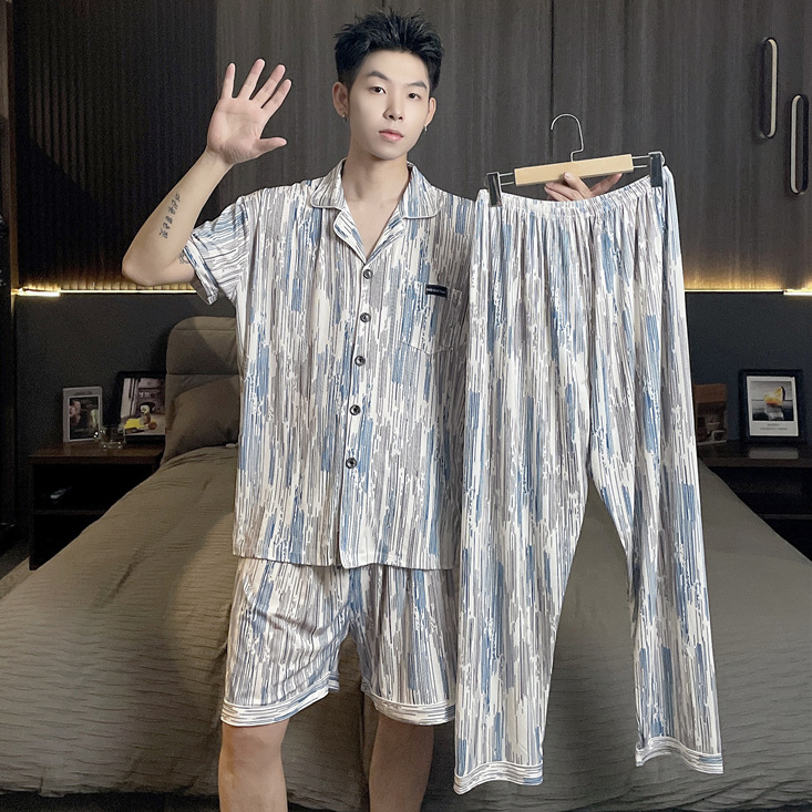 아이스 실크 파자마 남성 3 종 봄과 여름 카디건 반바지 바지와 지방 플러스 사이즈 300kg 가정용 의류 세트