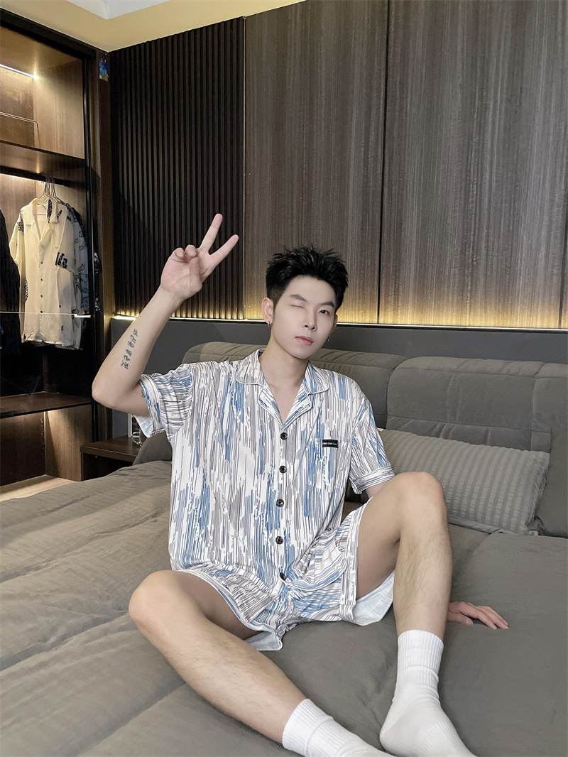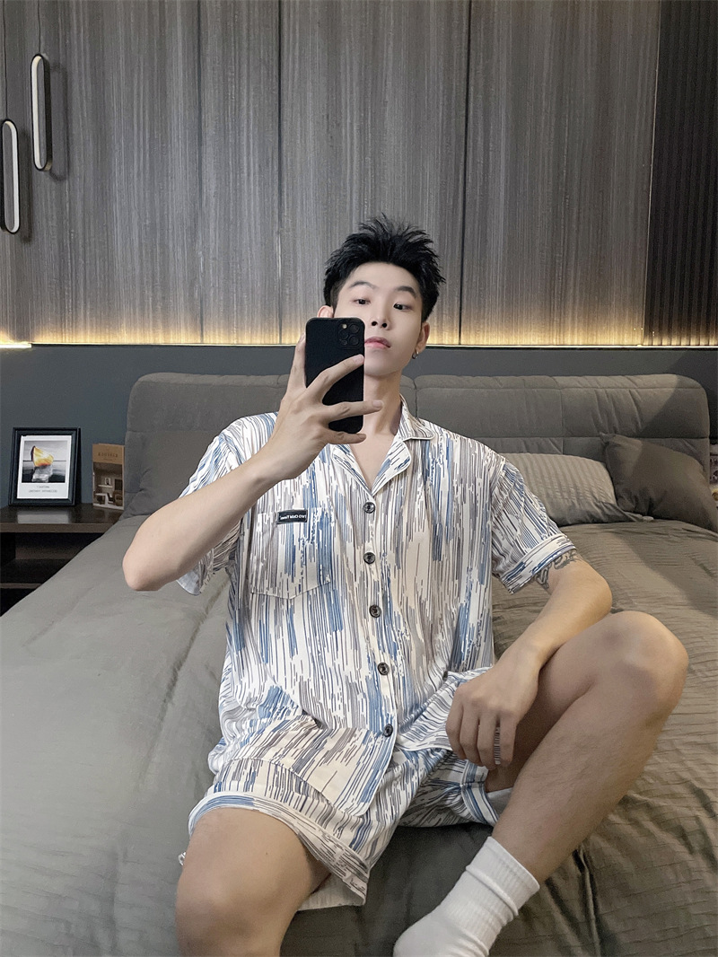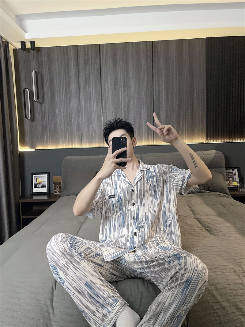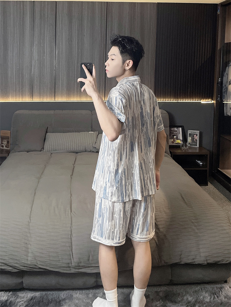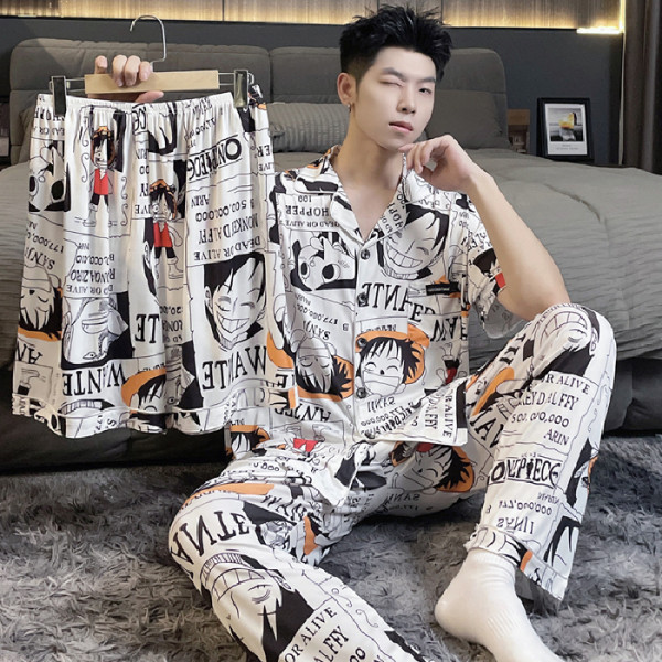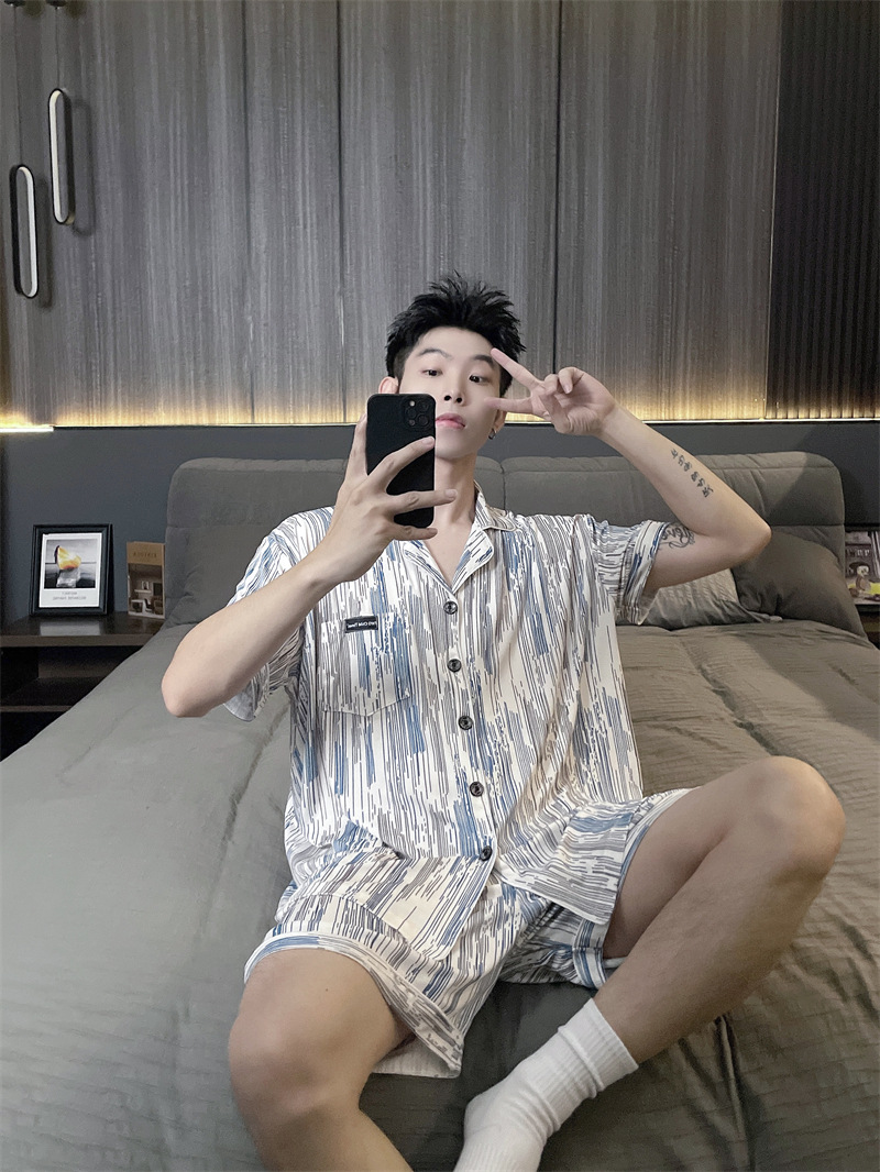 아이스 실크 파자마 남성 3 종 봄과 여름 카디건 반바지 바지와 지방 플러스 사이즈 300kg 가정용 의류 세트