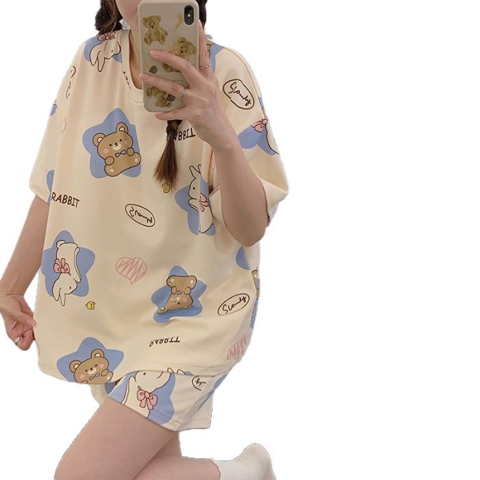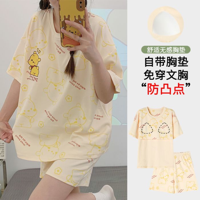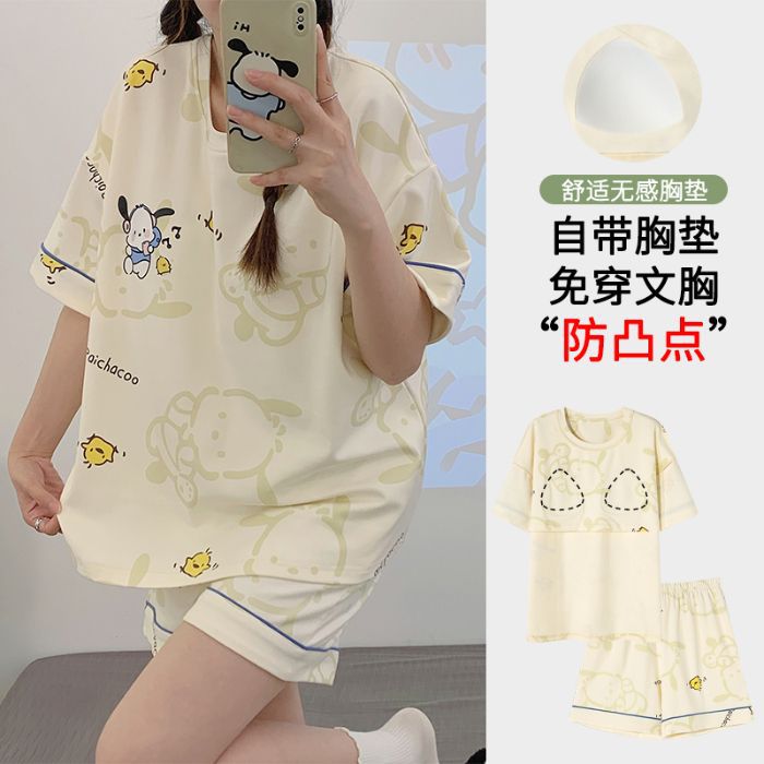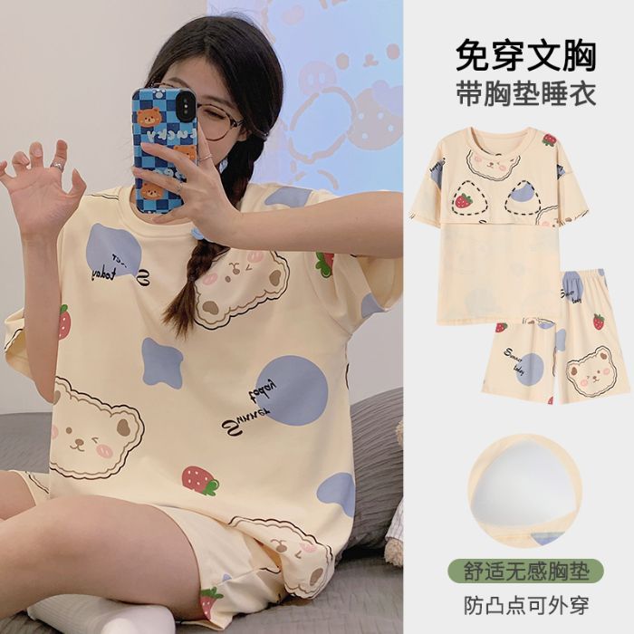 파자마 여성 여름 반팔 반바지 얇은 순수면 가슴 패드 홈 옷 만화 원피스 브래지어 속옷 세트